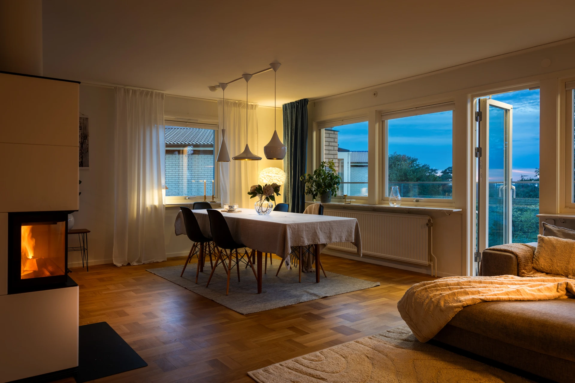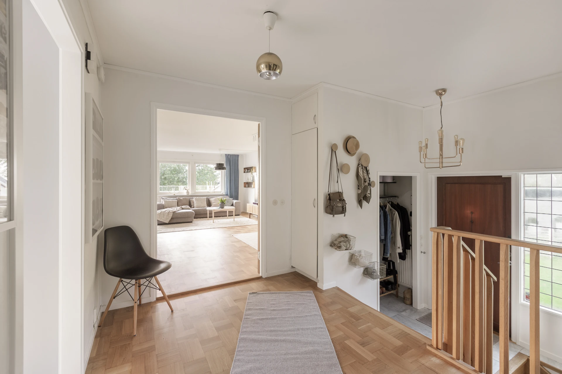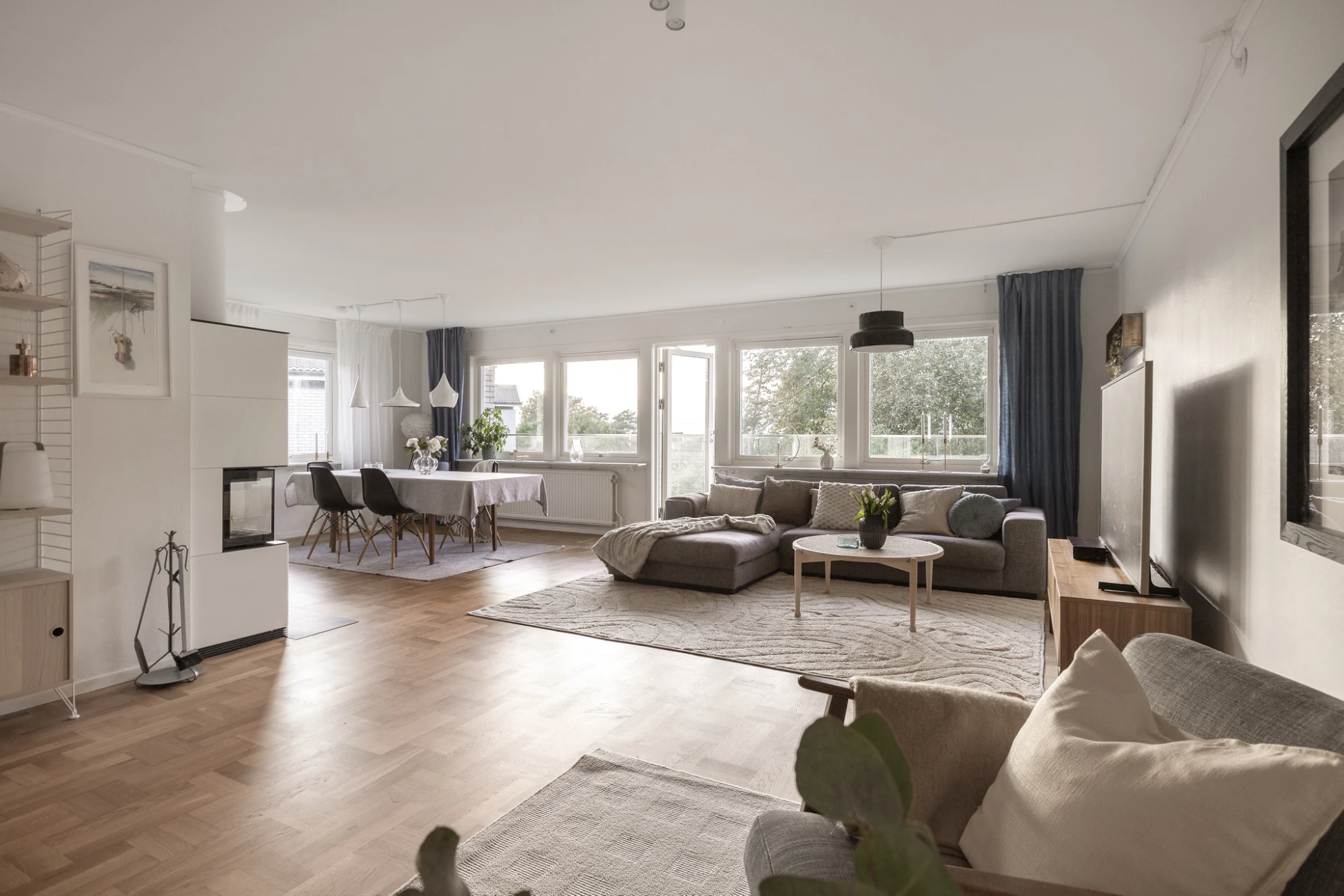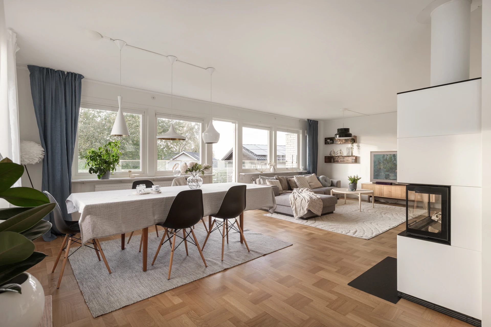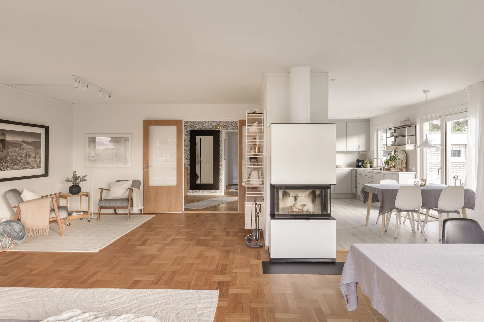 Ekparkett och vitmålade väggar, utgång till både altan och trädgård samt balkong i ljust läge. Plats för stor soffgrupp och matsalsmöbel. Kamin för extra mysfaktor.