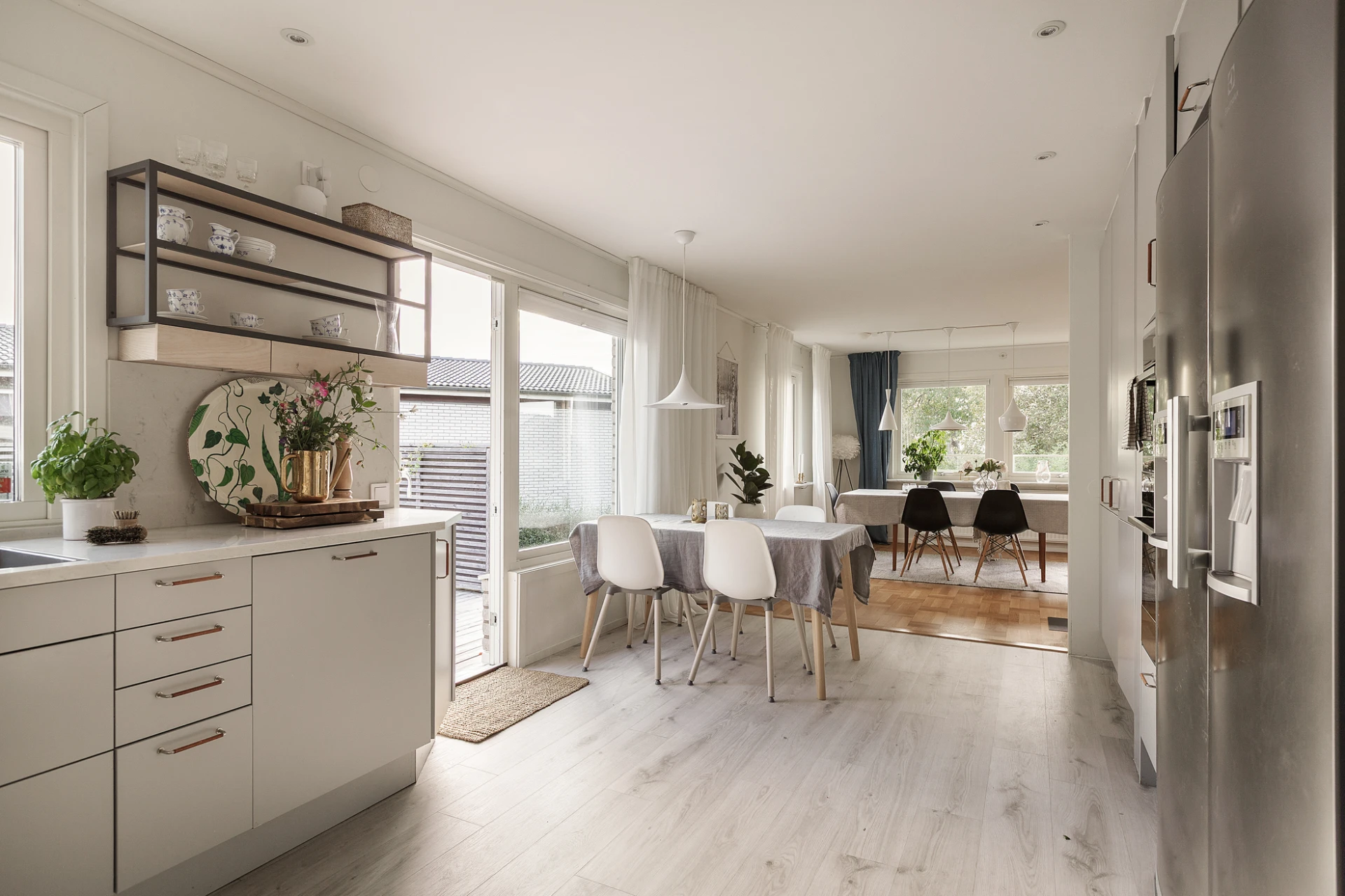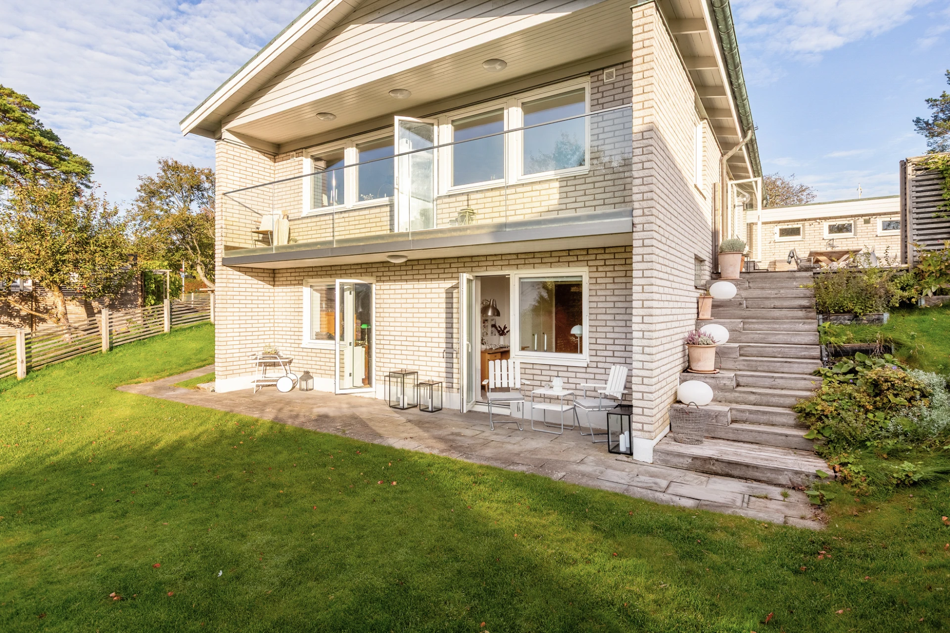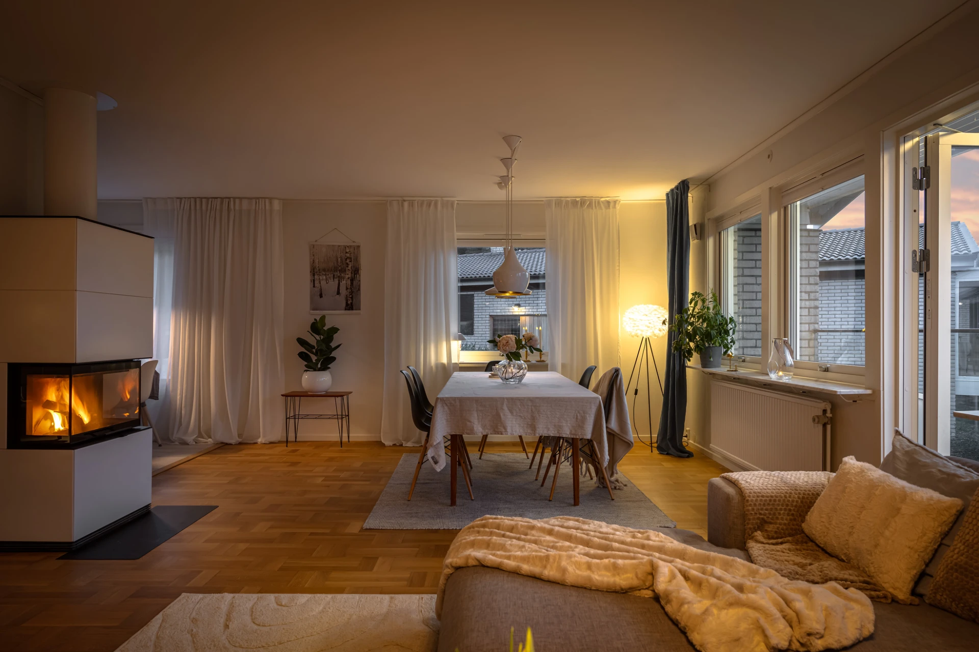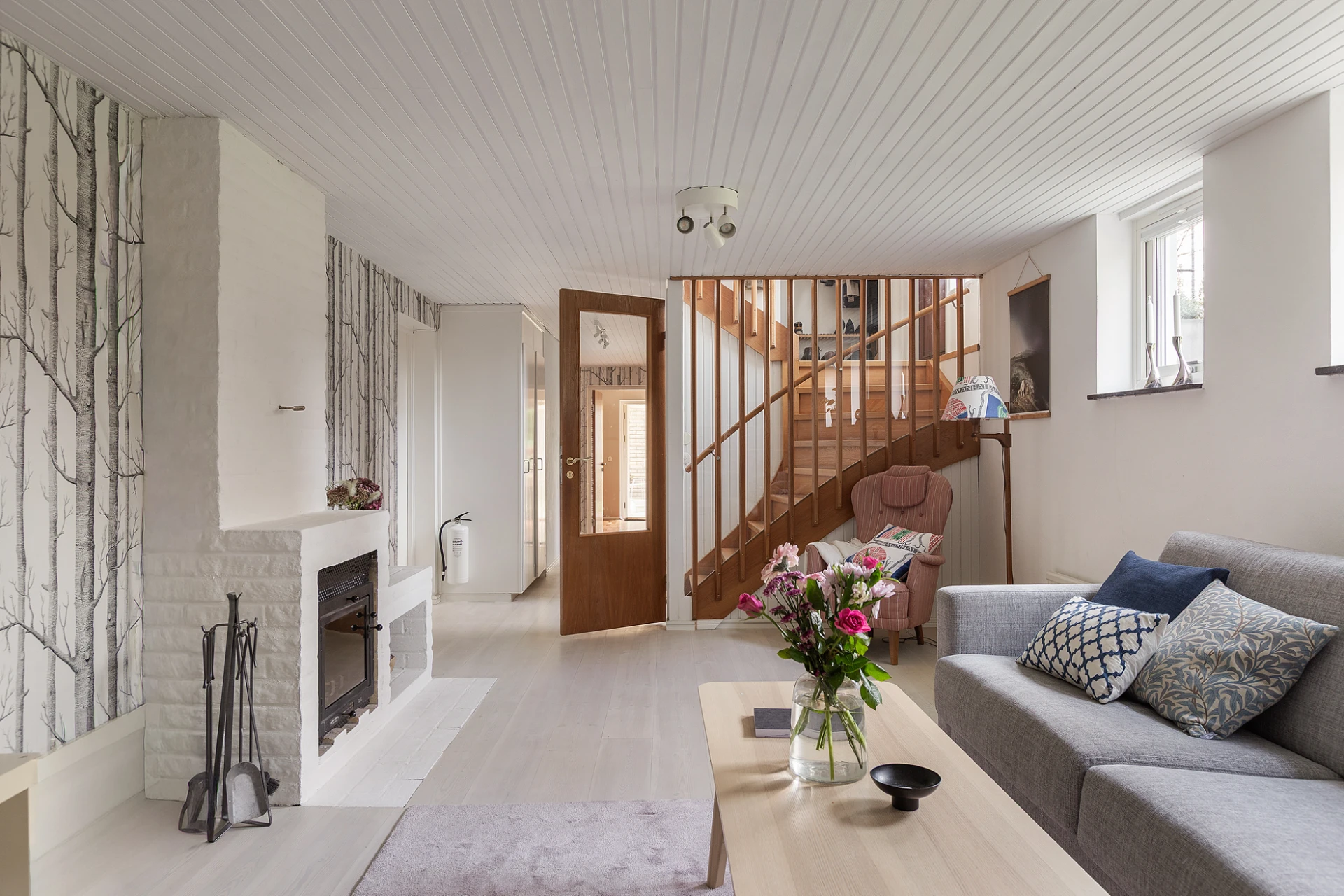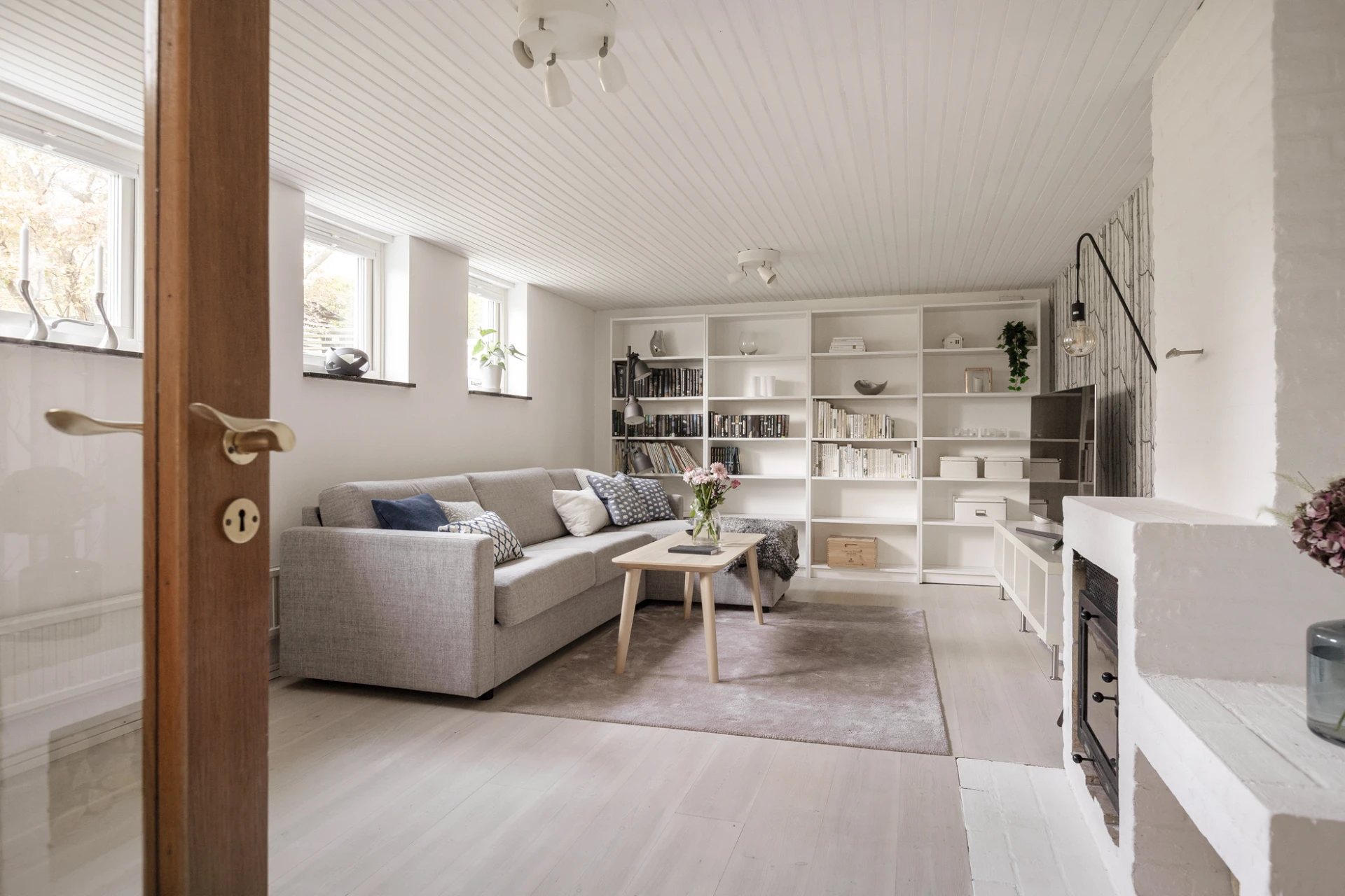 Ekparkett och vitmålade väggar, utgång till både altan och trädgård samt balkong i ljust läge. Plats för stor soffgrupp och matsalsmöbel. Kamin för extra mysfaktor.