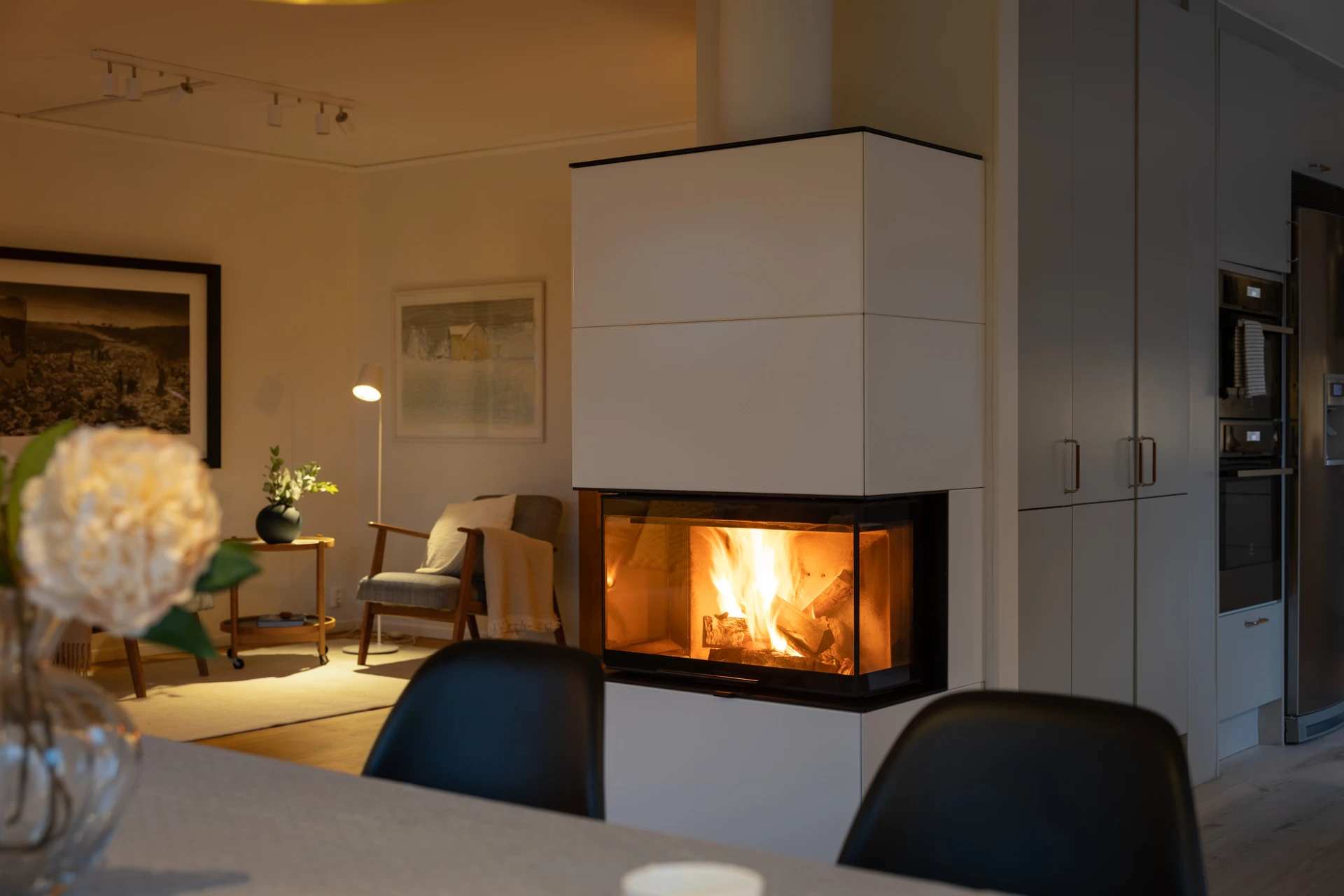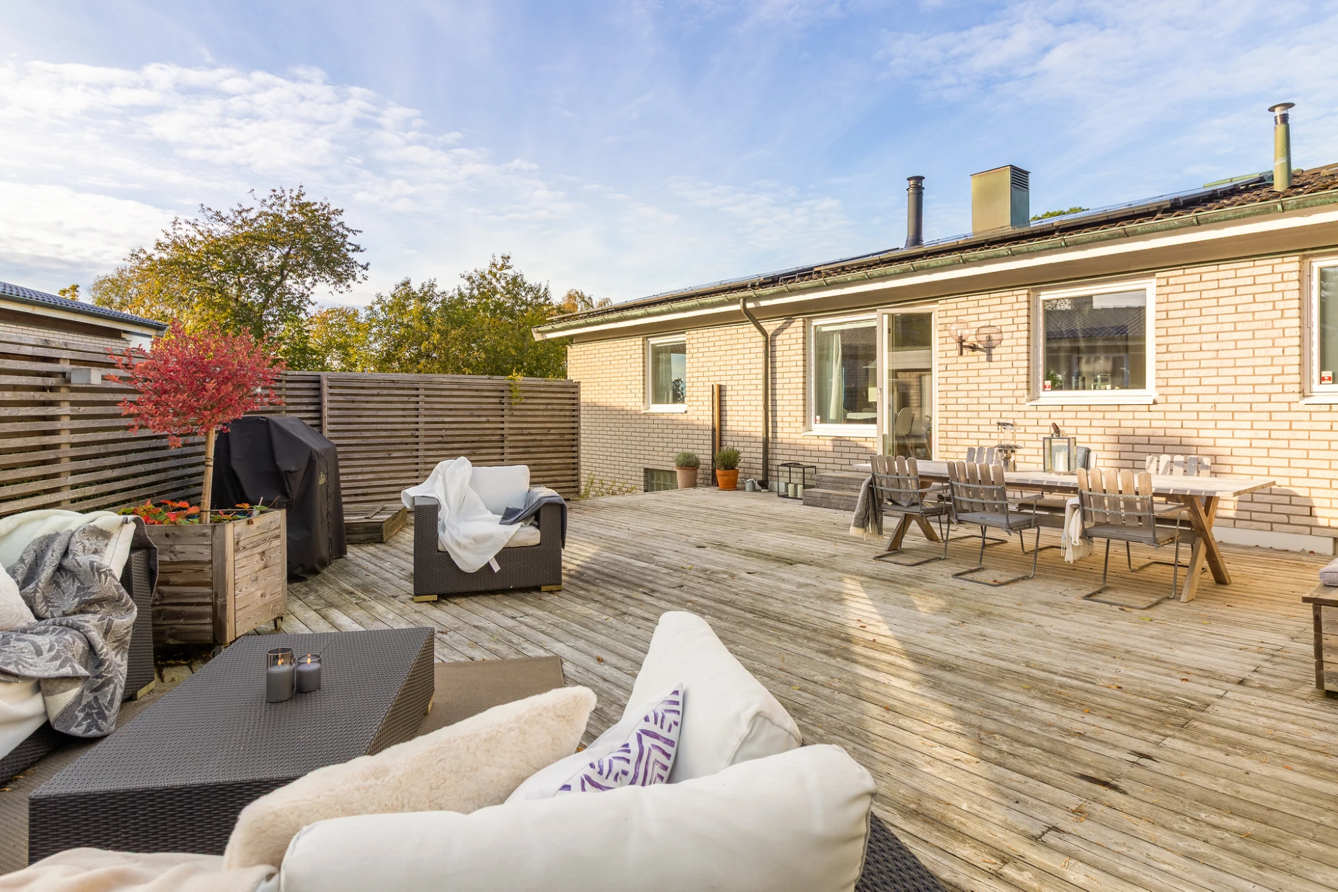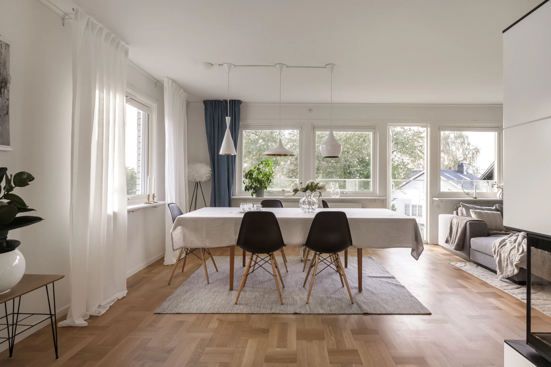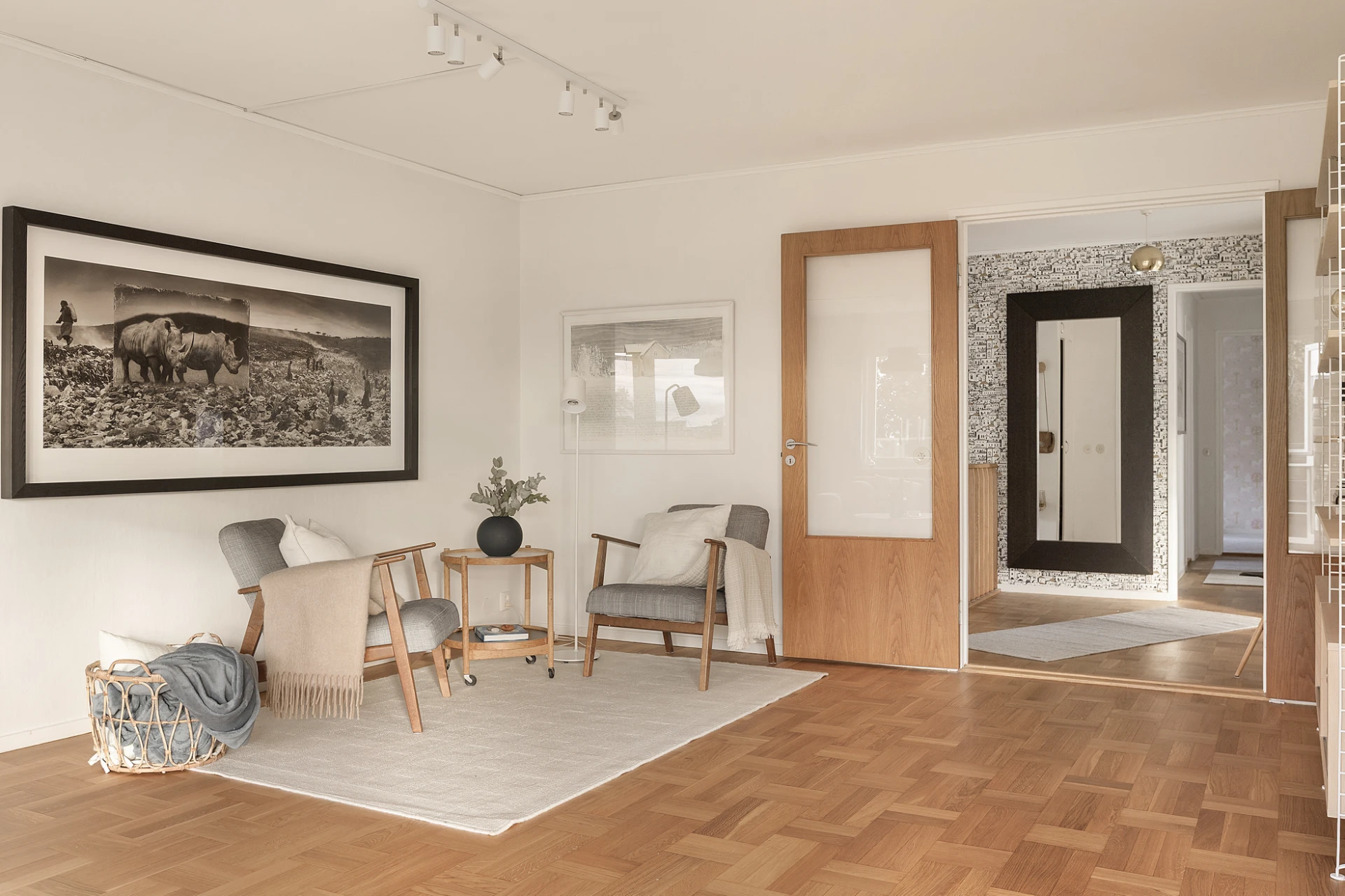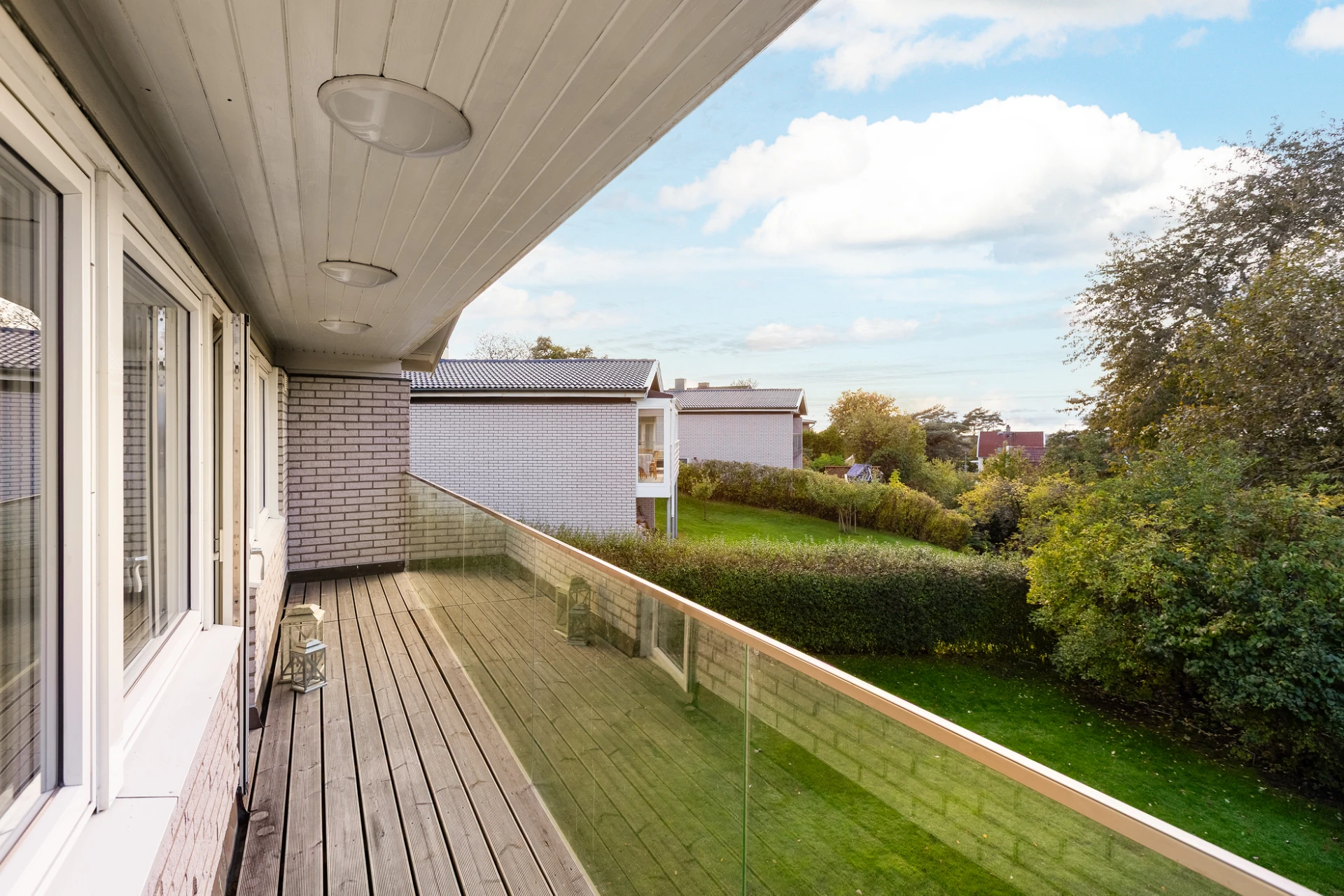 Ekparkett och vitmålade väggar, utgång till både altan och trädgård samt balkong i ljust läge. Plats för stor soffgrupp och matsalsmöbel. Kamin för extra mysfaktor.