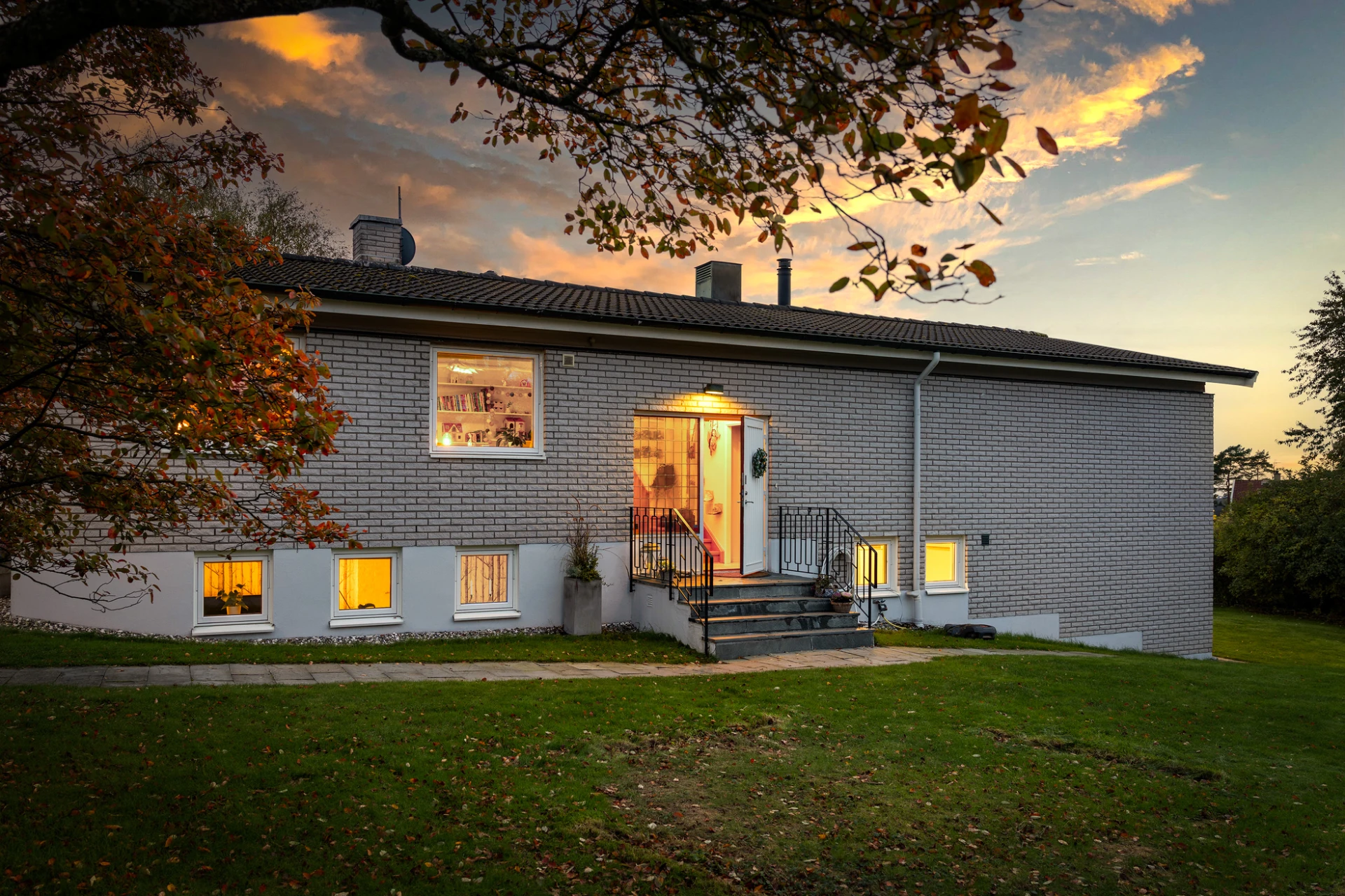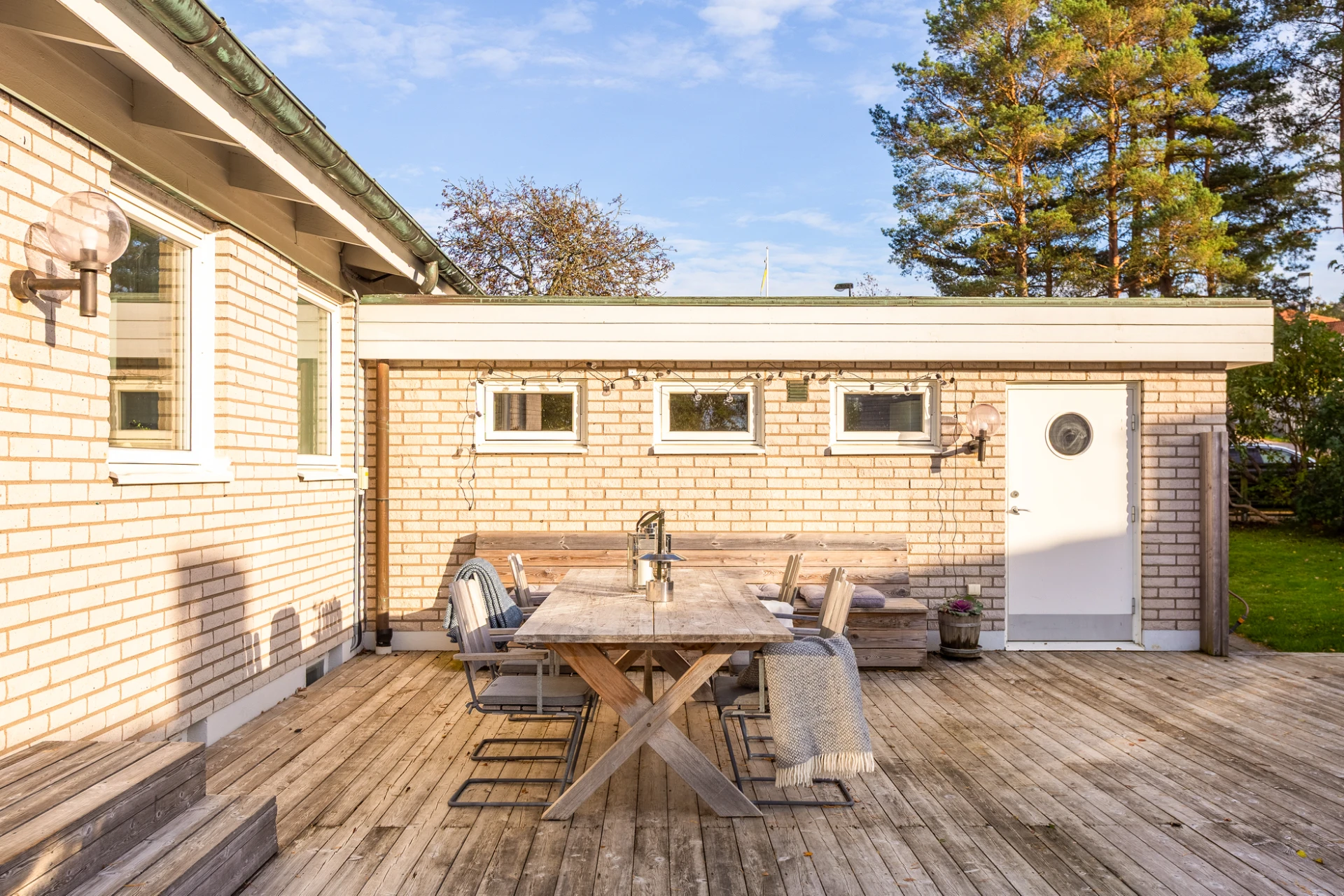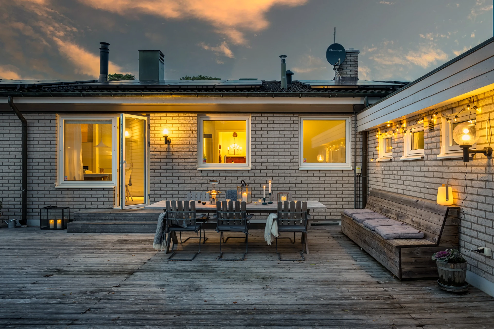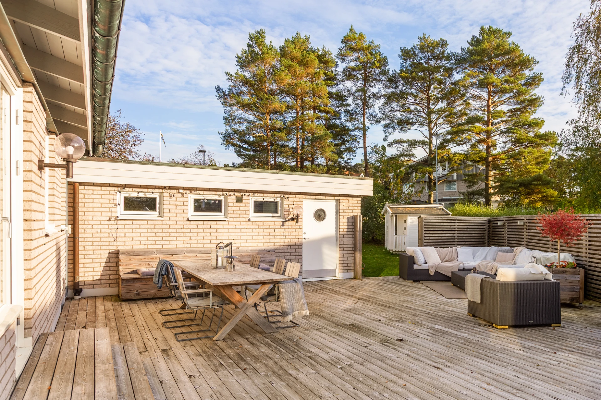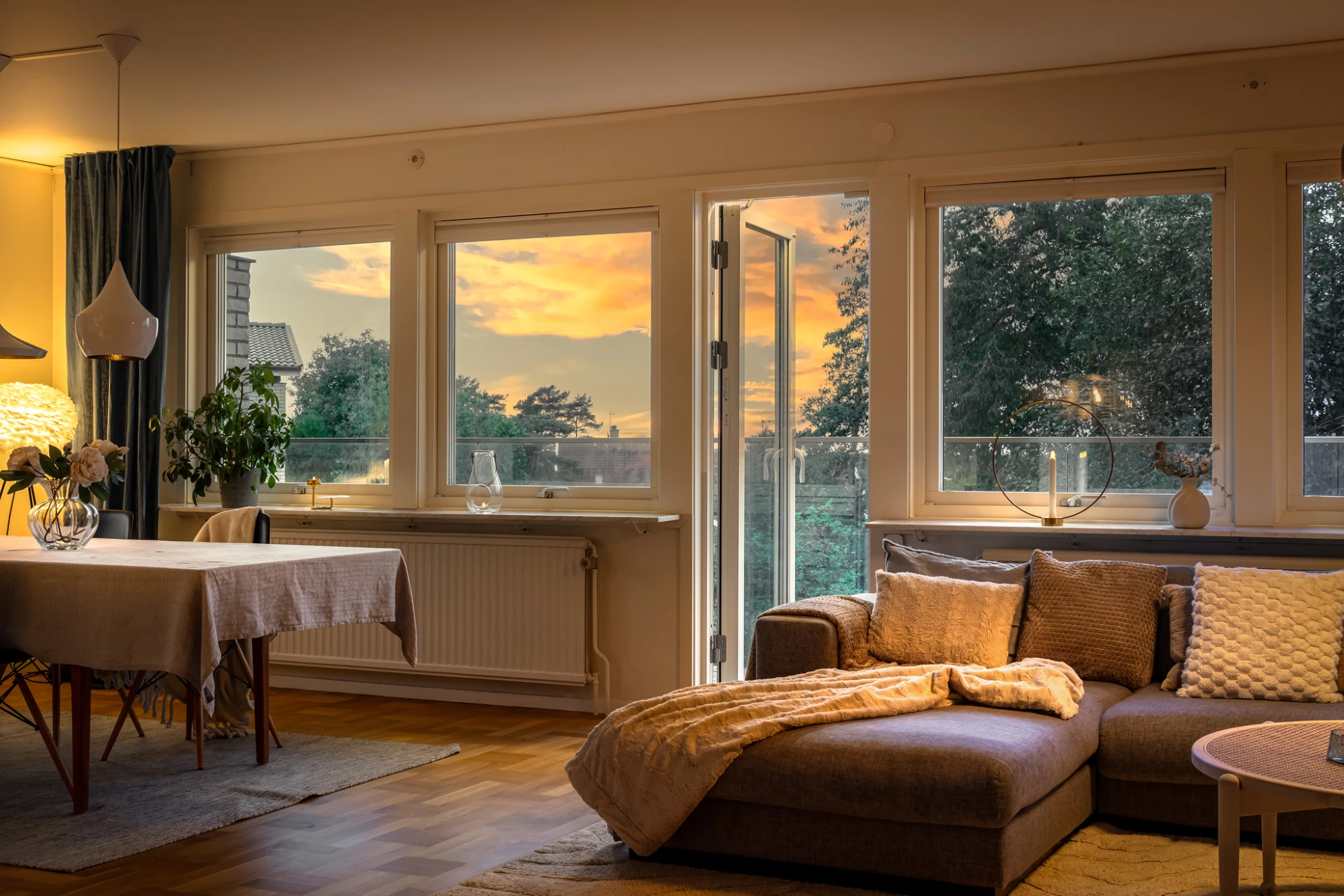 Ekparkett och vitmålade väggar, utgång till både altan och trädgård samt balkong i ljust läge. Plats för stor soffgrupp och matsalsmöbel. Kamin för extra mysfaktor.
