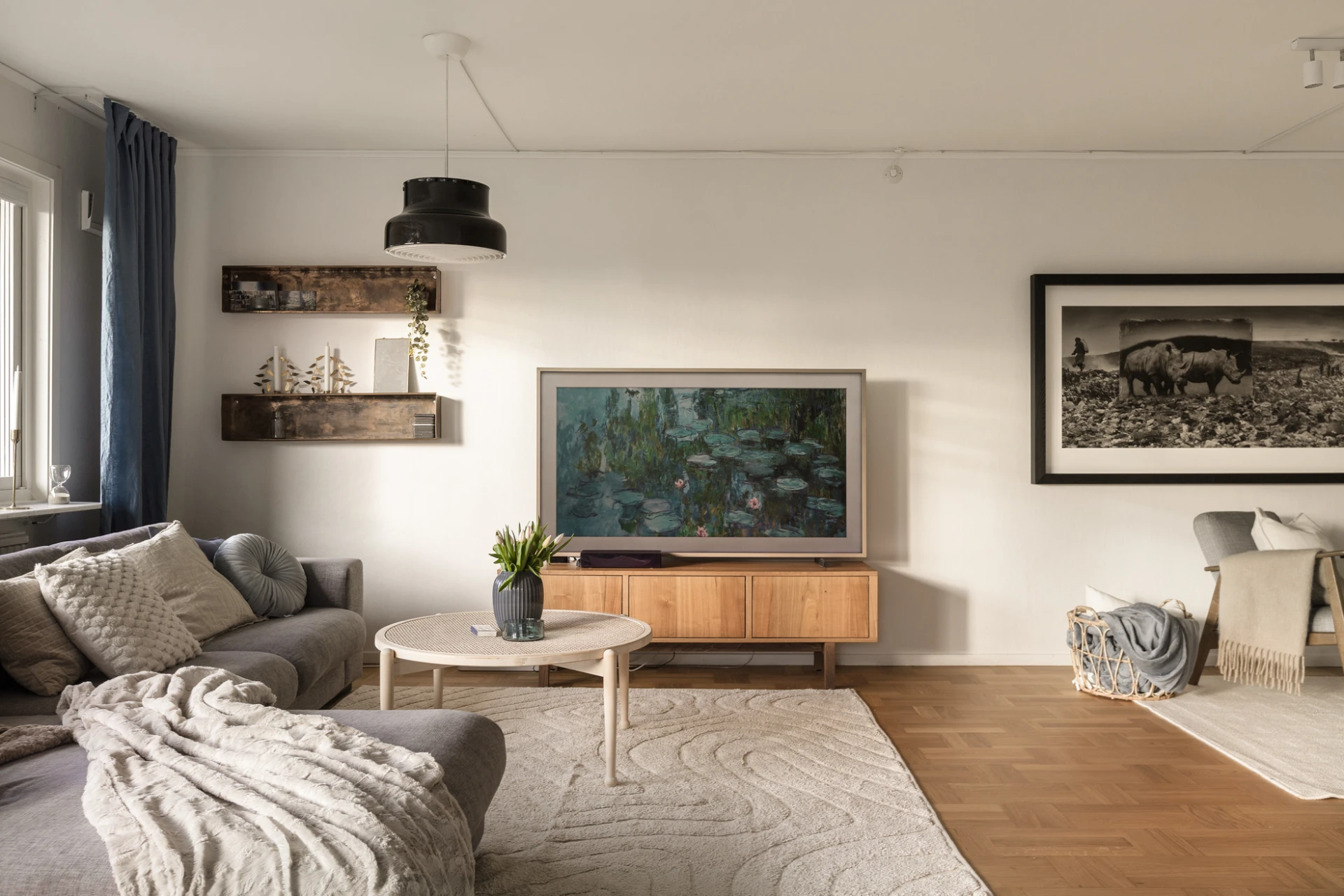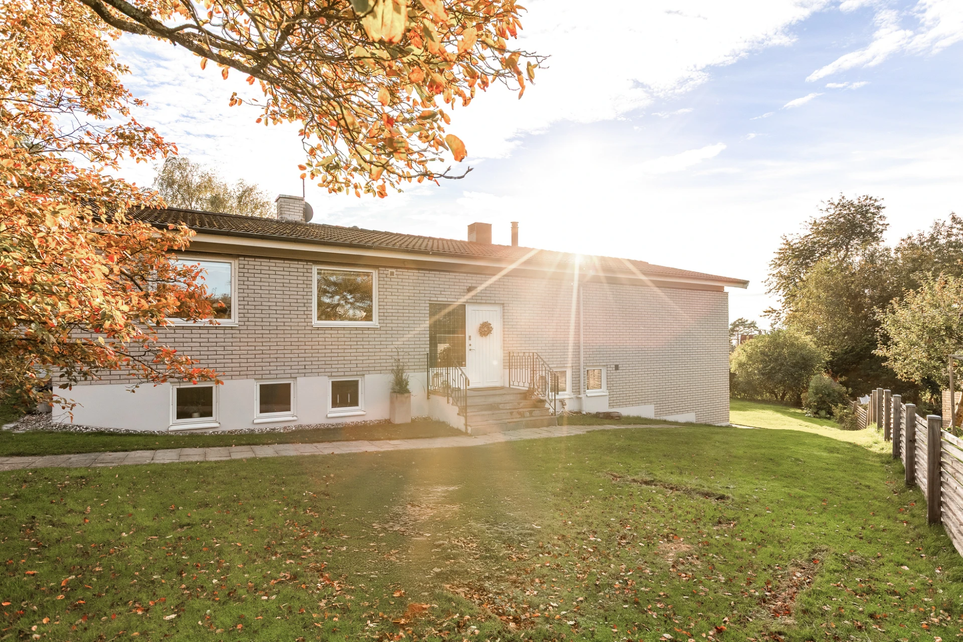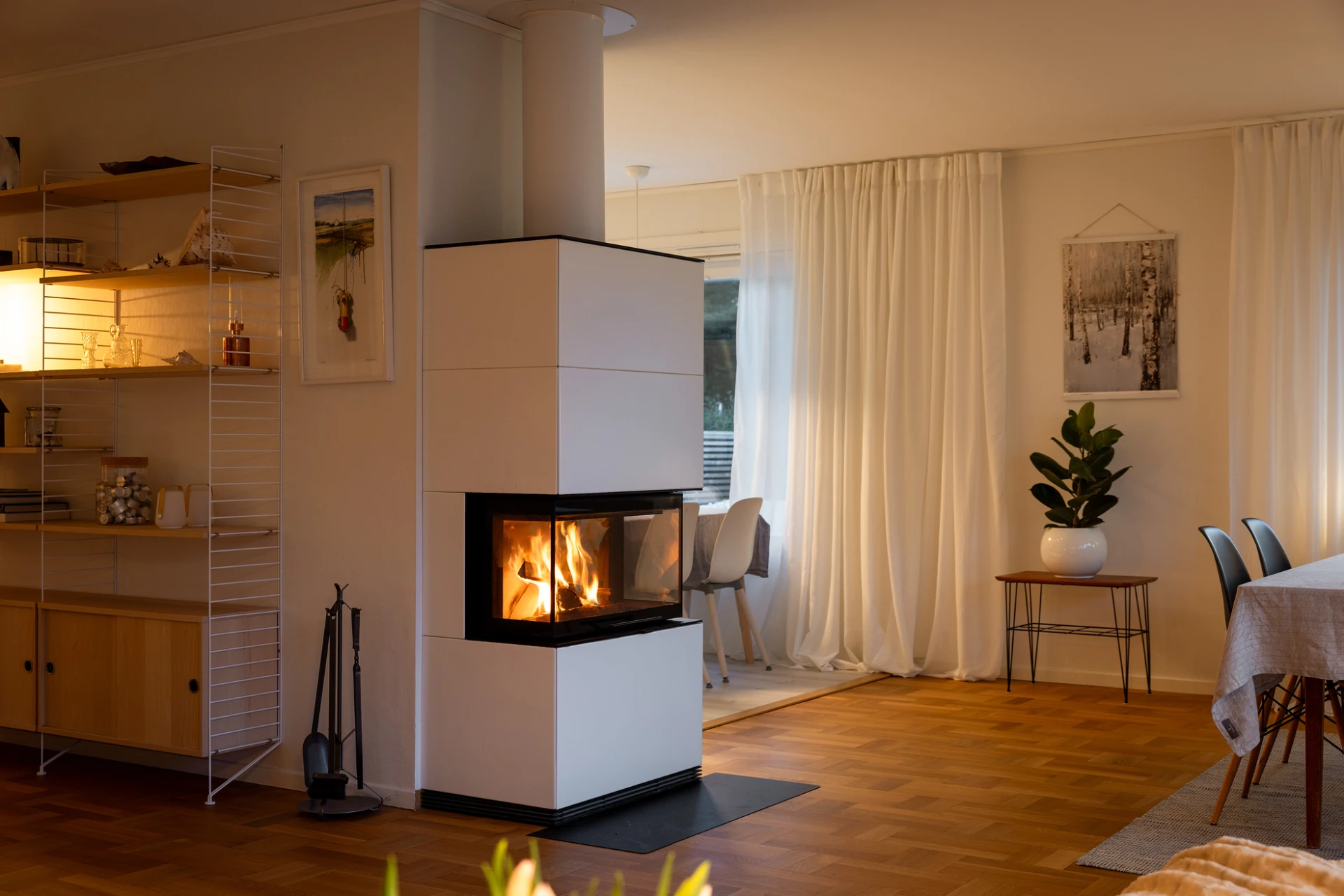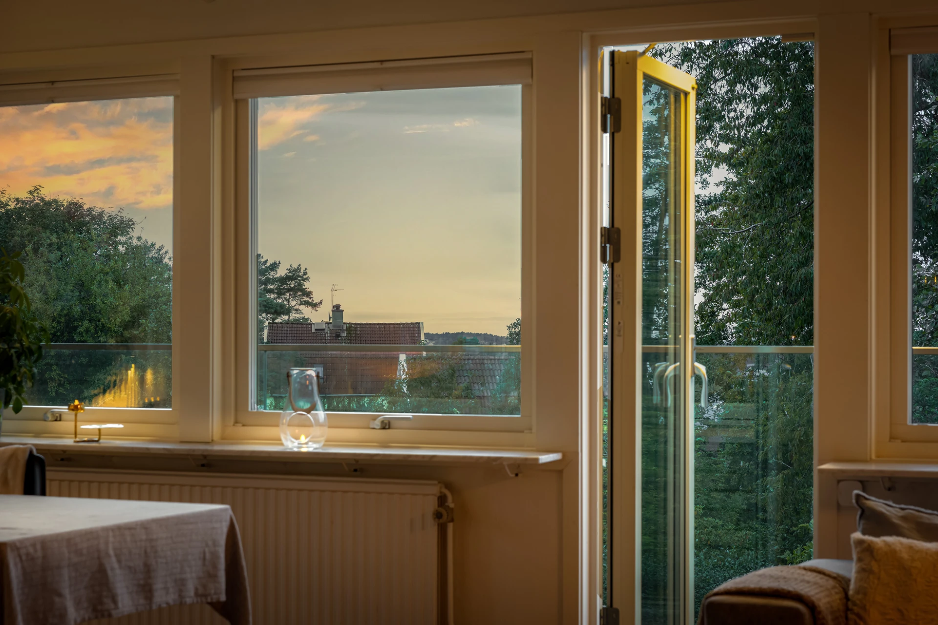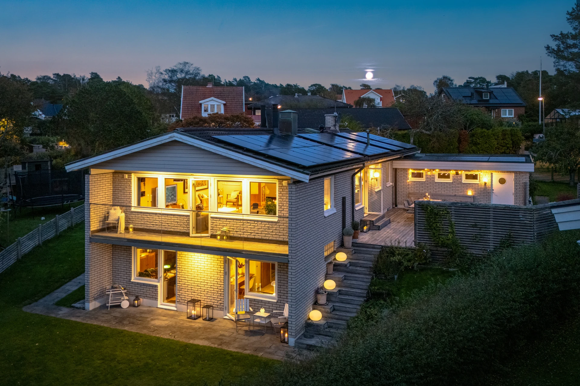 Ekparkett och vitmålade väggar, utgång till både altan och trädgård samt balkong i ljust läge. Plats för stor soffgrupp och matsalsmöbel. Kamin för extra mysfaktor.