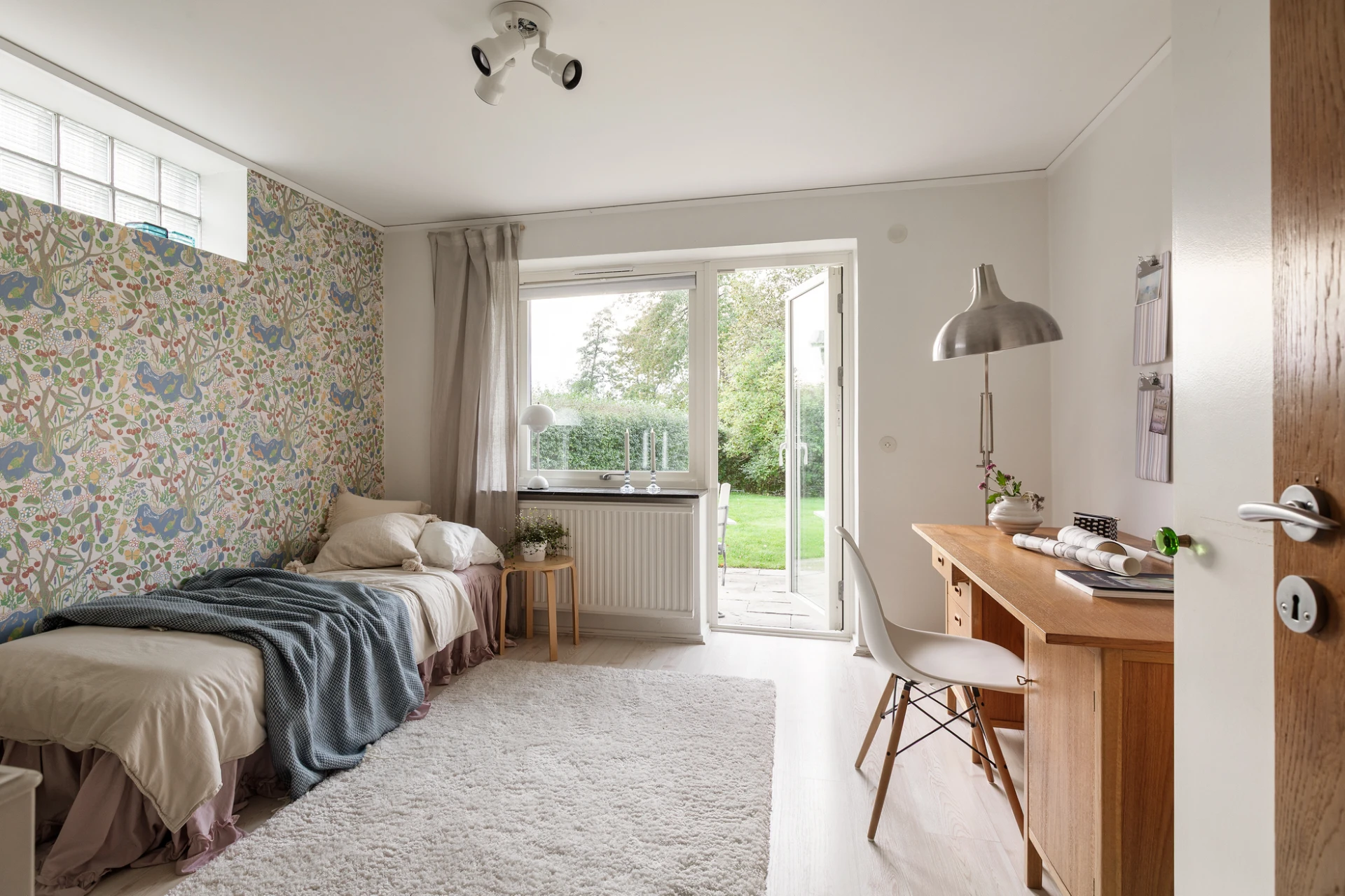 Klickgolv i valnöt med elburen golvvärme och tapetserade väggar. Gästrum idag med utgång till trädgården via altandörr. 2 garderob.