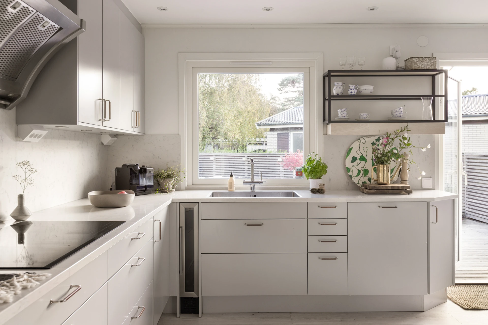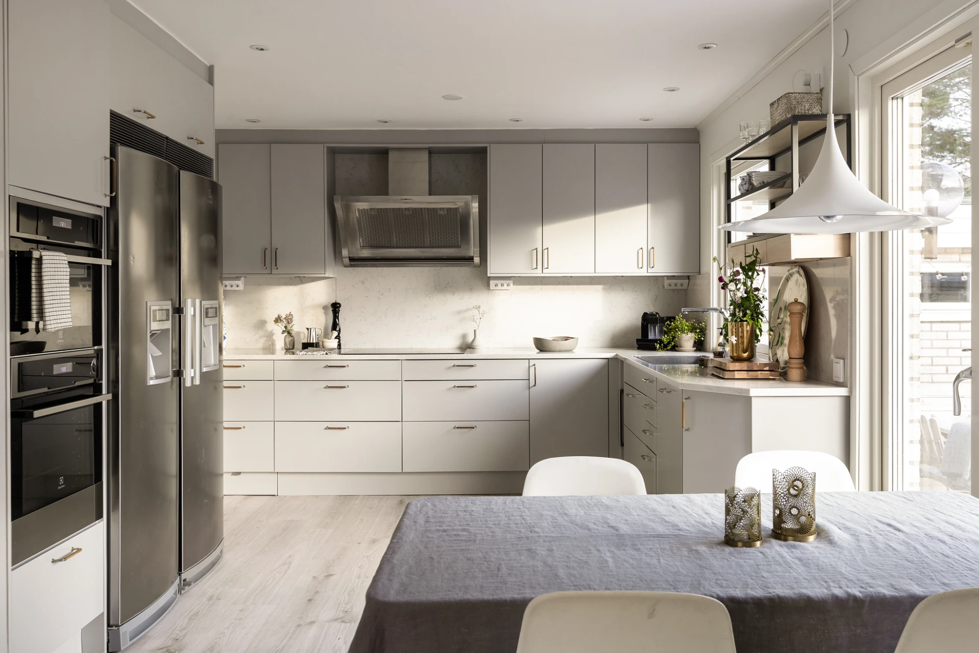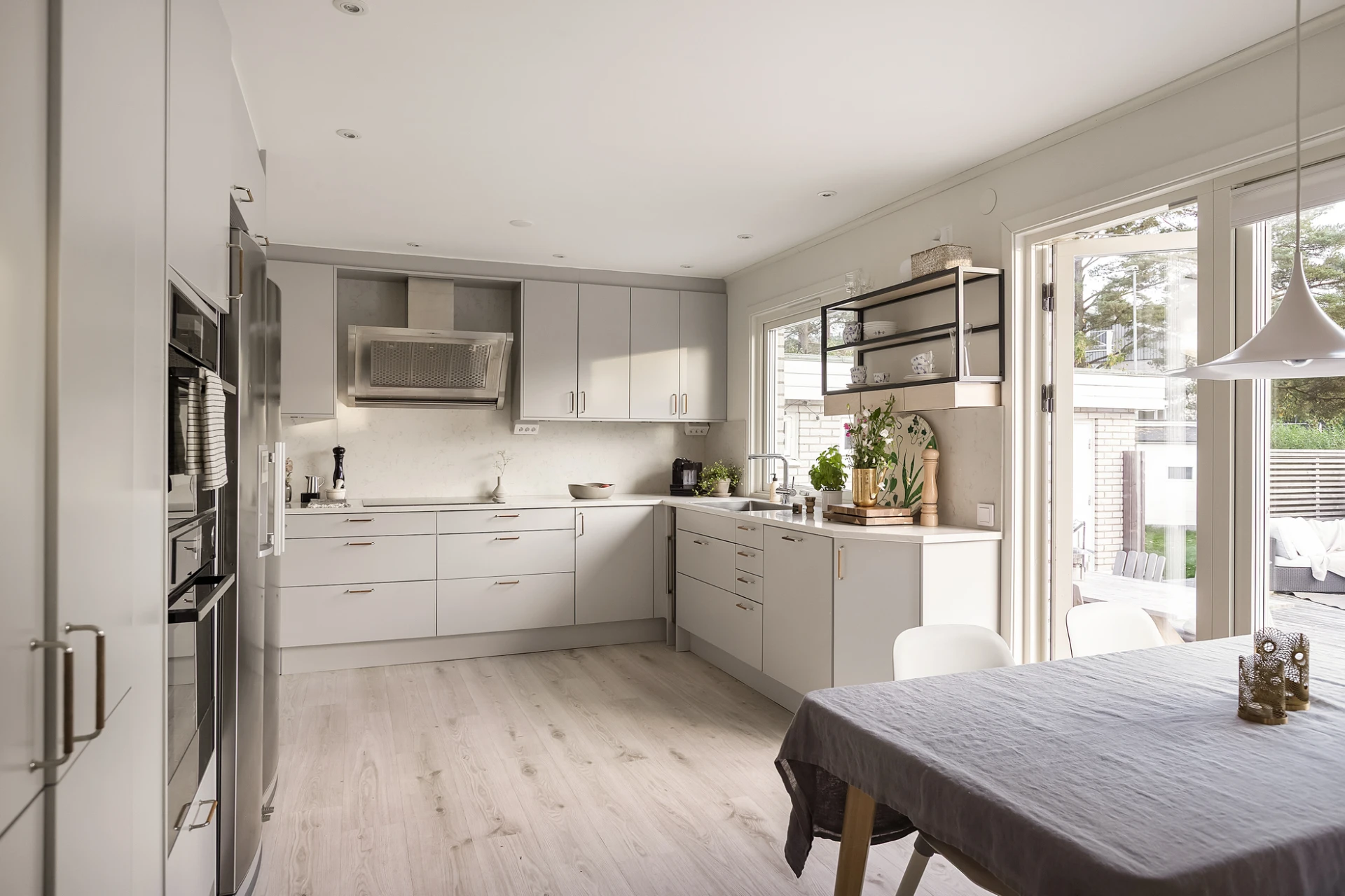 Ljust vinylgolv med vattenburen golvvärme och ljusa väggar. Ljusgrått kök från Marbodal bänkskiva och stänkskydd i kvartskomposit. Maskinell utrustning består av induktionshäll, inbyggd ångugn och inbyggd mikro kombinerad ugn, diskmaskin, kyl och frys i fullhöjd samt fläkt från Fjäråskupan. Spotlights i tak. Matplats för ca 4 personer.