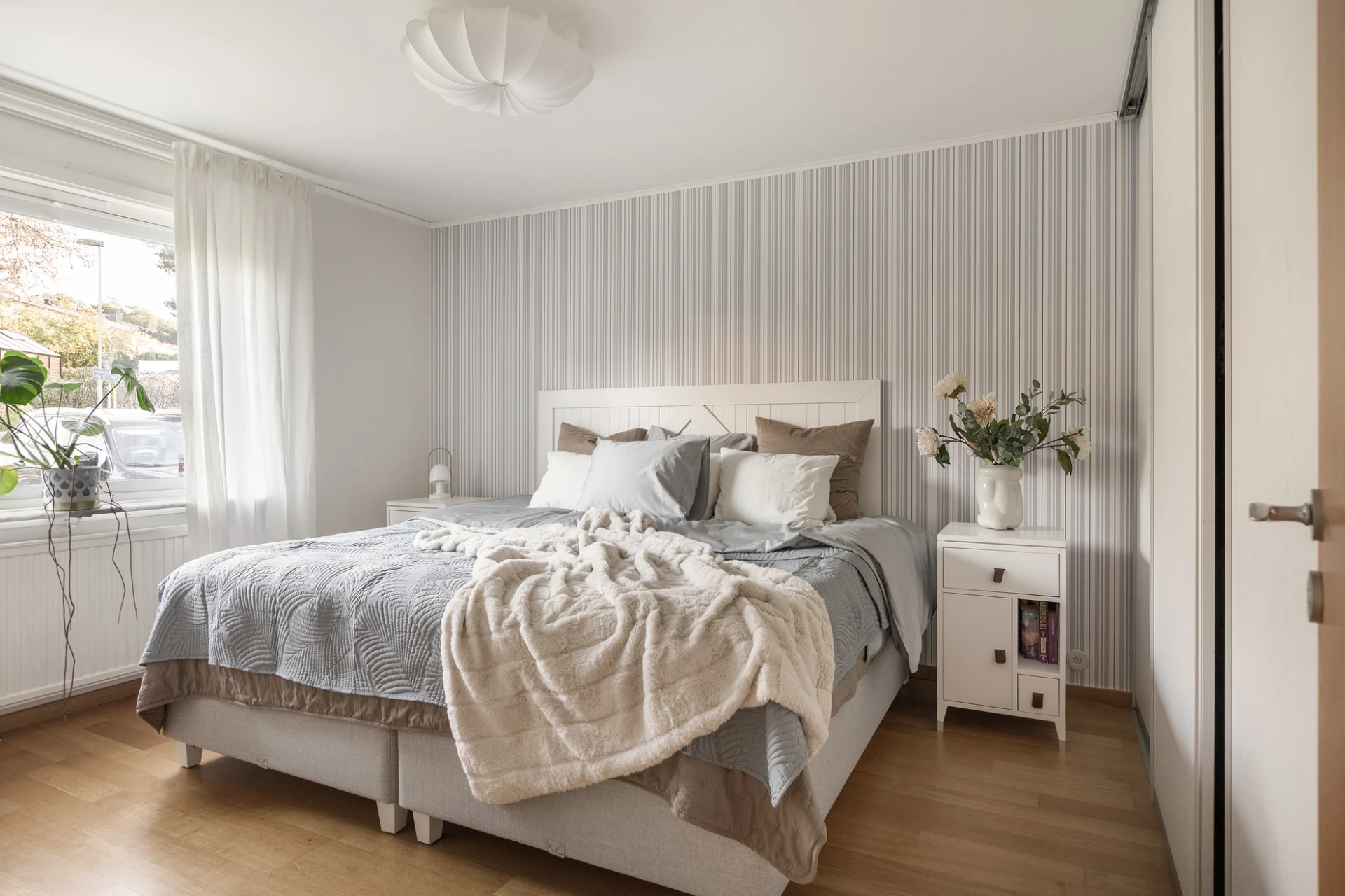 Klickgolv och tapetserade väggar. Plats för dubbelsäng med tillhörande möblemang och en stor skjutdörrsgarderob för förvaring.