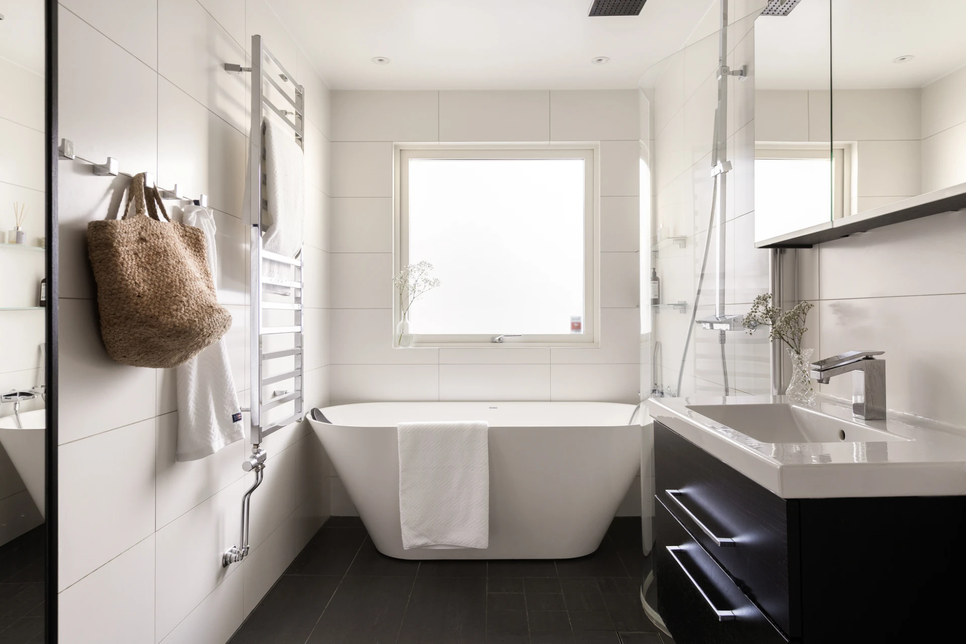 Helkaklat badrum med klinkergolv och golvvärme. Utrustat med WC, kommod med handfat, spegel, dusch samt badkar. Spotlights i tak.