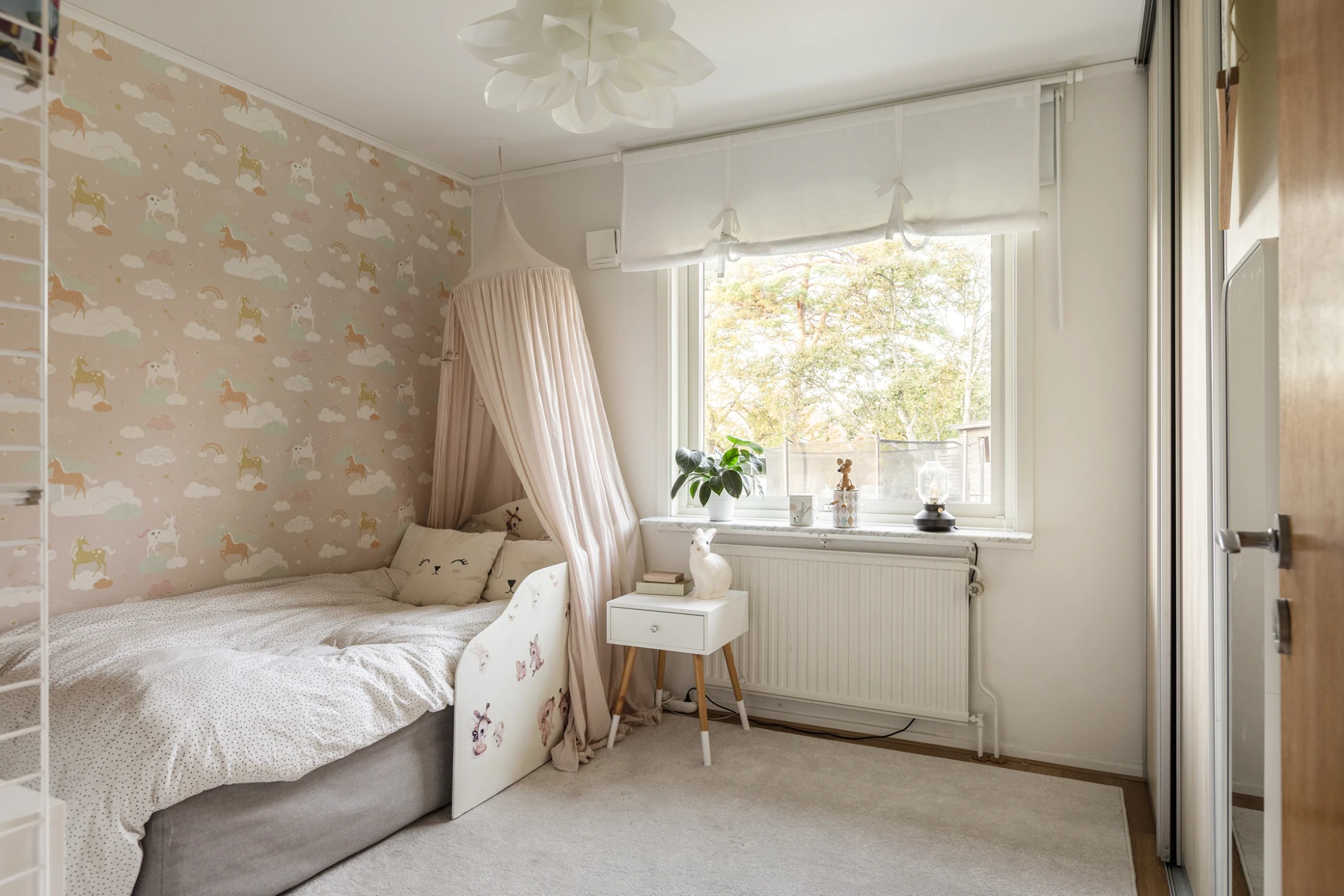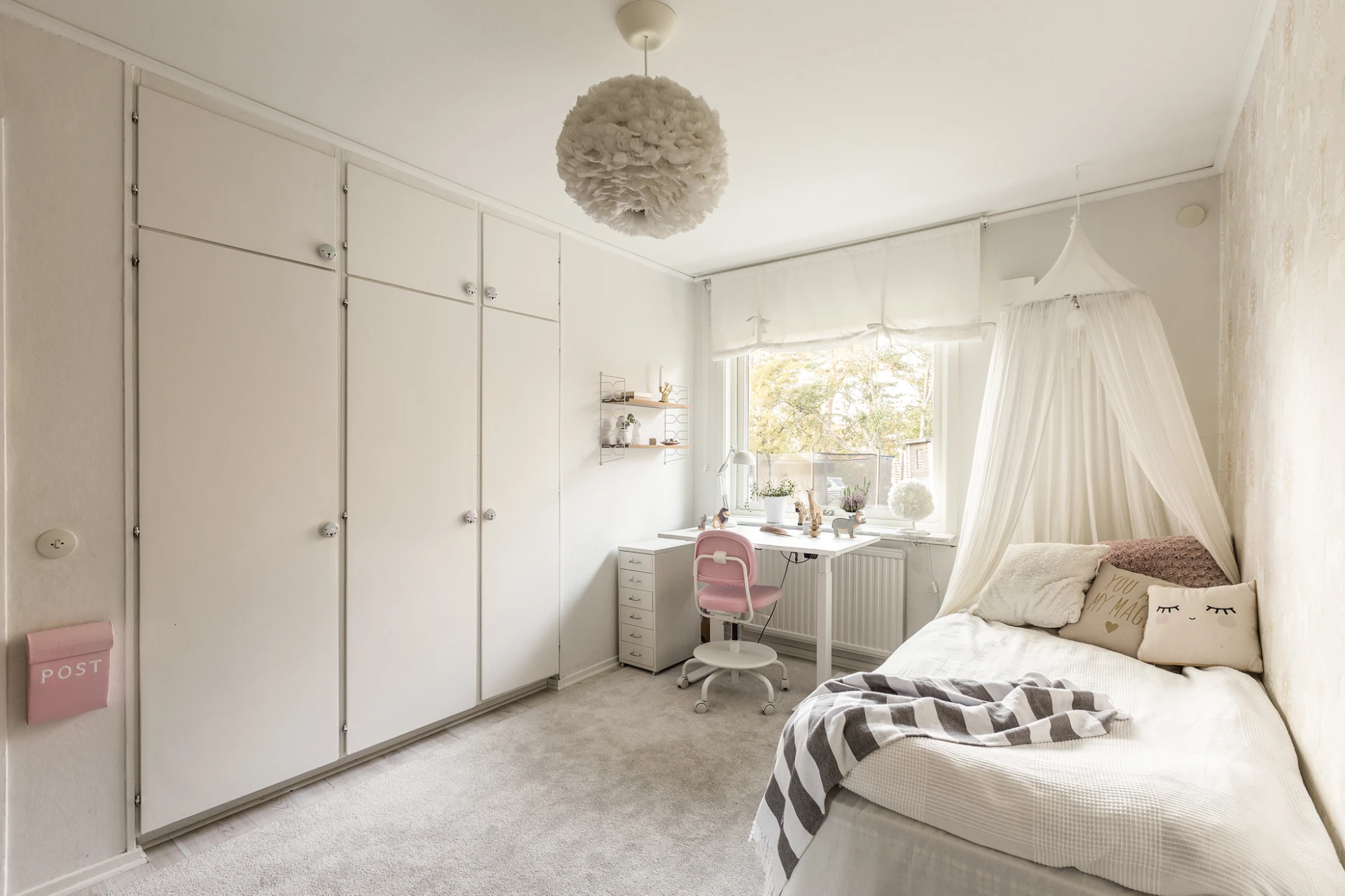 Klickgolv och ljusa väggar. Plats för enkelsäng och skrivbord och lekhörna och 1 skjutdörrsgarderob för förvaring.