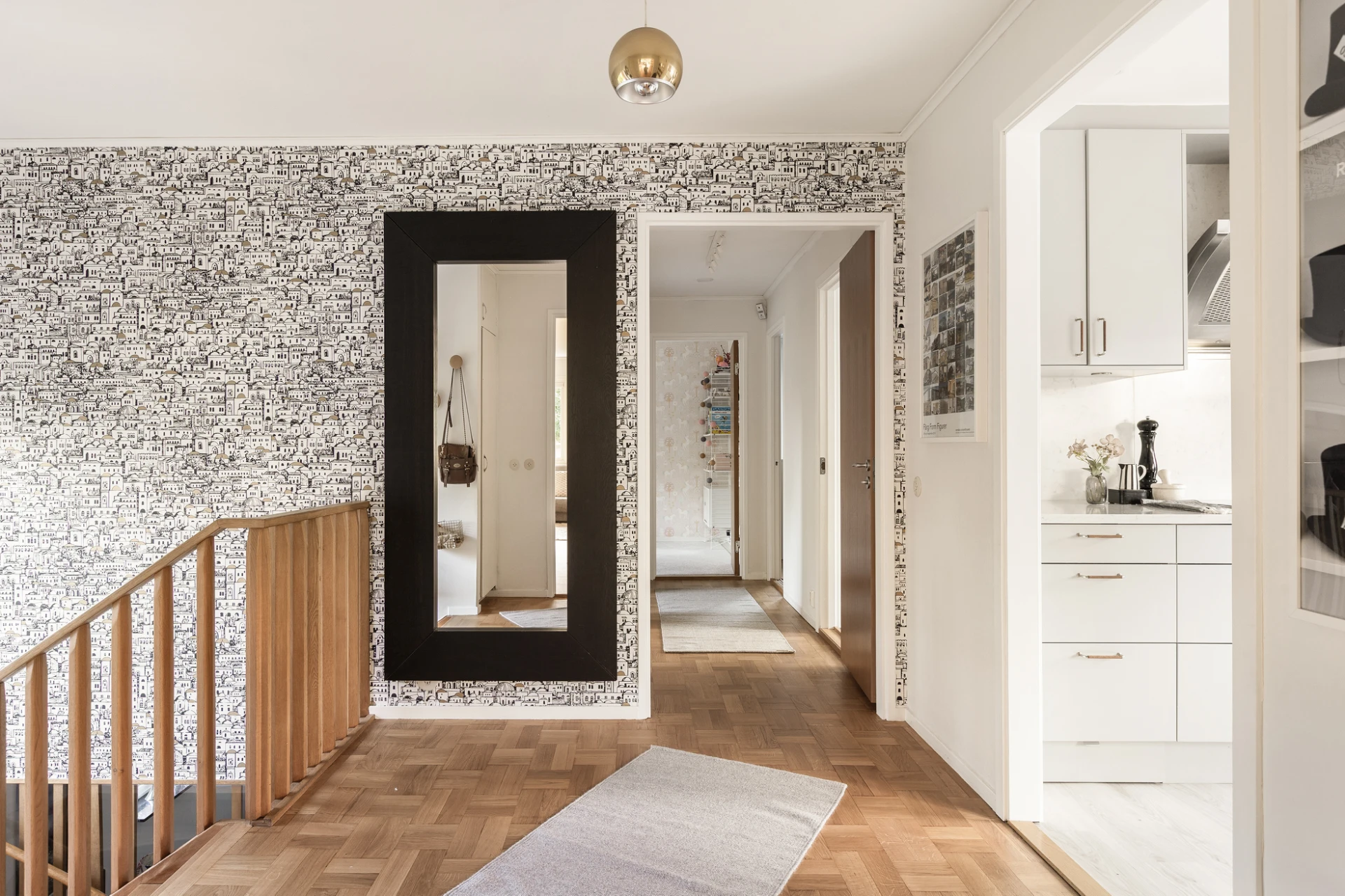 Marmorgolv med golvvärme som övergår till parkett och vita väggar. Här finns plats för avhängning i hatthylla och garderob.