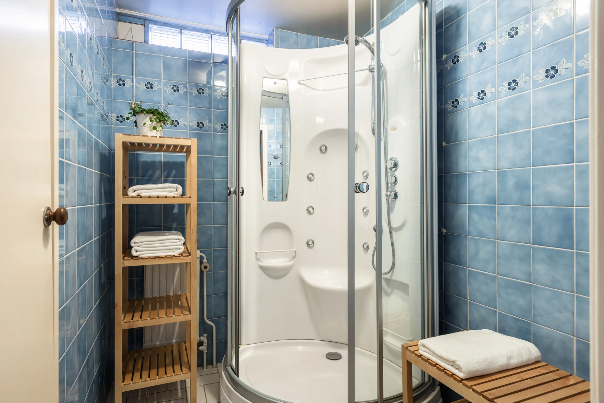 Helkaklat badrum med klinkergolv . Utrustat med WC, kommod med handfat, spegel, dusch.