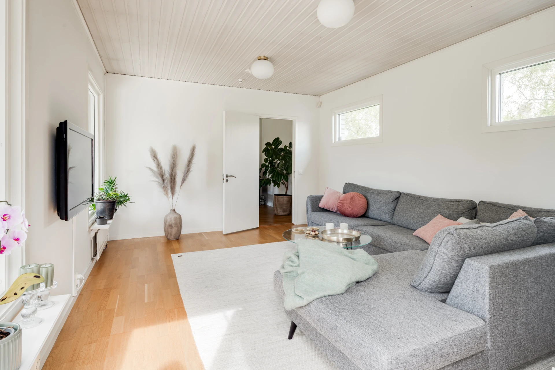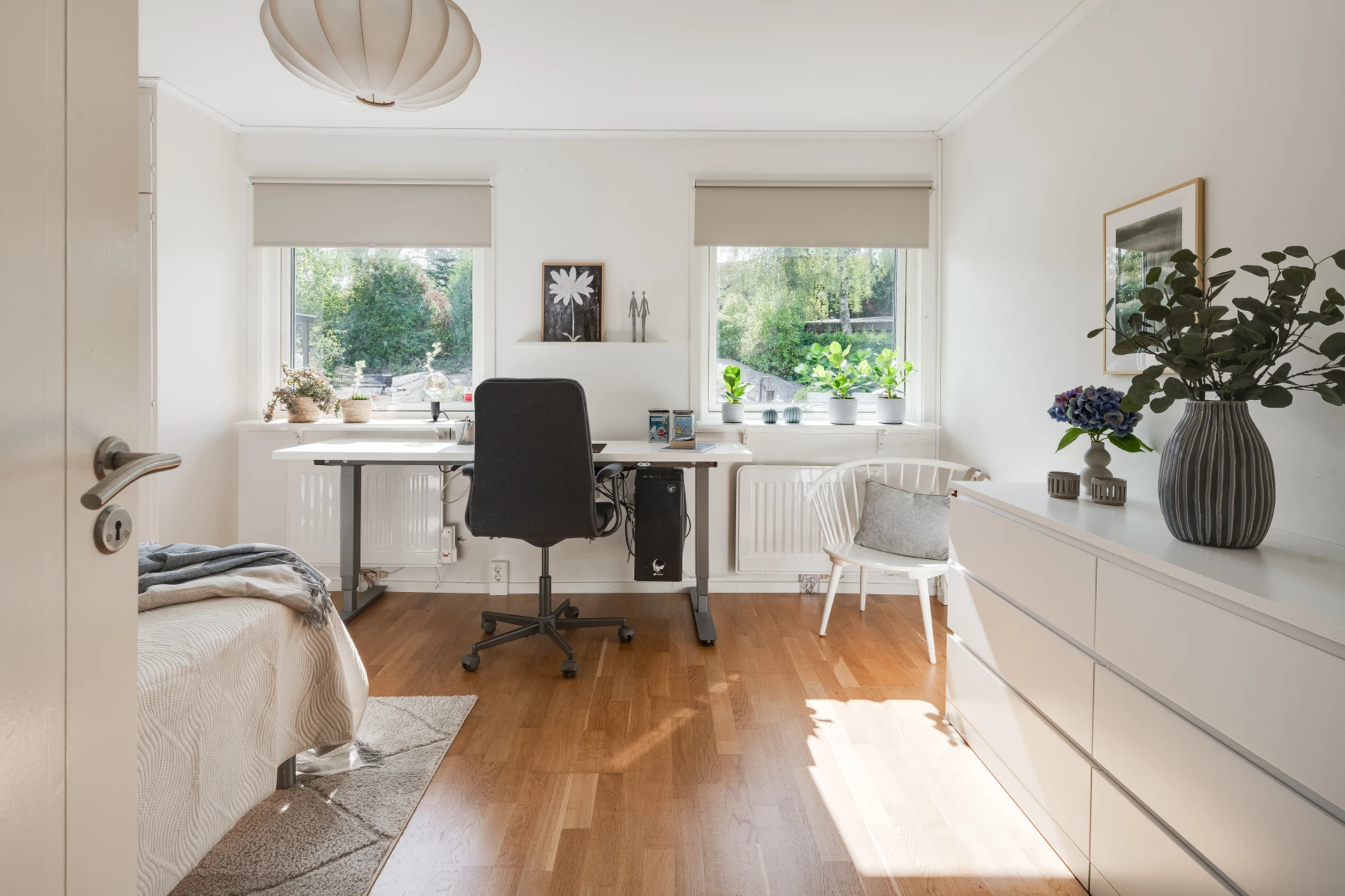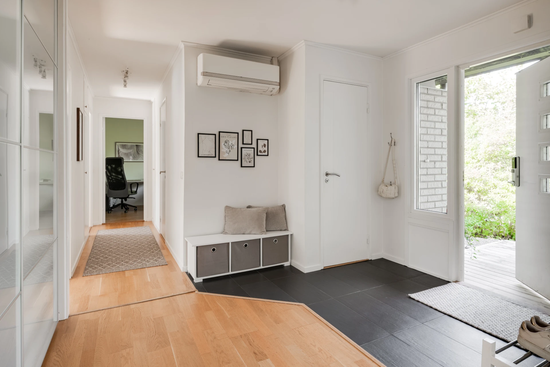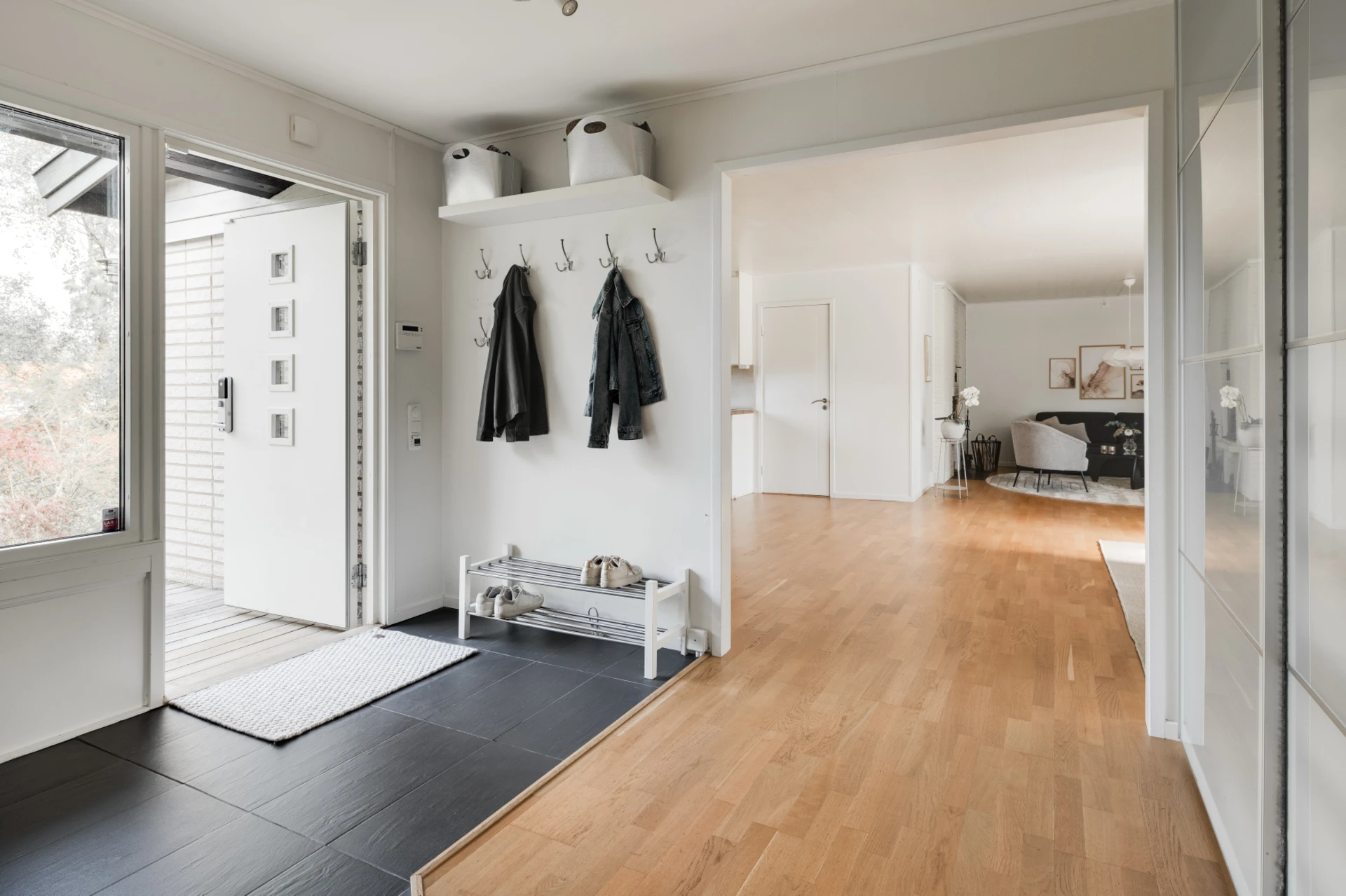 Hallen välkomnar med klinkergolv, golvvärme och generös förvaring bakom skjutdörrar. Förutom tre rymliga sovrum finns ett extra stort rum som passar lika bra som tv-rum, hemmakontor eller gästrum. Även här finns fönster i flera riktningar och en altandörr som leder ut till det stora trädäcket.