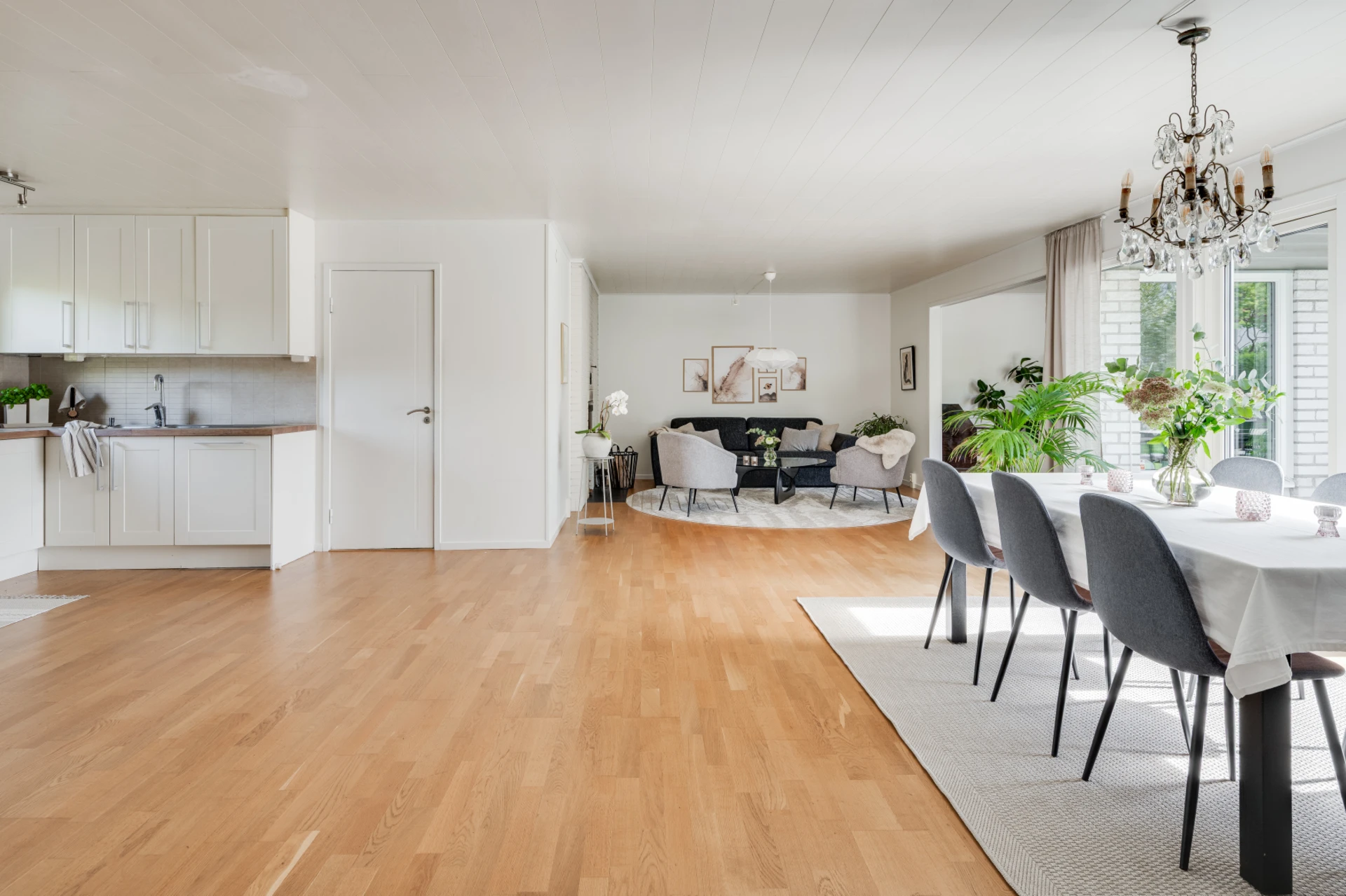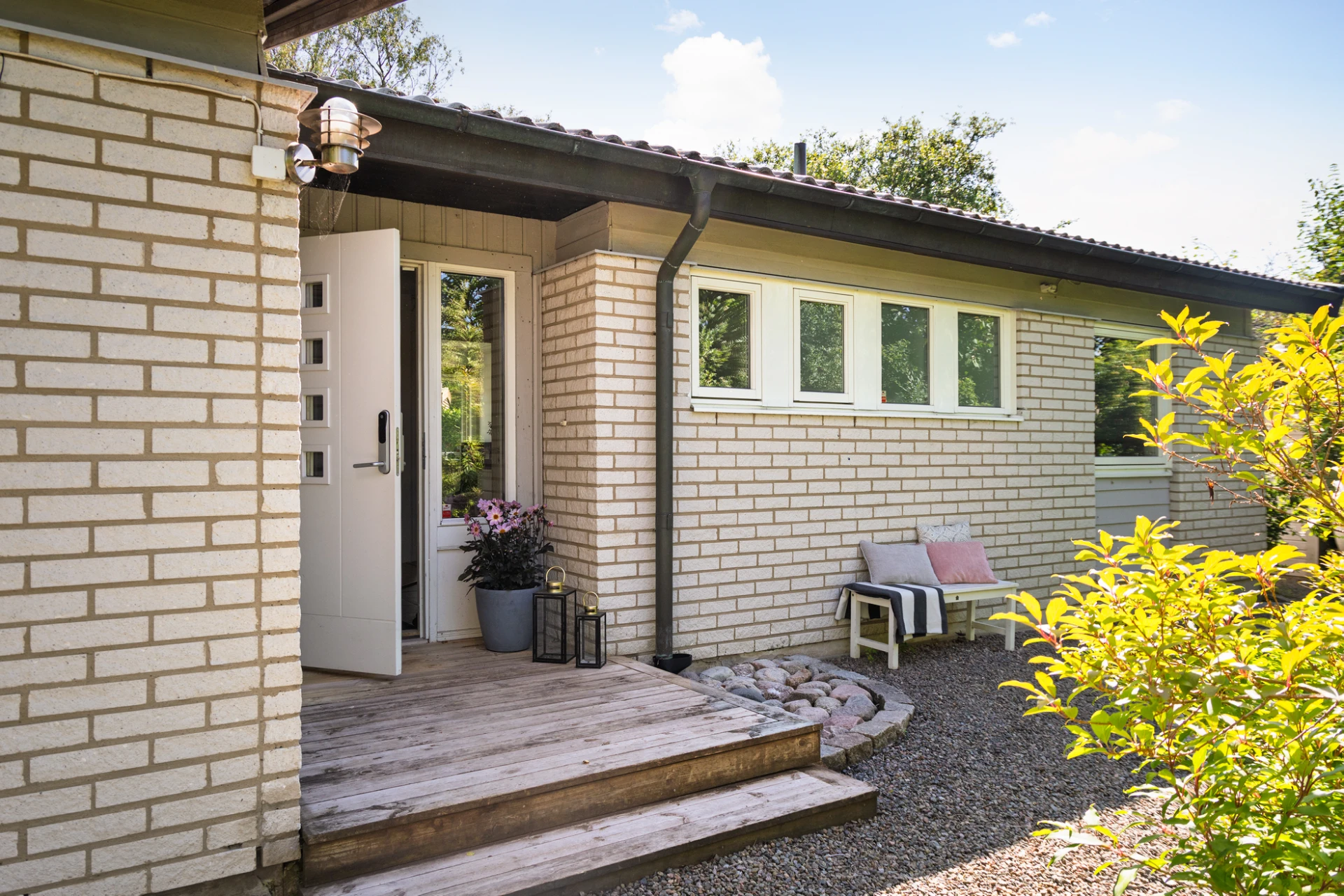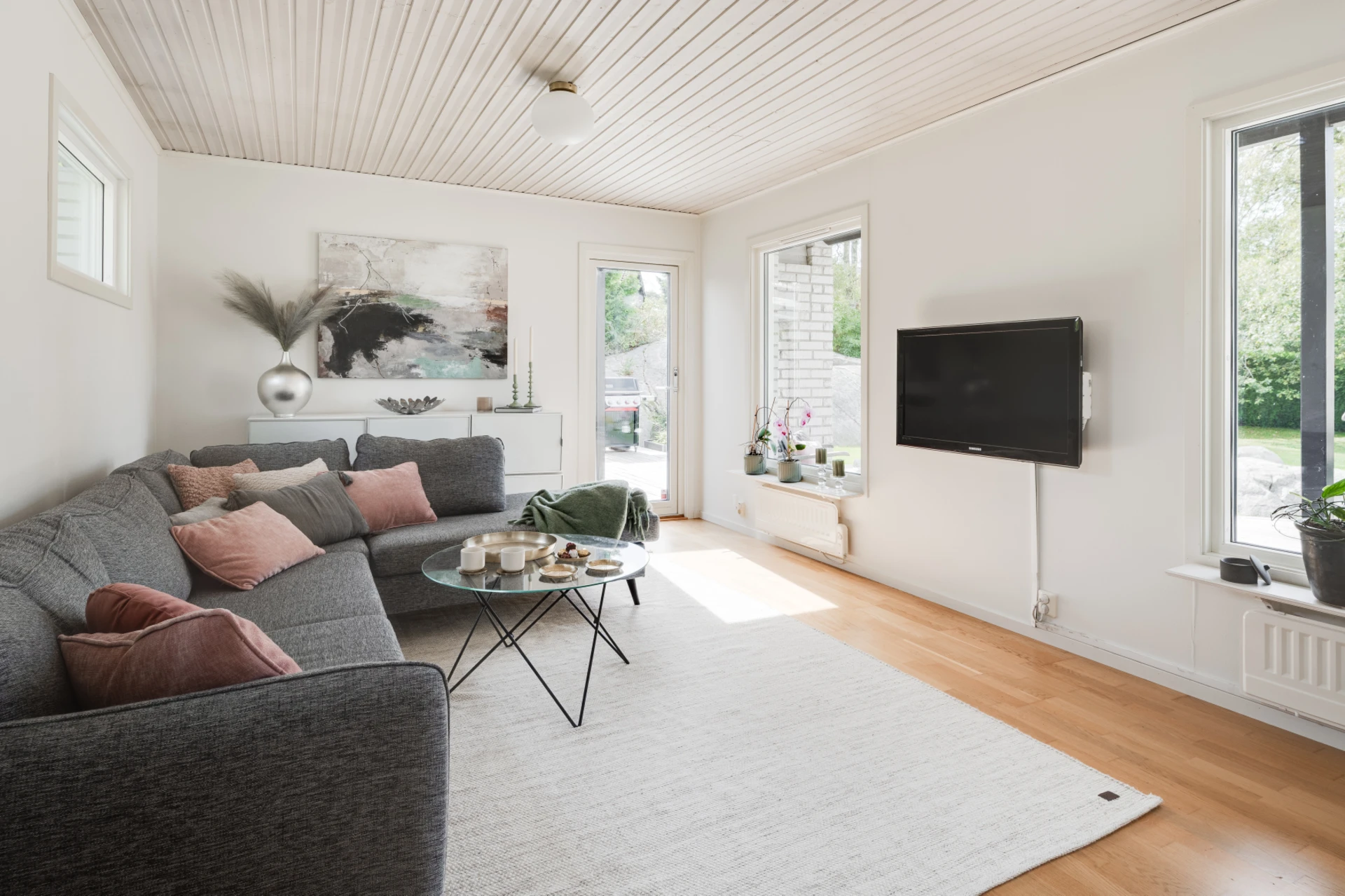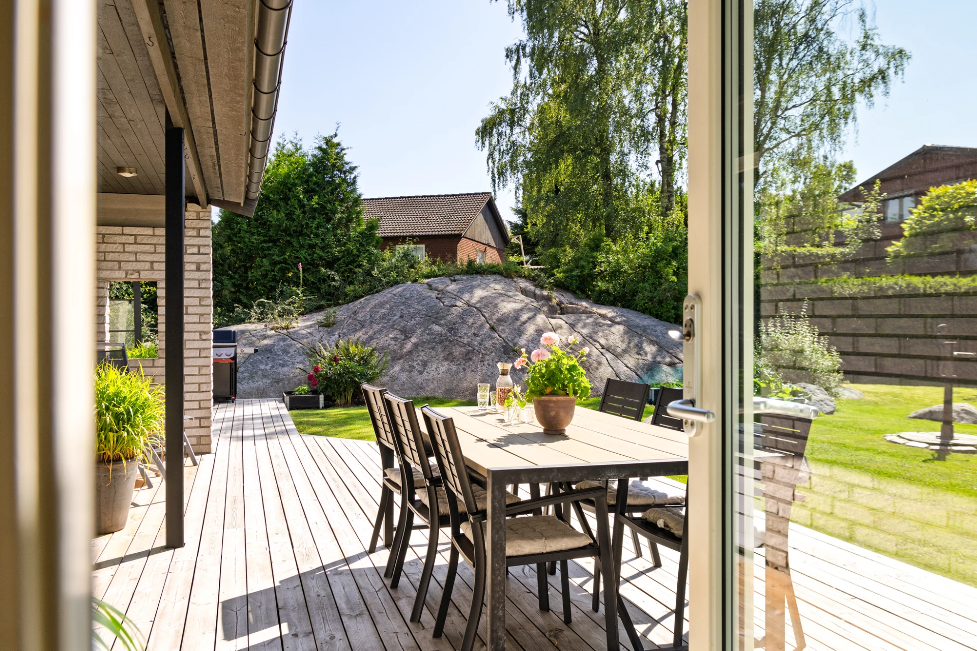 Hallen välkomnar med klinkergolv, golvvärme och generös förvaring bakom skjutdörrar. Förutom tre rymliga sovrum finns ett extra stort rum som passar lika bra som tv-rum, hemmakontor eller gästrum. Även här finns fönster i flera riktningar och en altandörr som leder ut till det stora trädäcket.