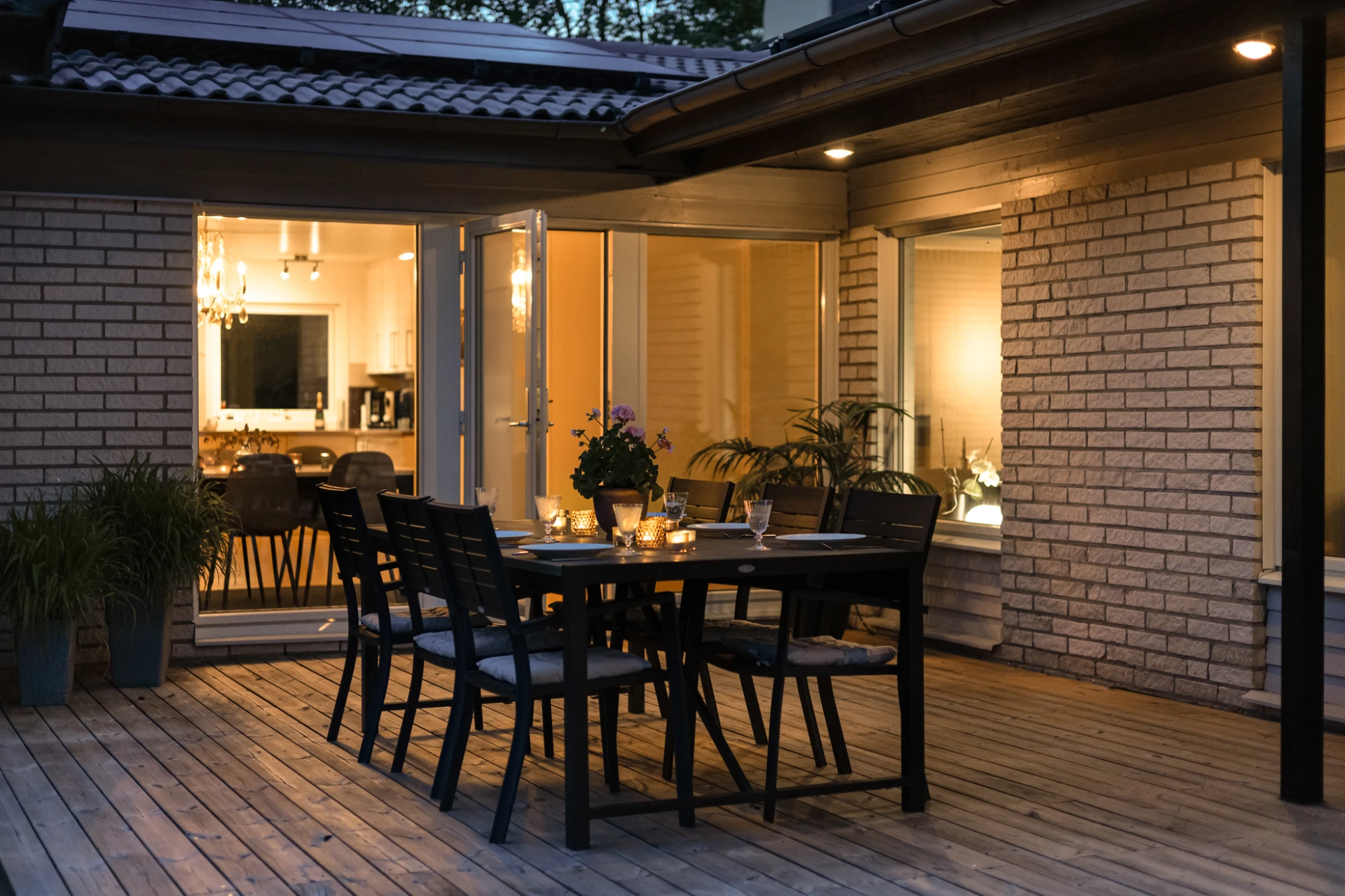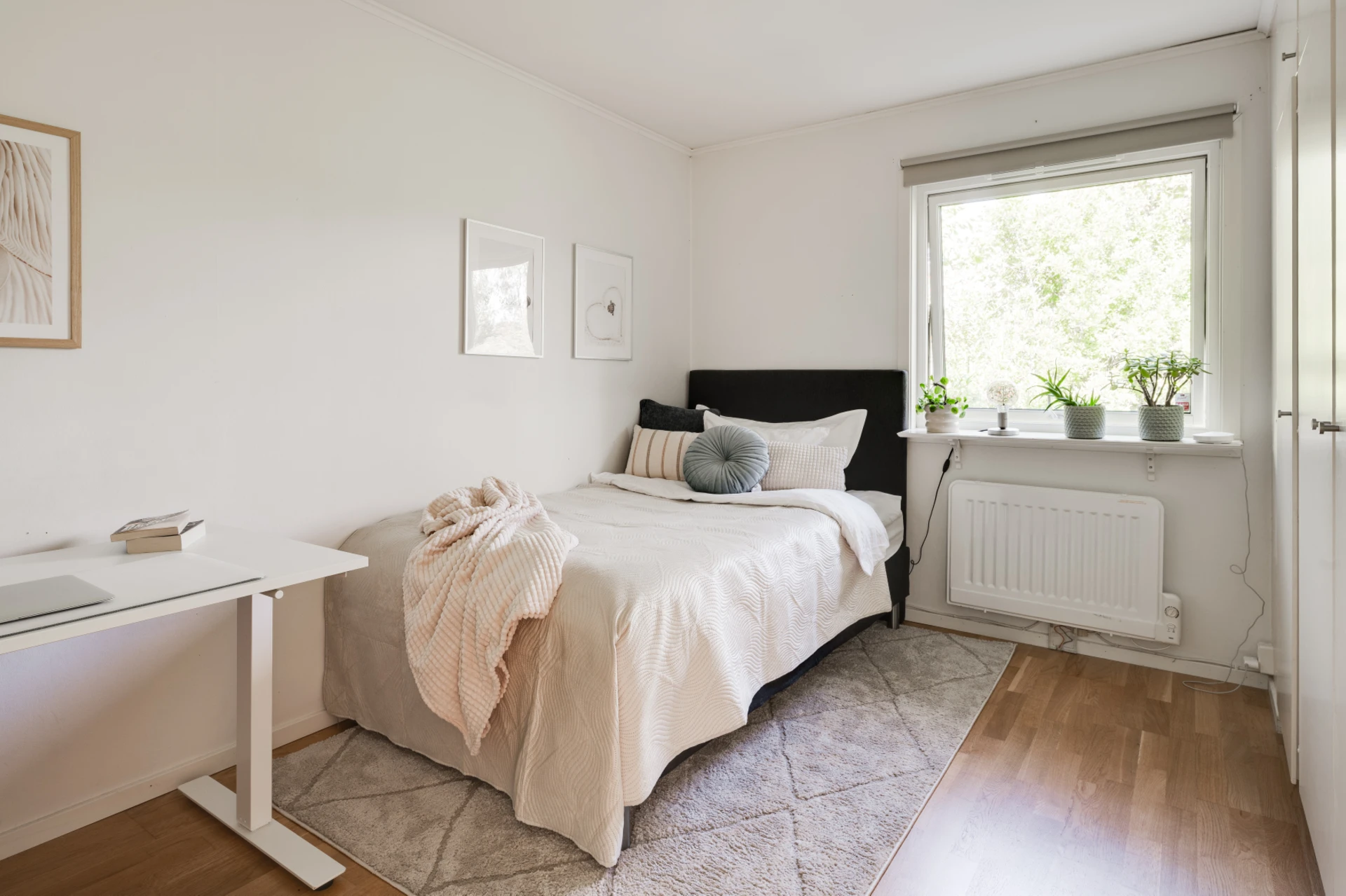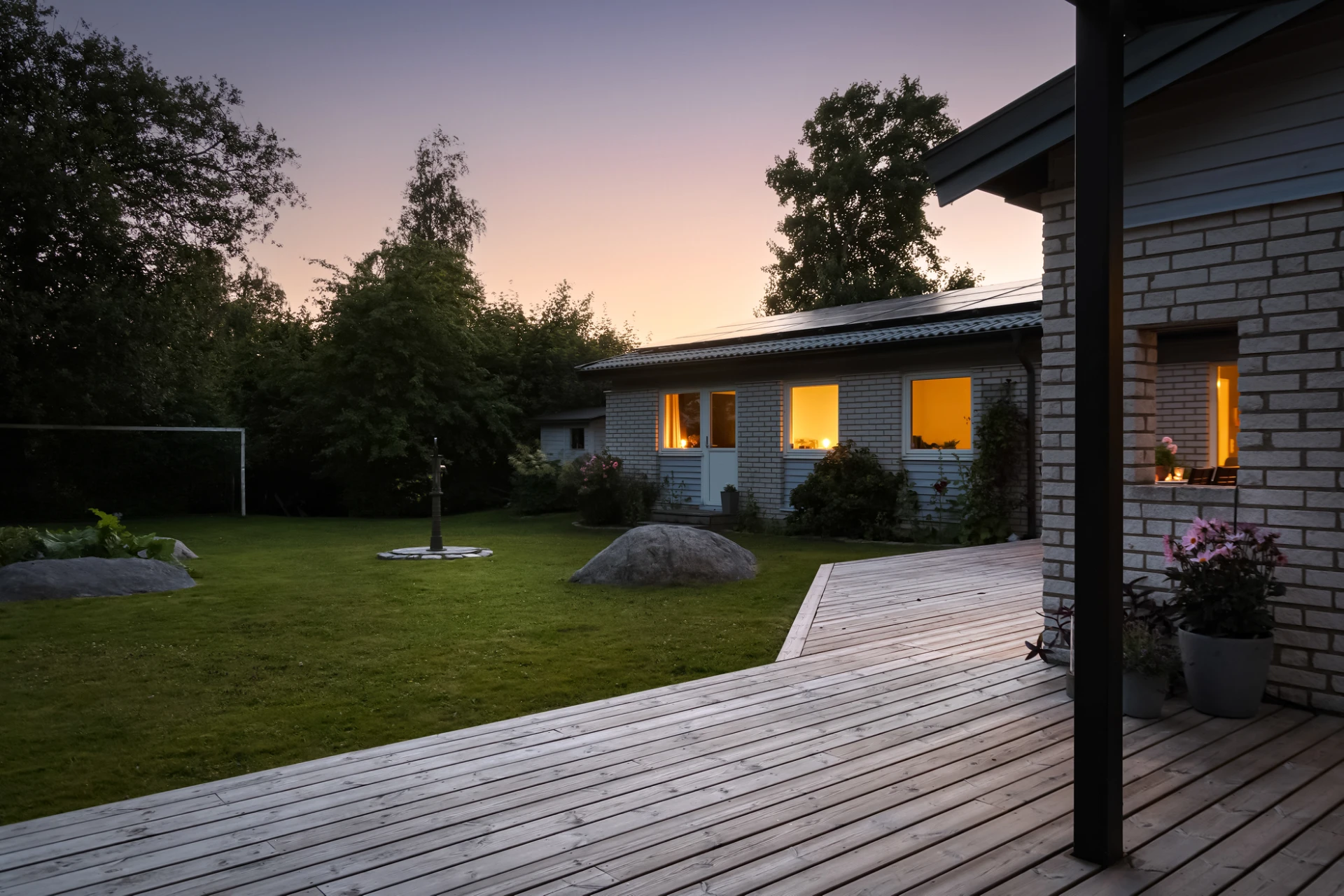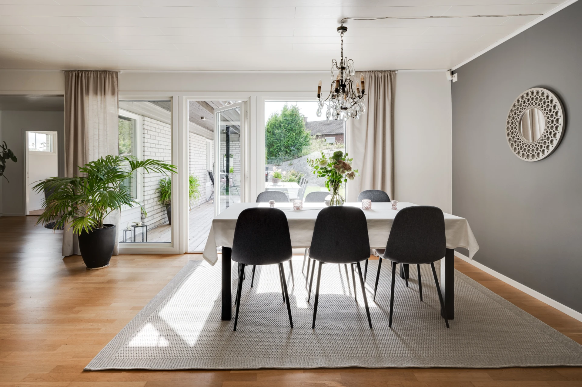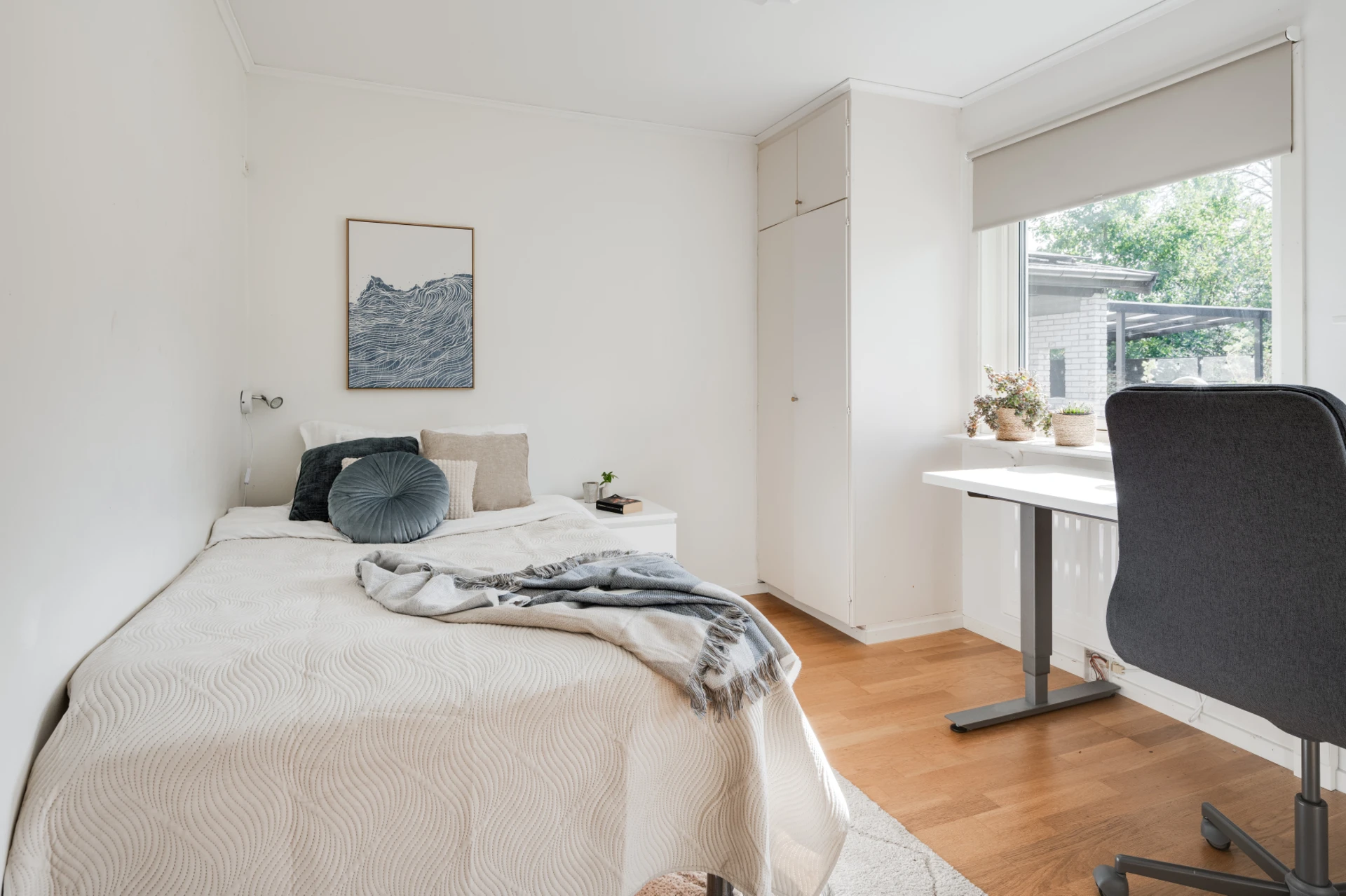 Hallen välkomnar med klinkergolv, golvvärme och generös förvaring bakom skjutdörrar. Förutom tre rymliga sovrum finns ett extra stort rum som passar lika bra som tv-rum, hemmakontor eller gästrum. Även här finns fönster i flera riktningar och en altandörr som leder ut till det stora trädäcket.