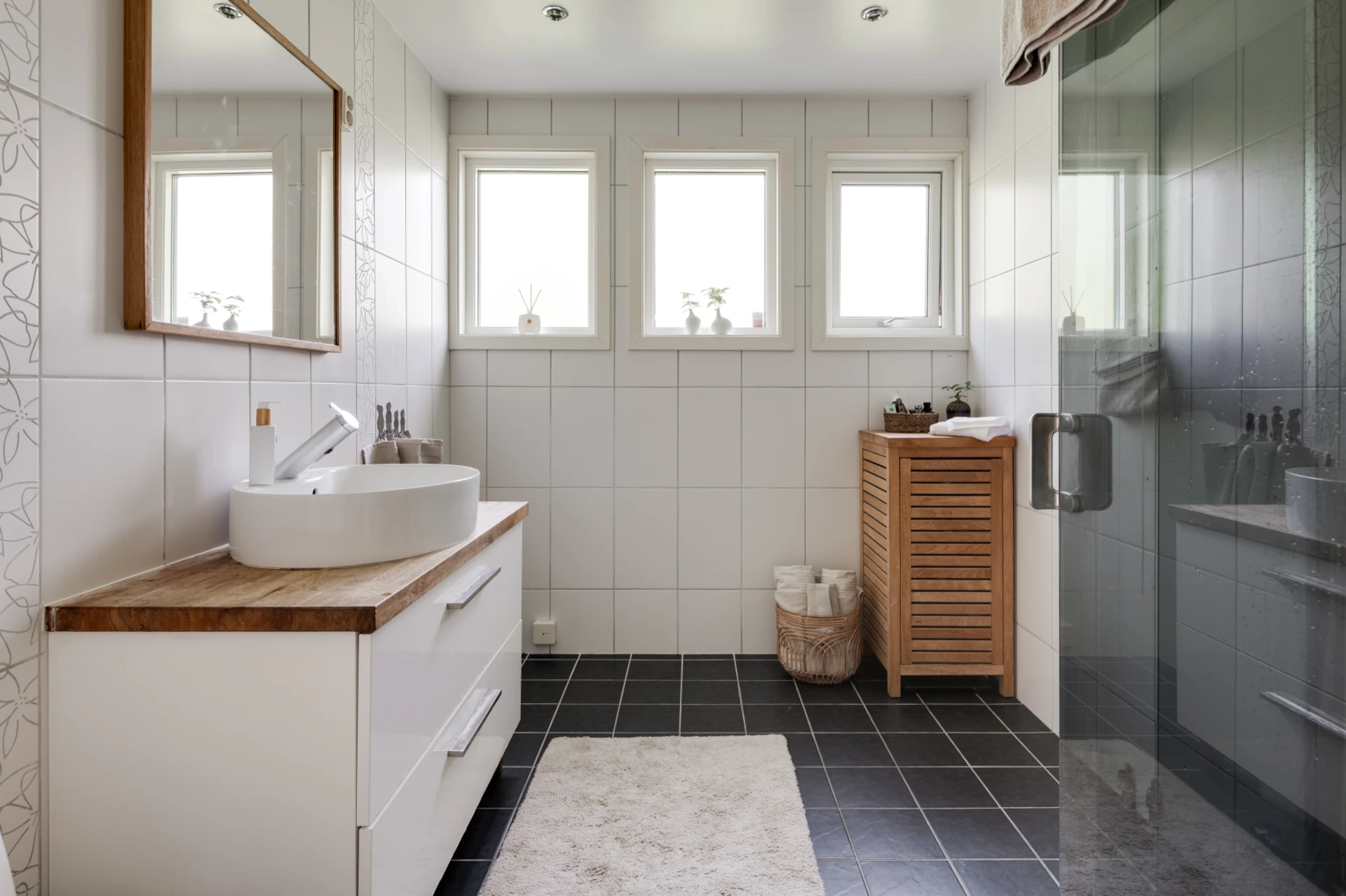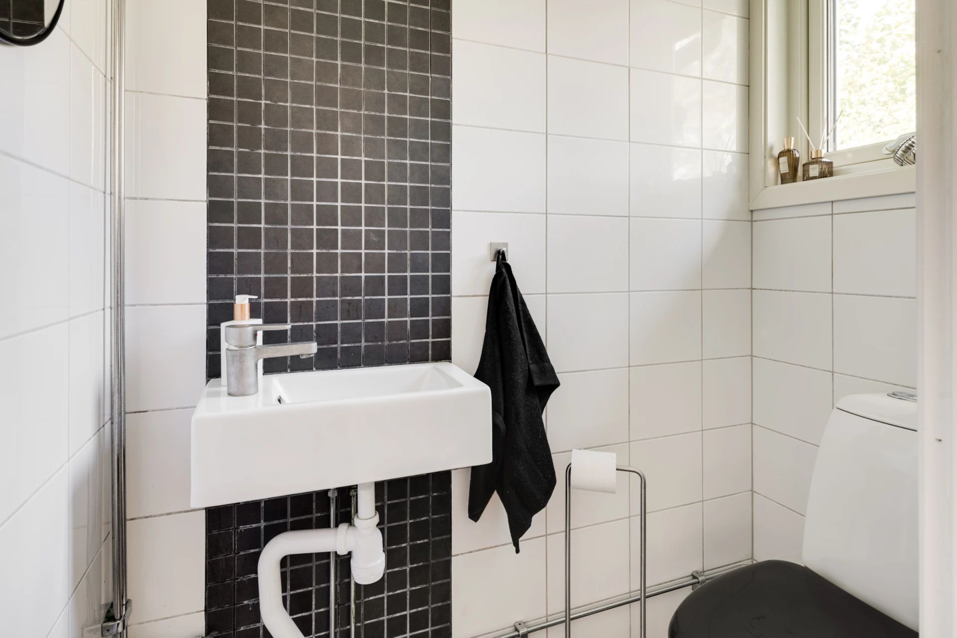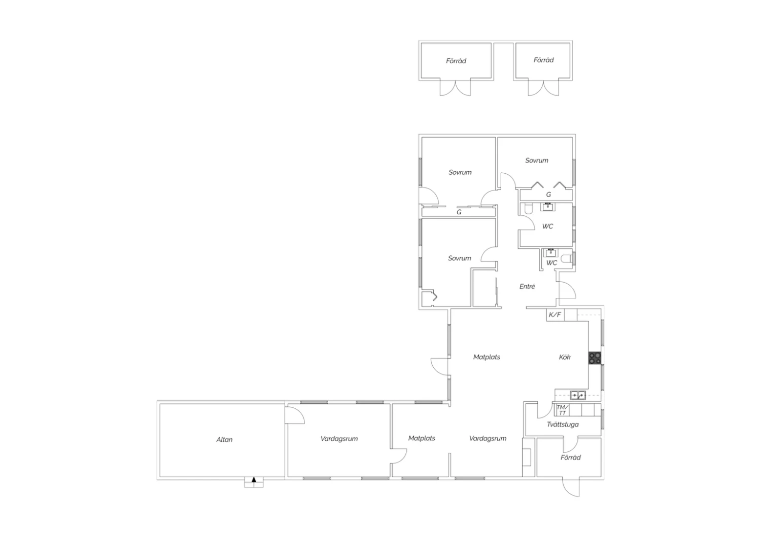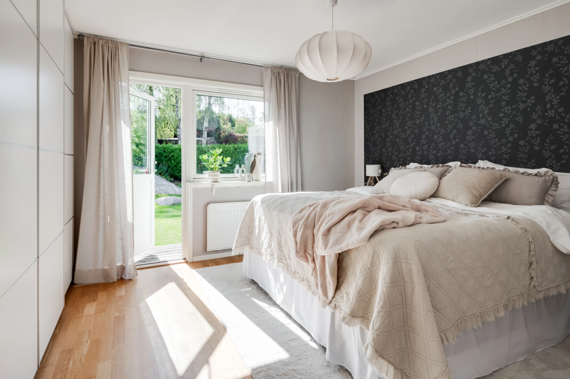Hallen välkomnar med klinkergolv, golvvärme och generös förvaring bakom skjutdörrar. Förutom tre rymliga sovrum finns ett extra stort rum som passar lika bra som tv-rum, hemmakontor eller gästrum. Även här finns fönster i flera riktningar och en altandörr som leder ut till det stora trädäcket.