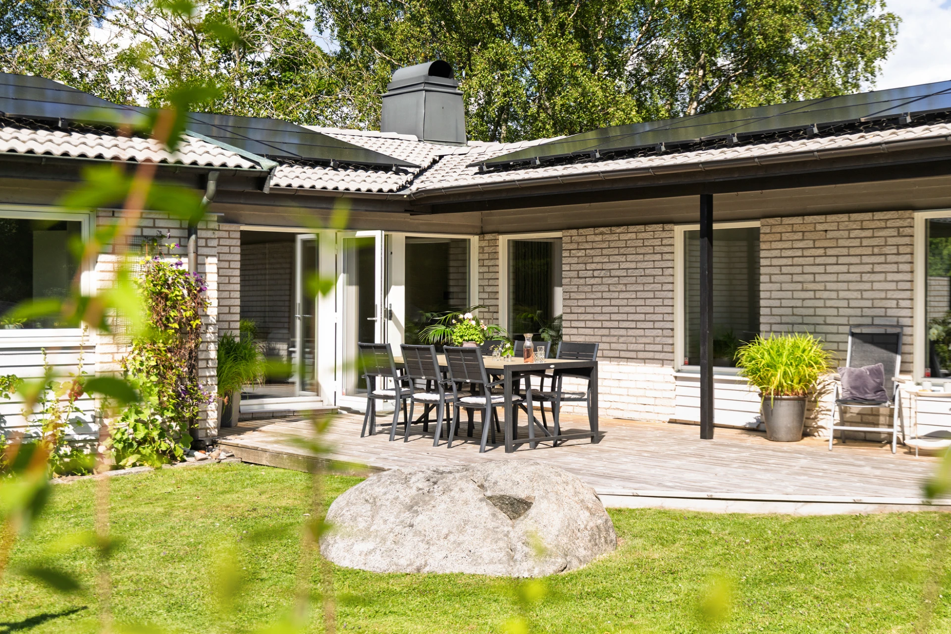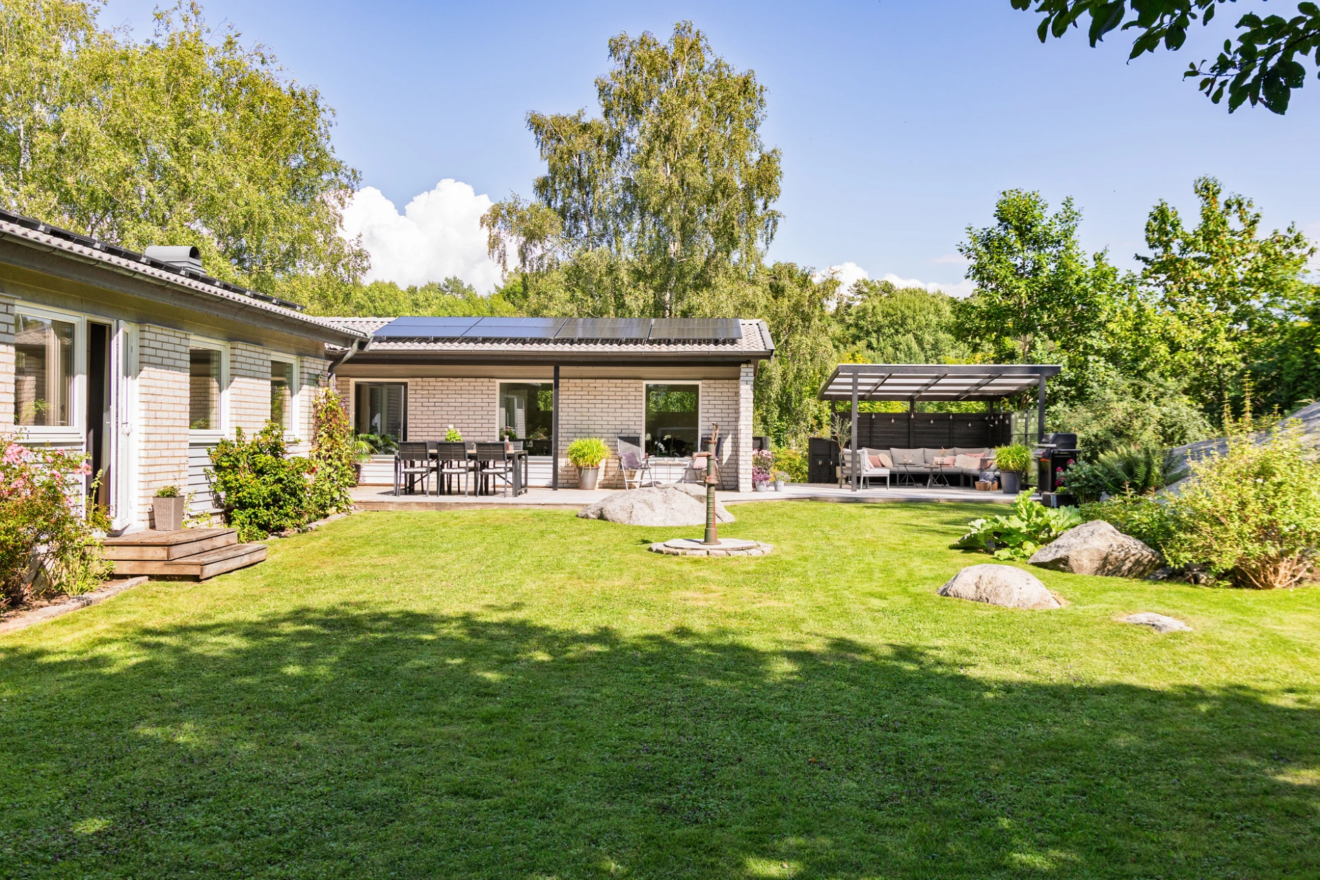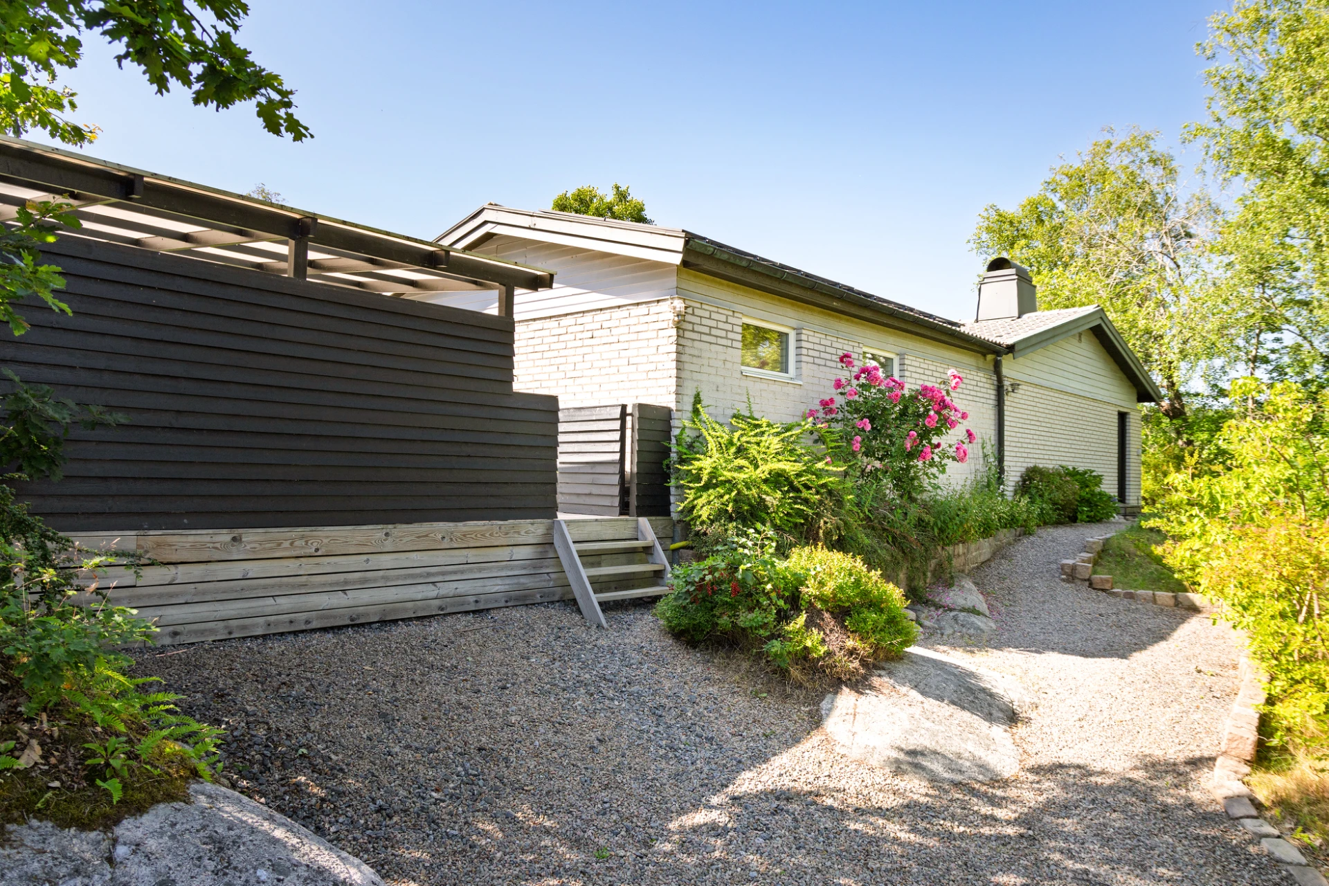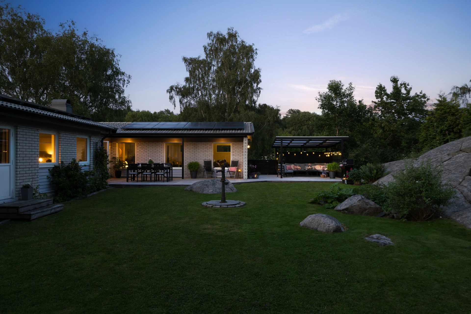 Tomten är högt belägen och insynsskyddad, omgiven av grönska och vackra inslag av berg och sten som ger karaktär åt trädgården. Här finns både ett rymligt altandäck och en pergola med tak, inredd med soffa, kuddar och belysning – en rofylld plats att njuta av under sommarens kvällar. Nedanför huset finns en parkering med plats för 3–4 bilar samt elbilsladdare. Huset är utrustat med solpaneler och batteri, vilket ger låga driftkostnader.