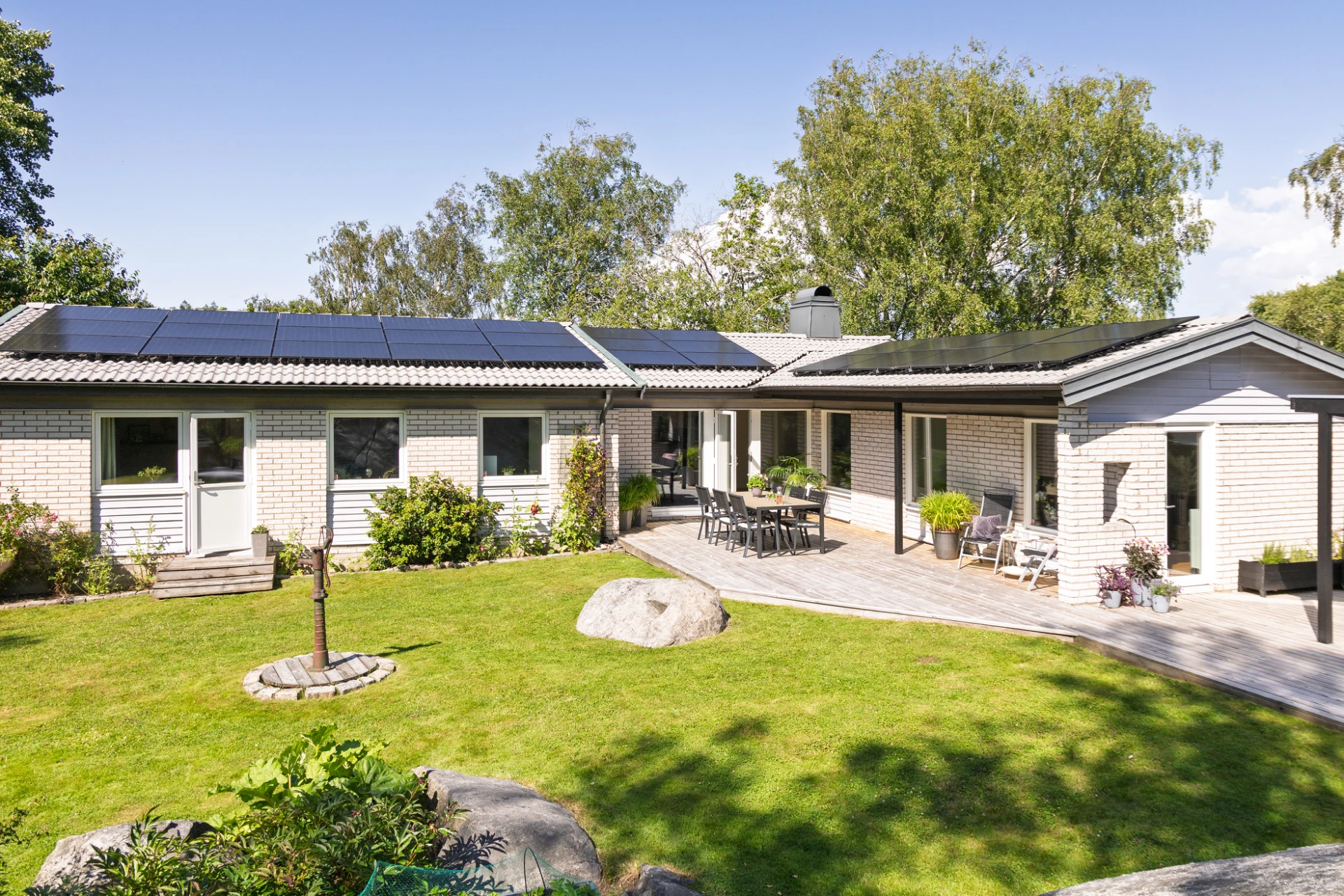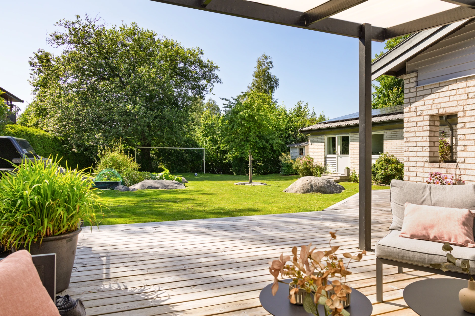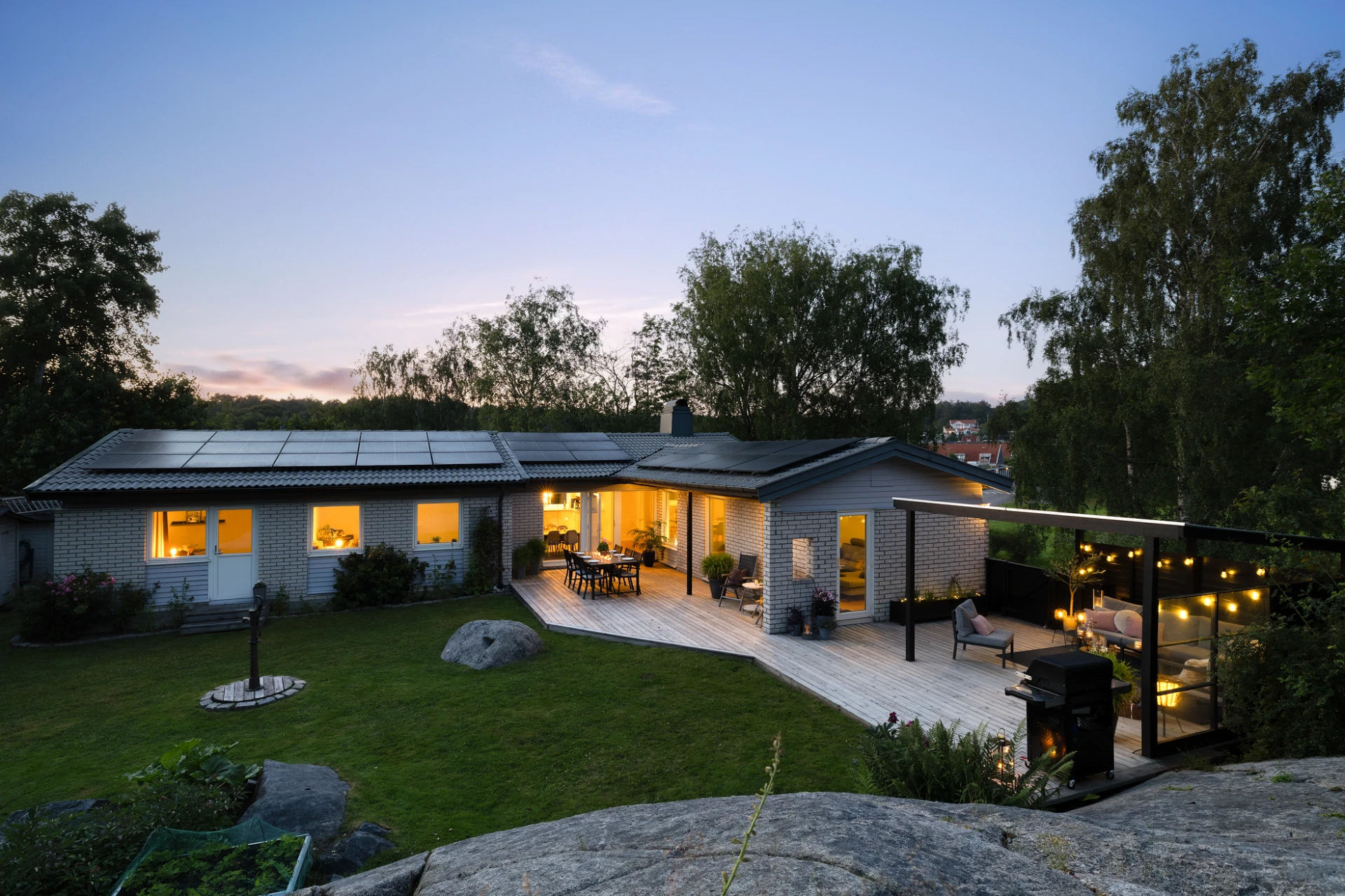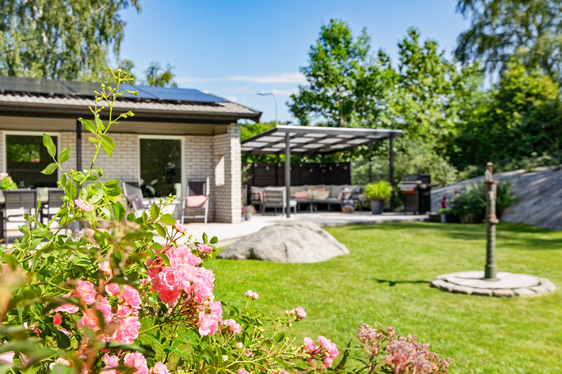 Tomten är högt belägen och insynsskyddad, omgiven av grönska och vackra inslag av berg och sten som ger karaktär åt trädgården. Här finns både ett rymligt altandäck och en pergola med tak, inredd med soffa, kuddar och belysning – en rofylld plats att njuta av under sommarens kvällar. Nedanför huset finns en parkering med plats för 3–4 bilar samt elbilsladdare. Huset är utrustat med solpaneler och batteri, vilket ger låga driftkostnader.