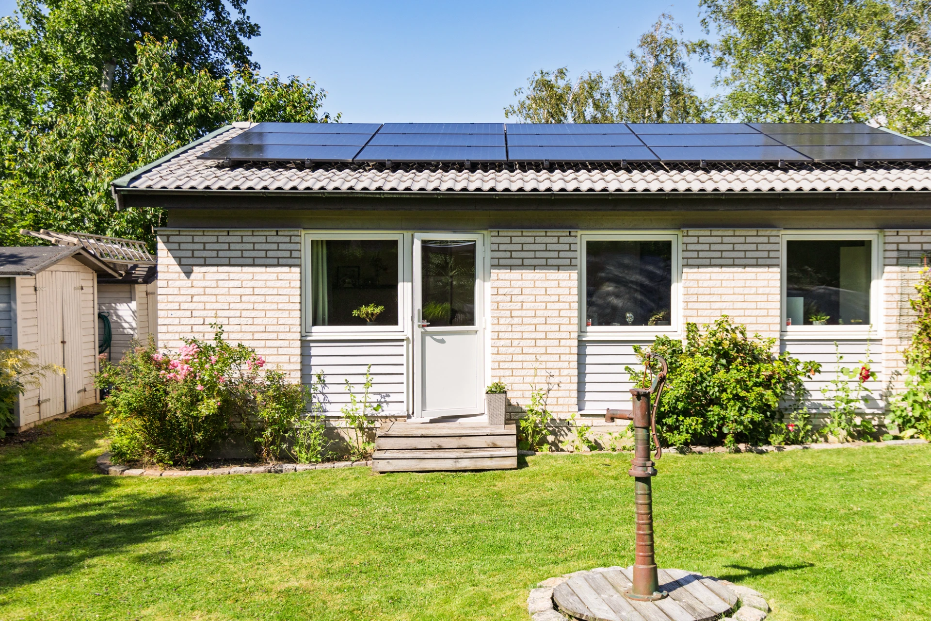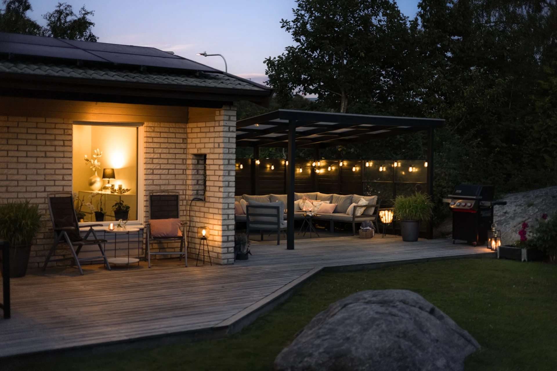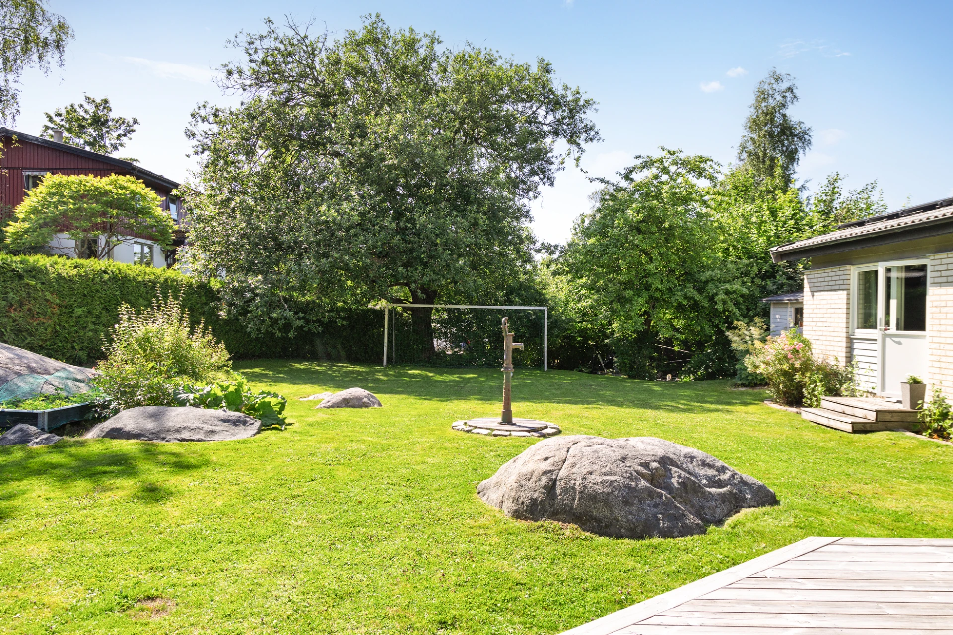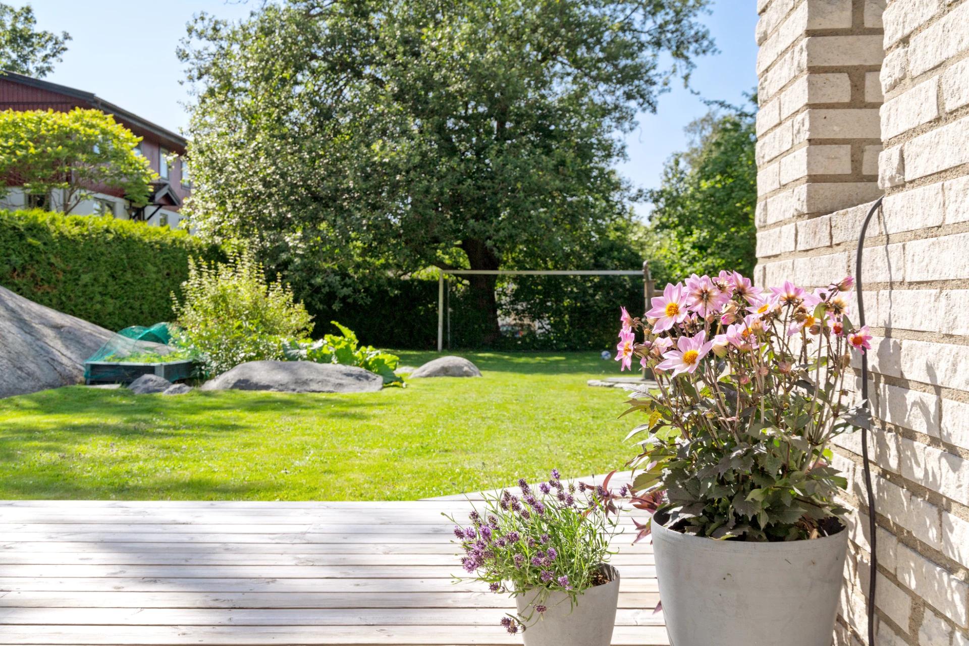Tomten är högt belägen och insynsskyddad, omgiven av grönska och vackra inslag av berg och sten som ger karaktär åt trädgården. Här finns både ett rymligt altandäck och en pergola med tak, inredd med soffa, kuddar och belysning – en rofylld plats att njuta av under sommarens kvällar. Nedanför huset finns en parkering med plats för 3–4 bilar samt elbilsladdare. Huset är utrustat med solpaneler och batteri, vilket ger låga driftkostnader.