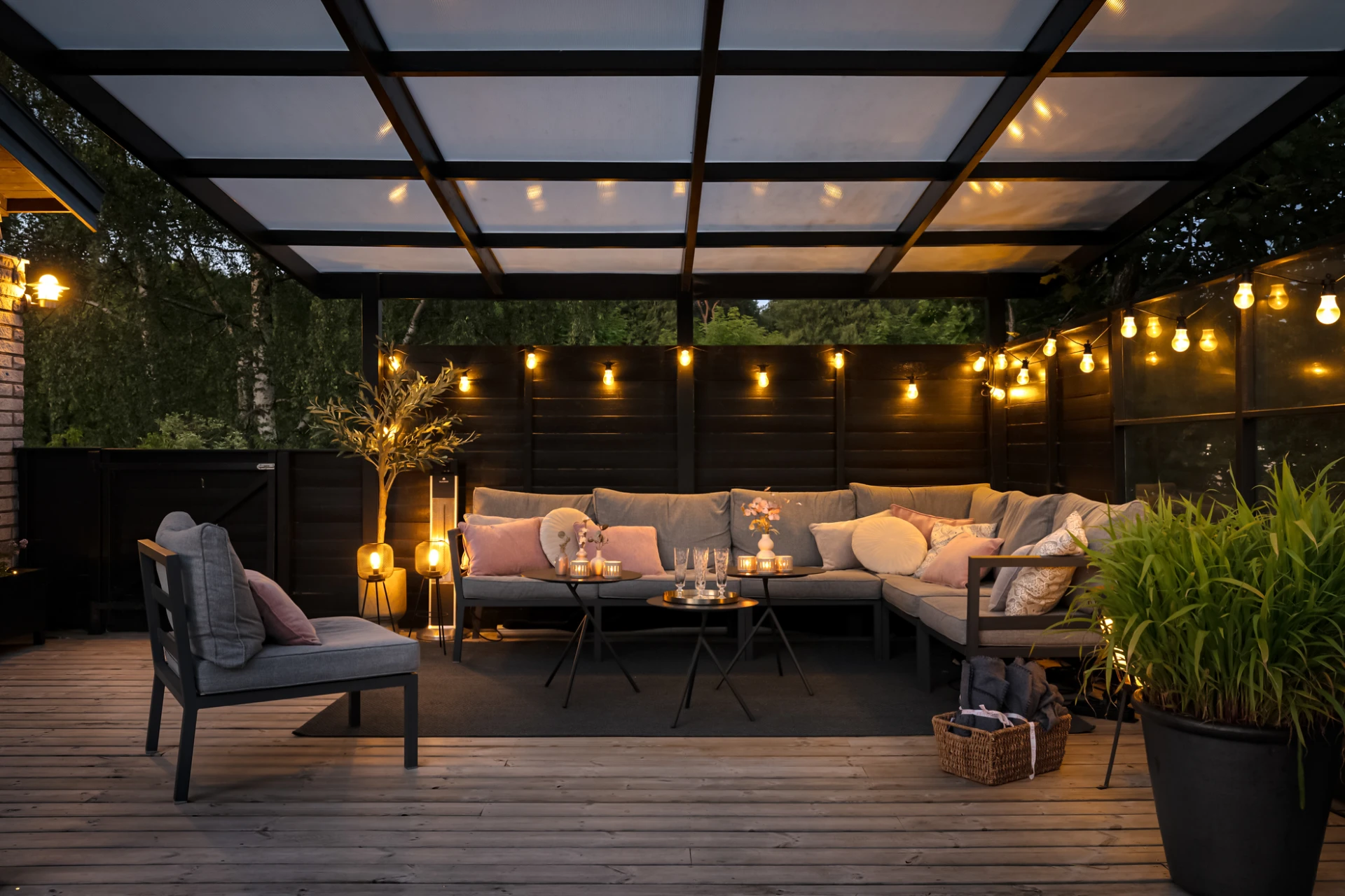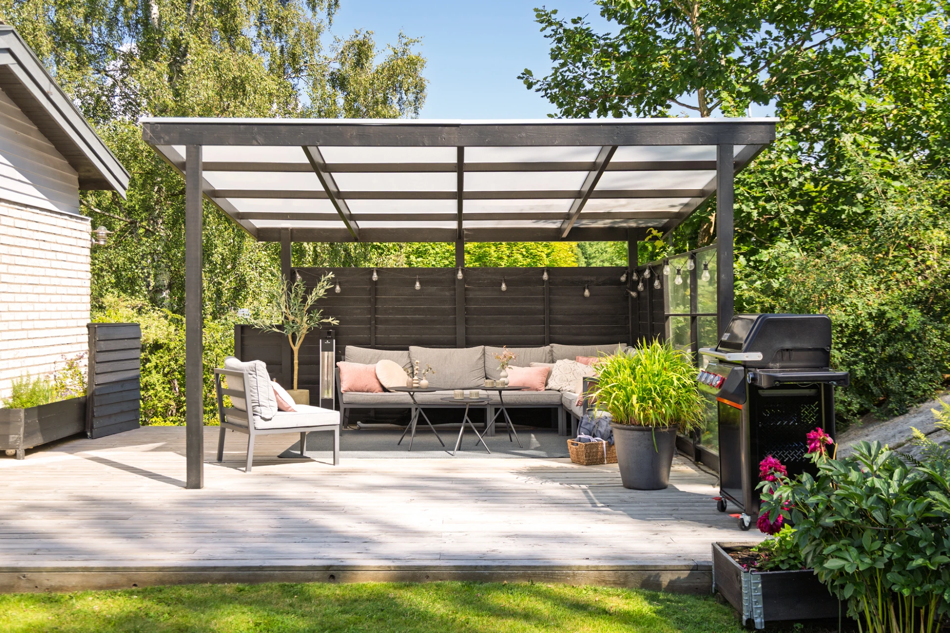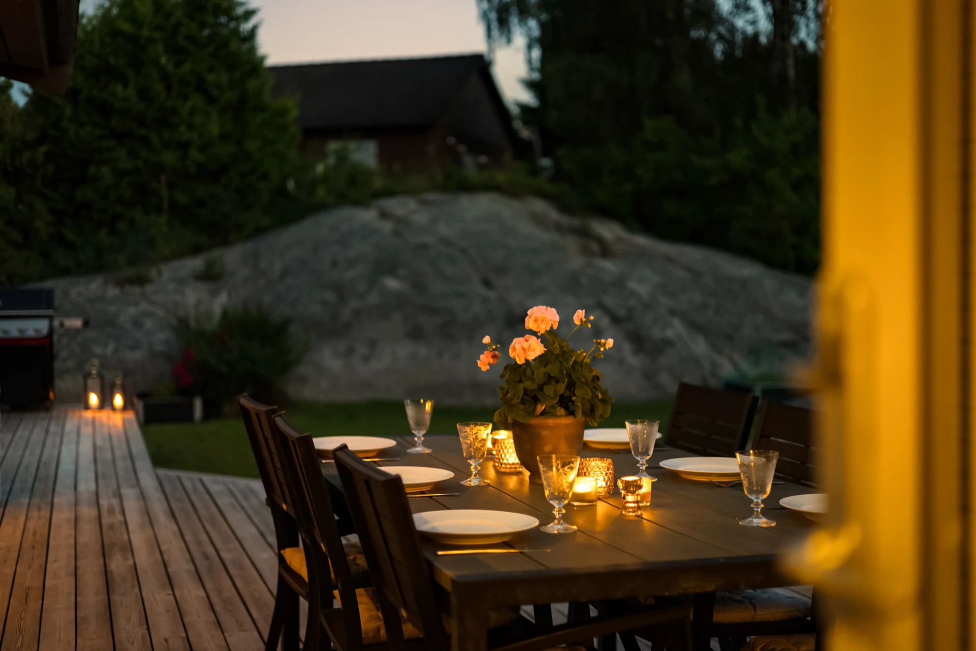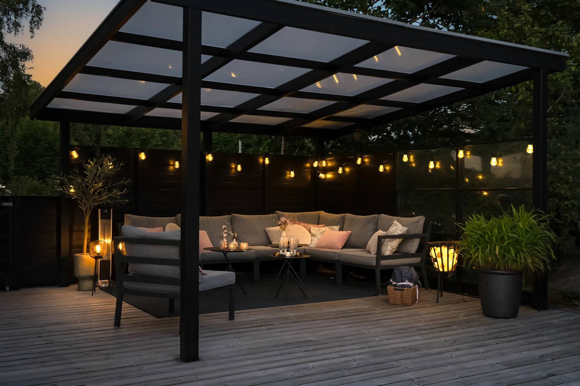 Tomten är högt belägen och insynsskyddad, omgiven av grönska och vackra inslag av berg och sten som ger karaktär åt trädgården. Här finns både ett rymligt altandäck och en pergola med tak, inredd med soffa, kuddar och belysning – en rofylld plats att njuta av under sommarens kvällar. Nedanför huset finns en parkering med plats för 3–4 bilar samt elbilsladdare. Huset är utrustat med solpaneler och batteri, vilket ger låga driftkostnader.