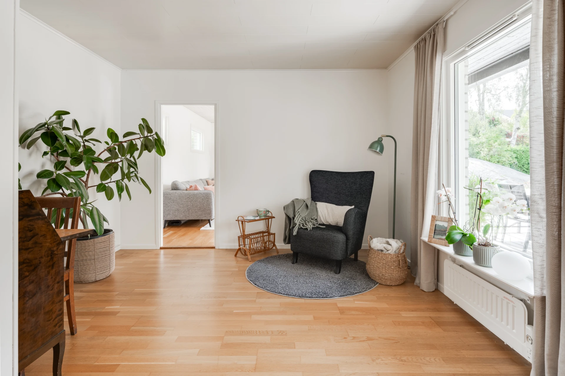 Parkettgolv och målade väggar. Här finns plats för soffgrupp med tillhörande möblemang.