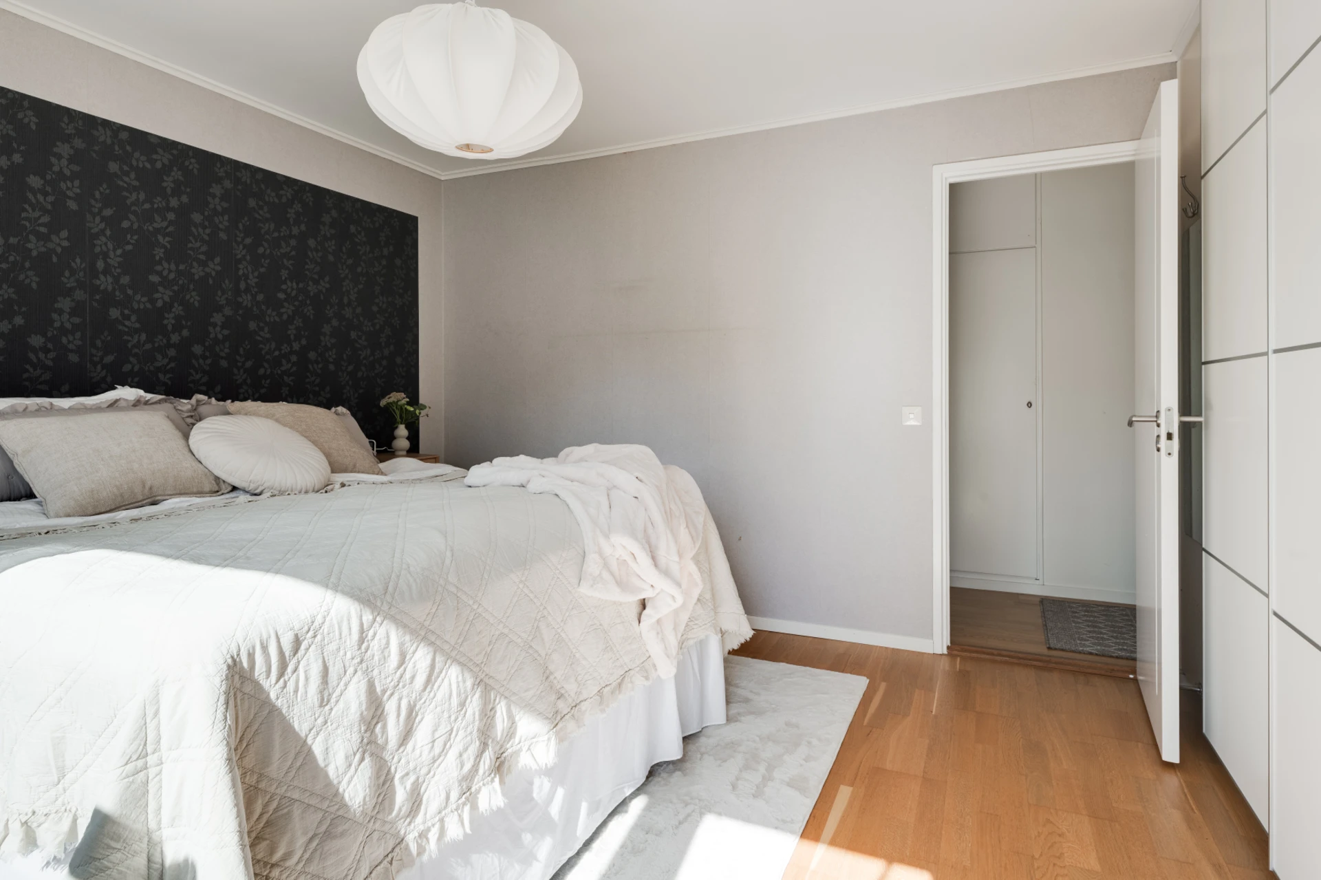 Parkettgolv och väggar i tapet. Här finns plats för säng med tillhörande möblemang. Förvaring sker i garderober med skjutdörrar.