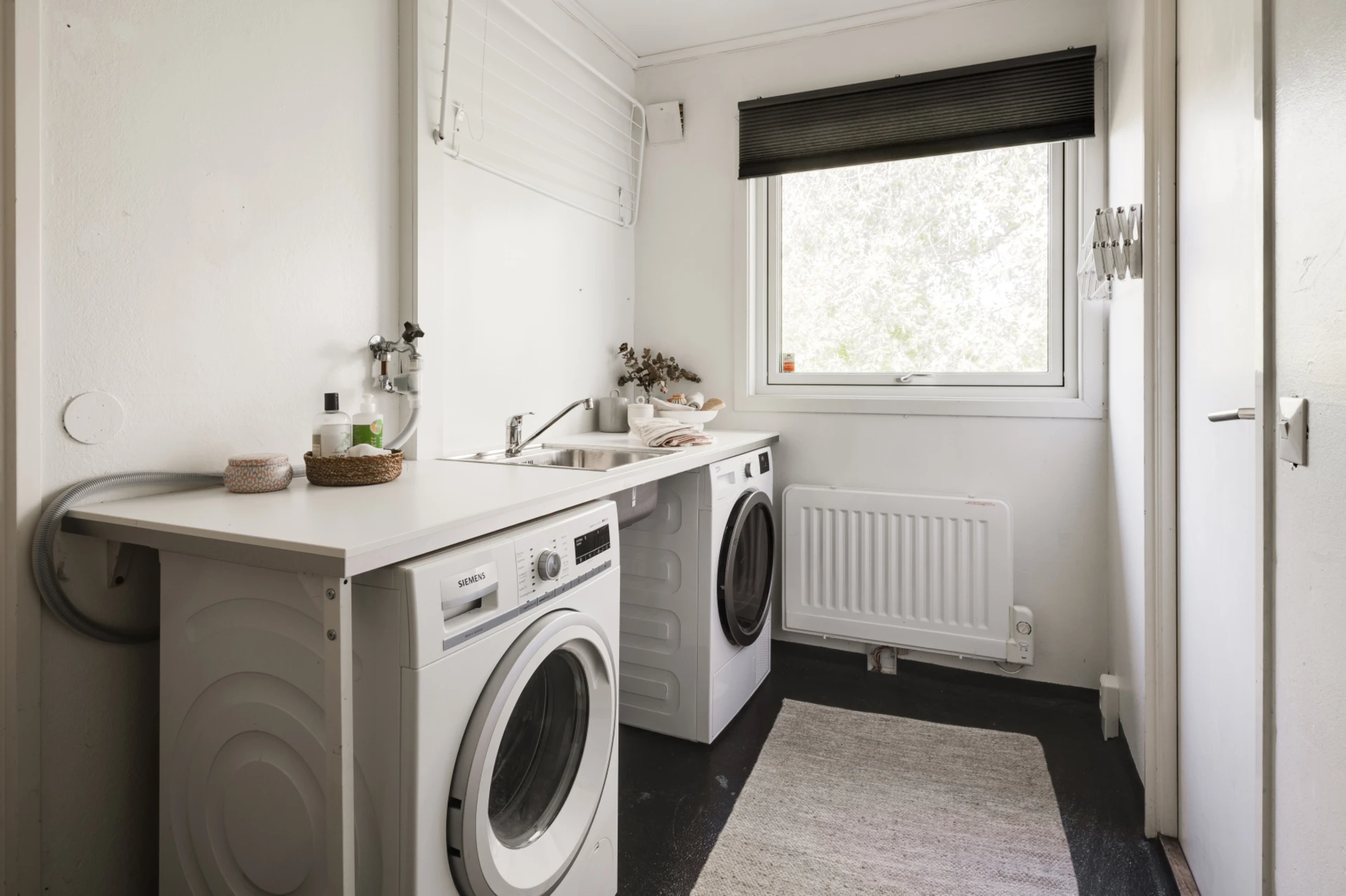 Utrustad med tvättmaskin, torktumlare och arbetsbänk.