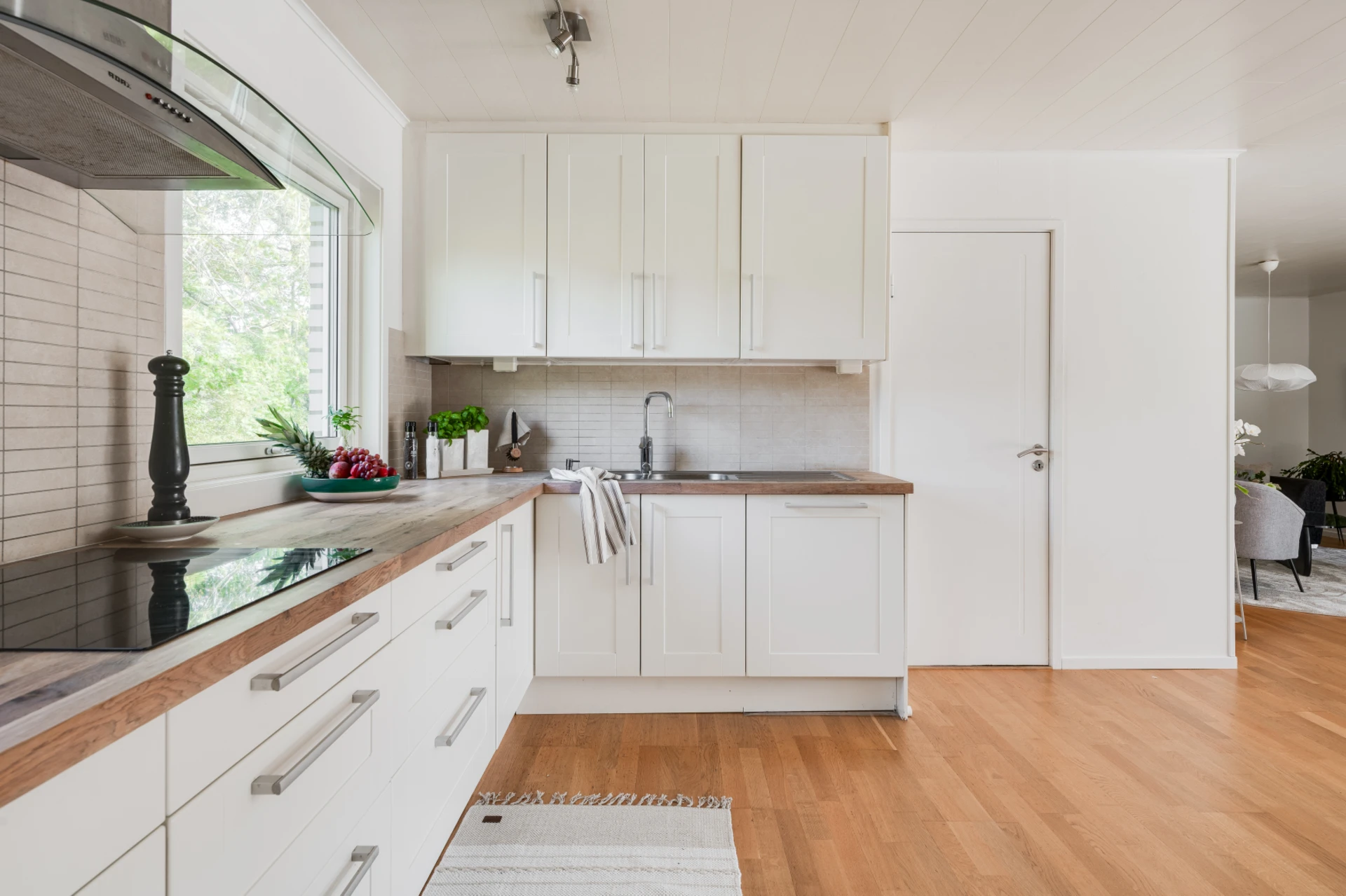 Parkettgolv och målade väggar. Köksinredning i vitt och ovan arbetsbänken i trä sitter kakel. Vitvarorna består av kyl och frys i fullhöjd, diskmaskin, induktionshäll, köksfläkt samt inbyggnadsugn och mikro. Här finns matplats för ca 10 personer. Utgång till bostadens altan. I taket sitter dimbar belysning.