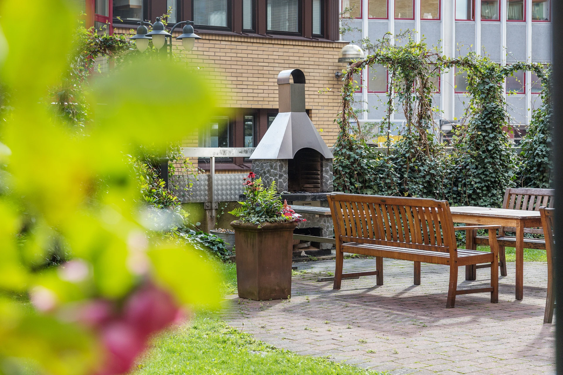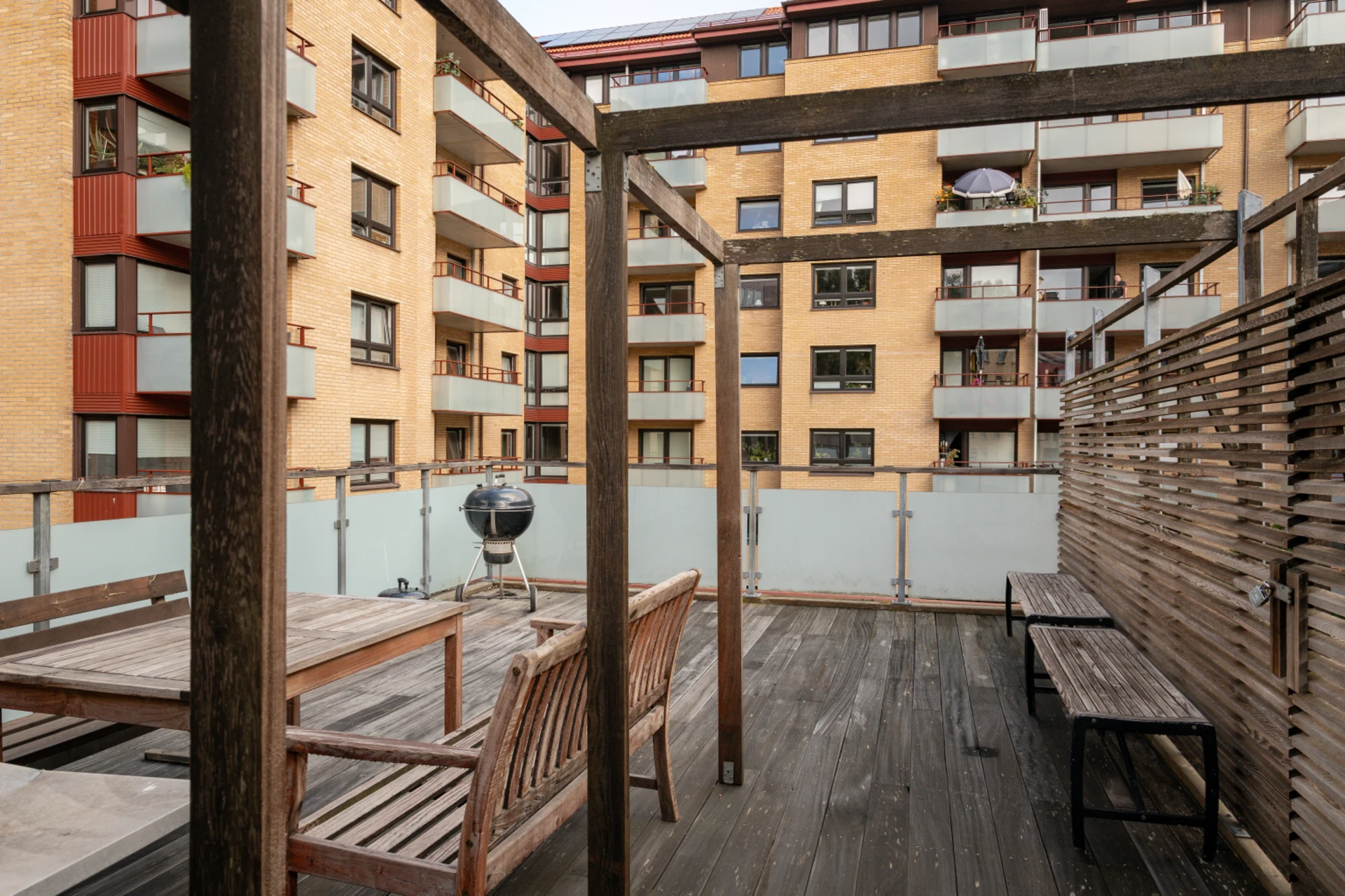 Föreningen har en gemensam grönskande innergård med utemöbler och grill samt en härlig takterrass på Fjärde Långgatan 41.