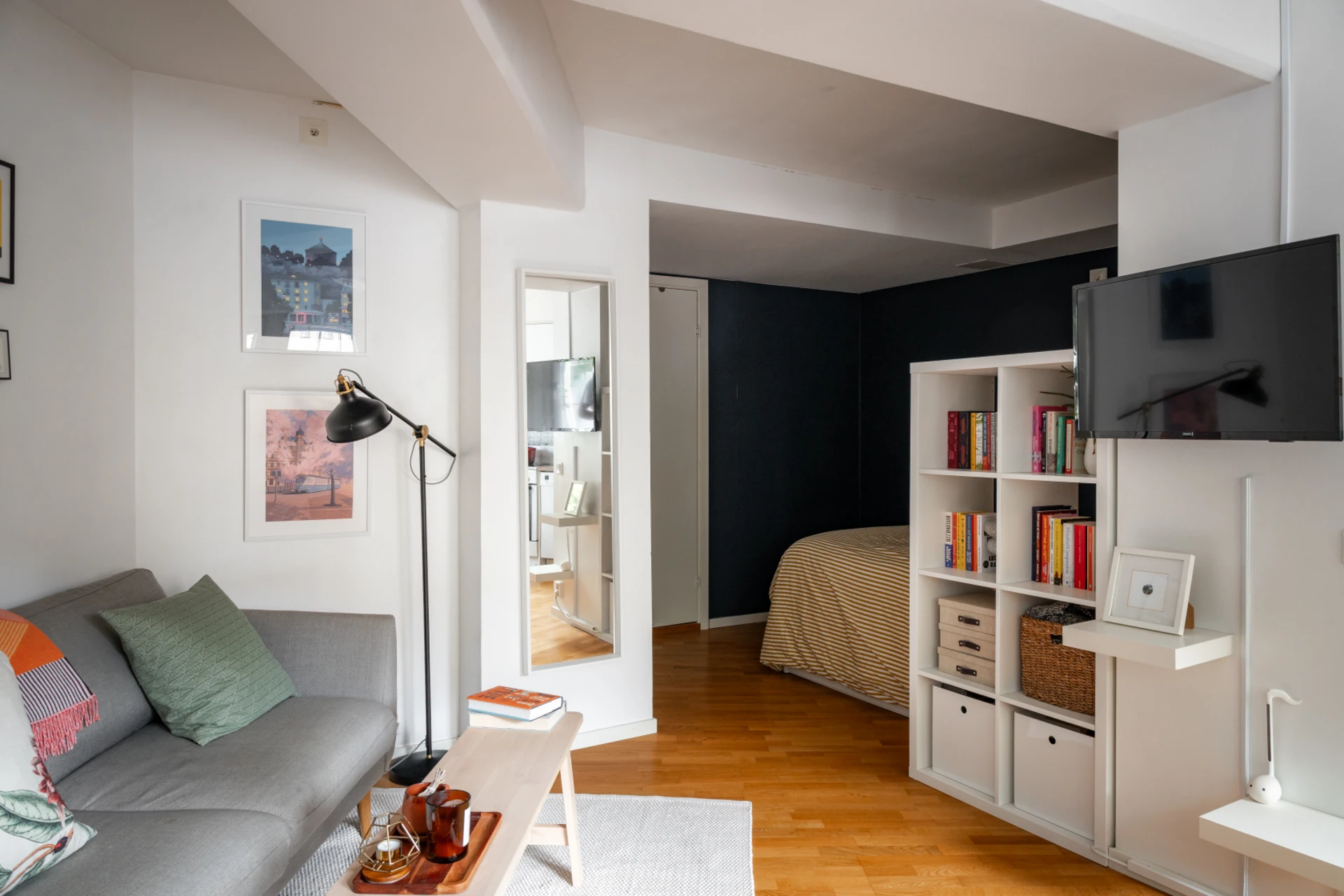 Ekparkettgolv och vitmålade väggar. Här finns plats för mindre soffgrupp med tillhörande möblemang. Öppet mot kök och sovalkov.