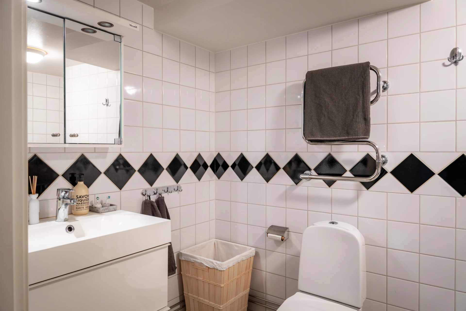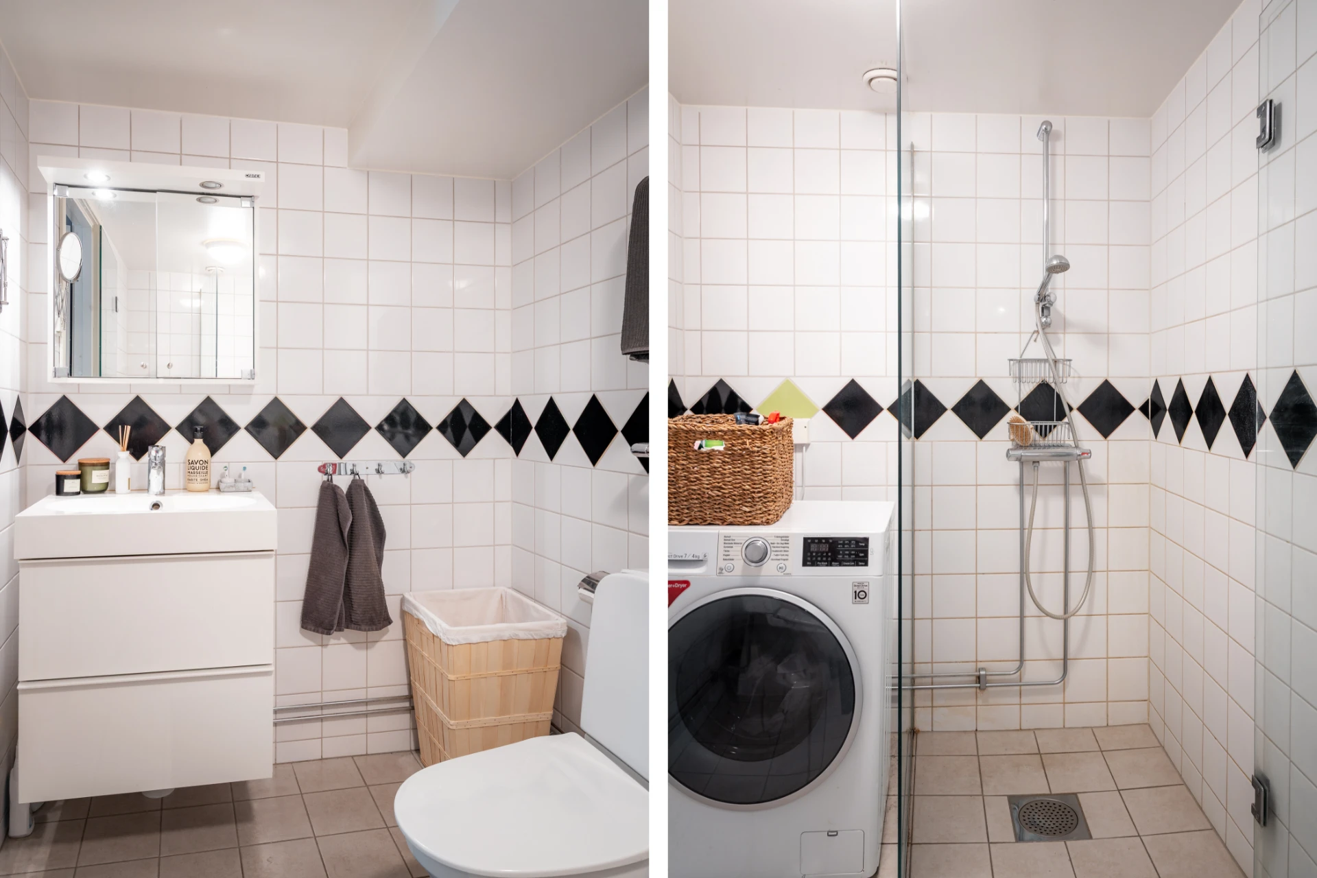 Klinkergolv i en beige nyans med golvvärme och vita helkaklade väggar med svart mönster. Badrummet är utrustat med WC, handfat med kommod, spegelskåp, dusch med glasdörrar, handdukstork samt kombinerad tvättmaskin och torktumlare.