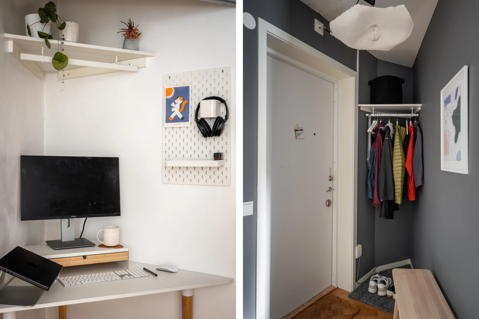 Ekparkettgolv och målade väggar i en mörk kulör samt vita väggar. Här finns plats för avhängning och en mindre arbetshörna.