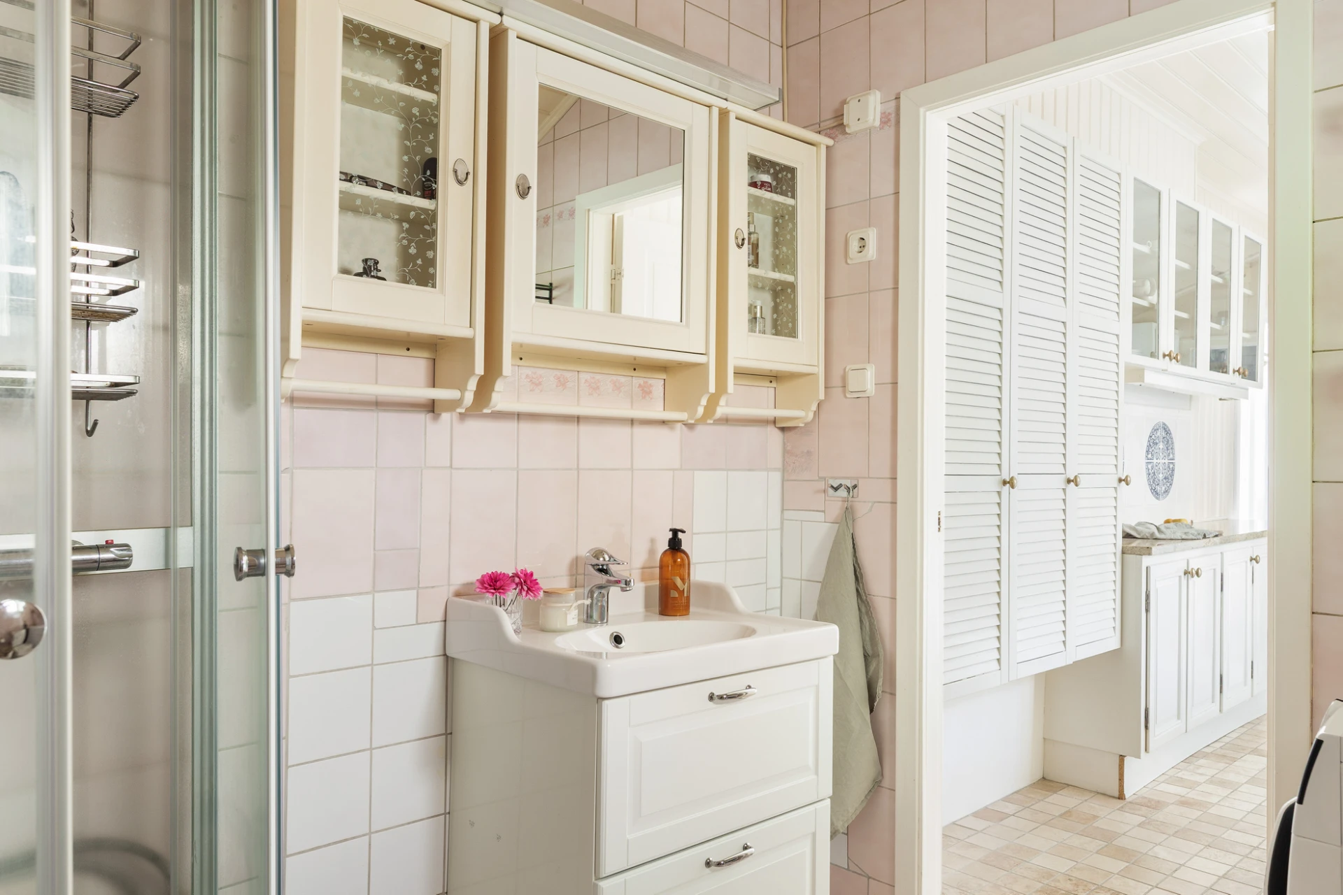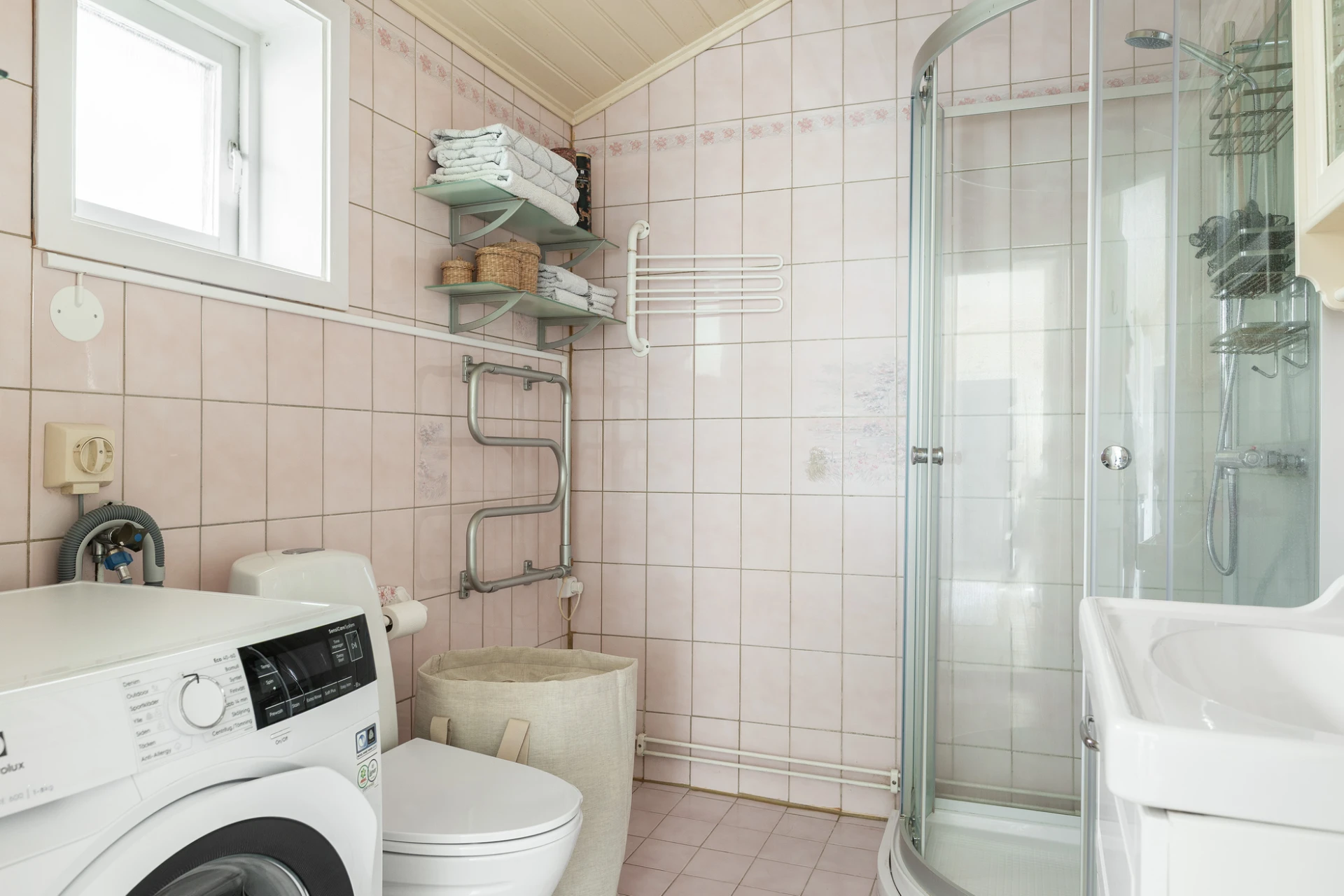 Klinkergolv i en rosa nyans med golvvärme och rosa helkaklade väggar. Badrummet är utrustat med WC, handfat med kommod, spegelskåp, duschkabin, handdukstork samt tvättmaskin. Badrummet nås via köket.