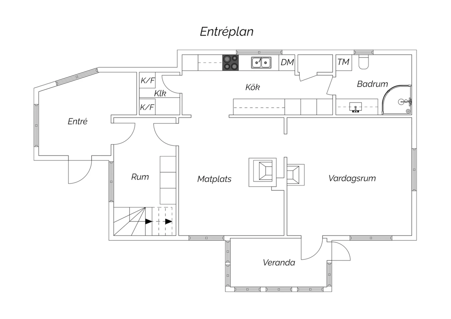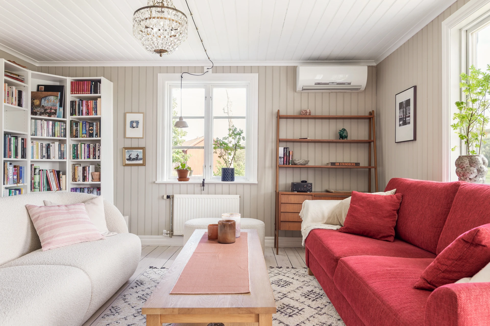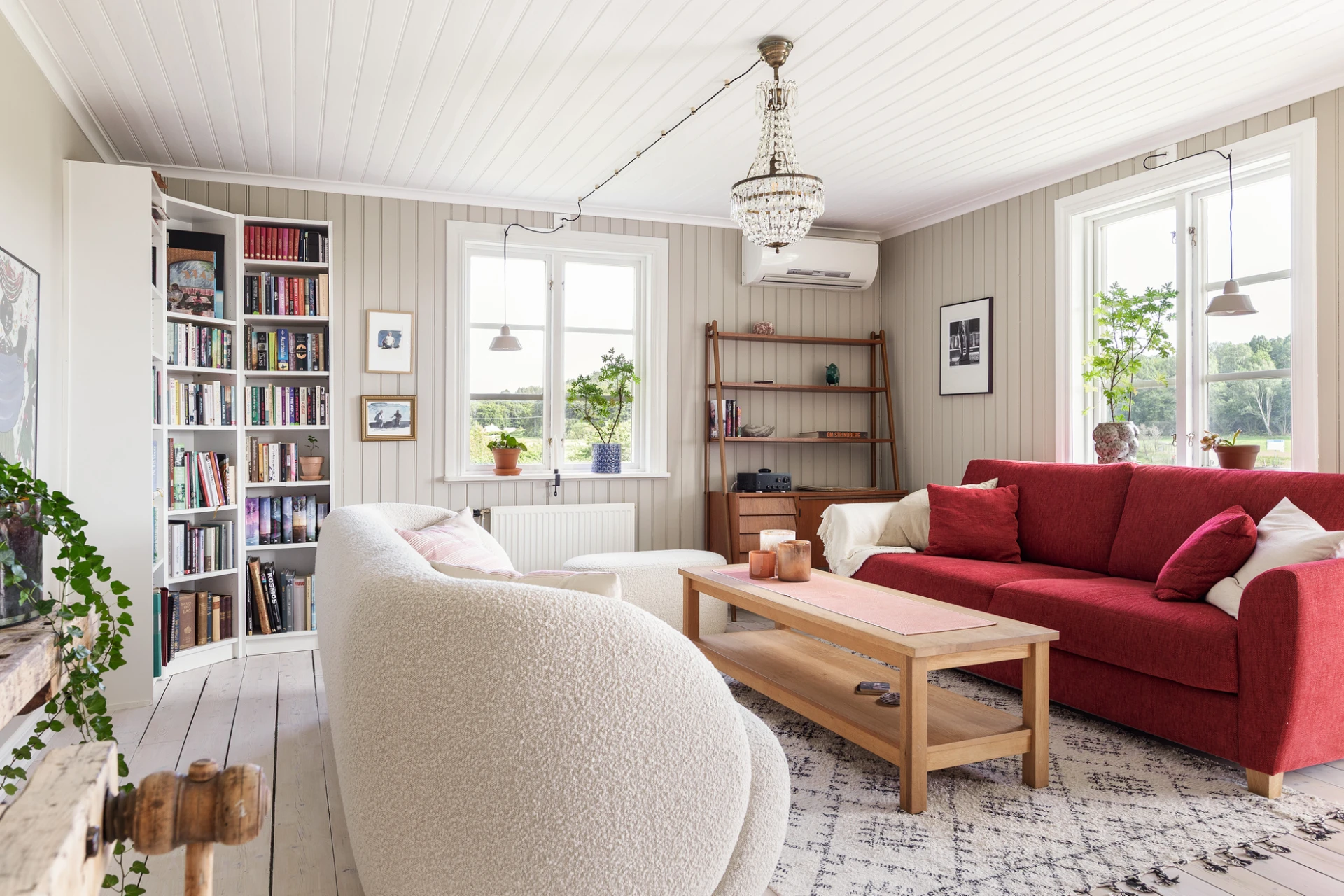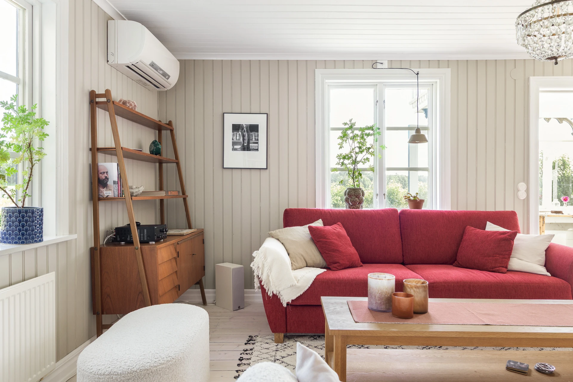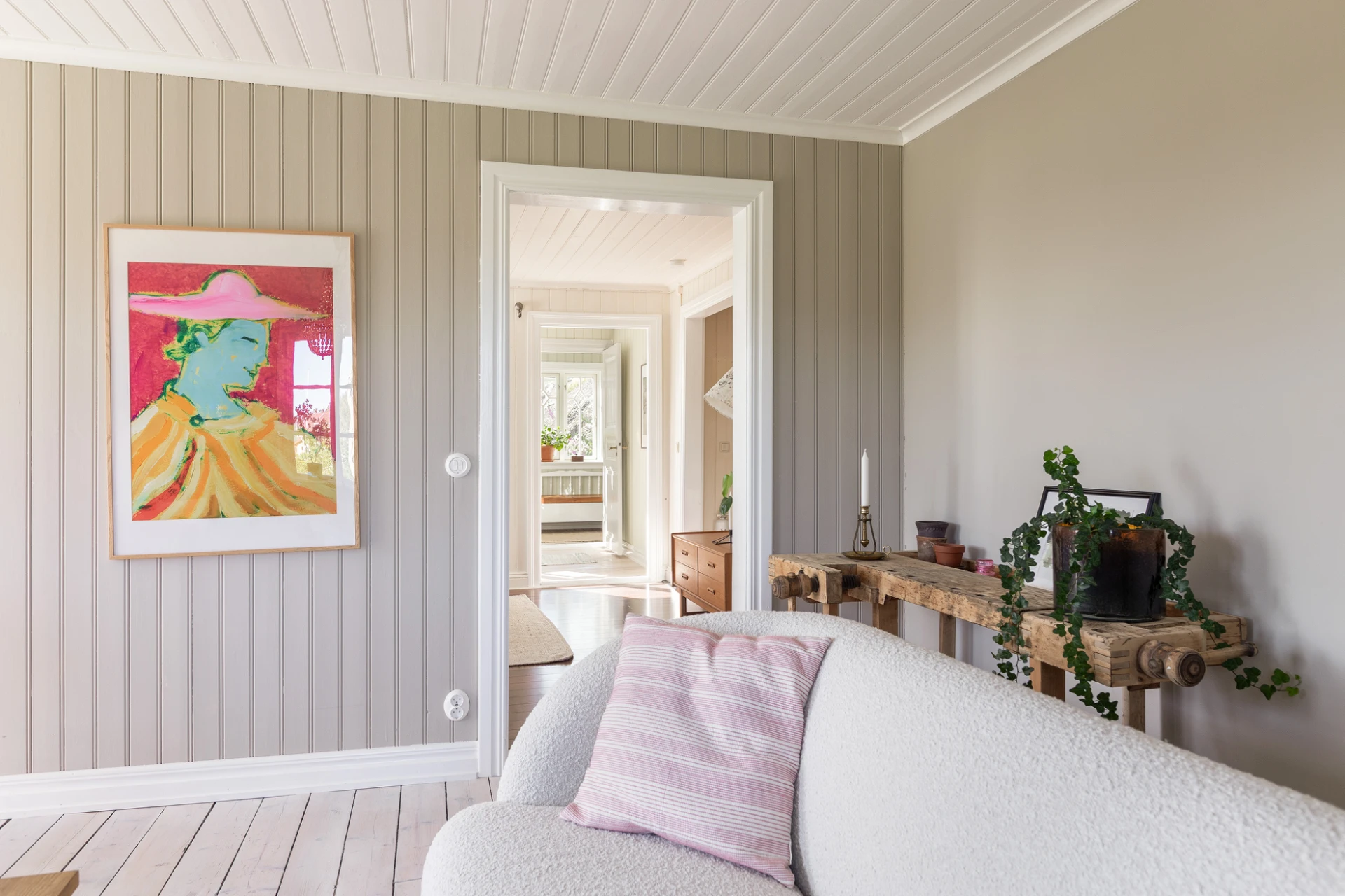 Plankgolv med vitpigmenterad hårdvaxolja och väggar med pärlspont målade i kulören greige helmatt. Här finns plats för soffgrupp med tillhörande möblemang. Härifrån nås även bostadens inglasade uterum som har utgång till trädgården.