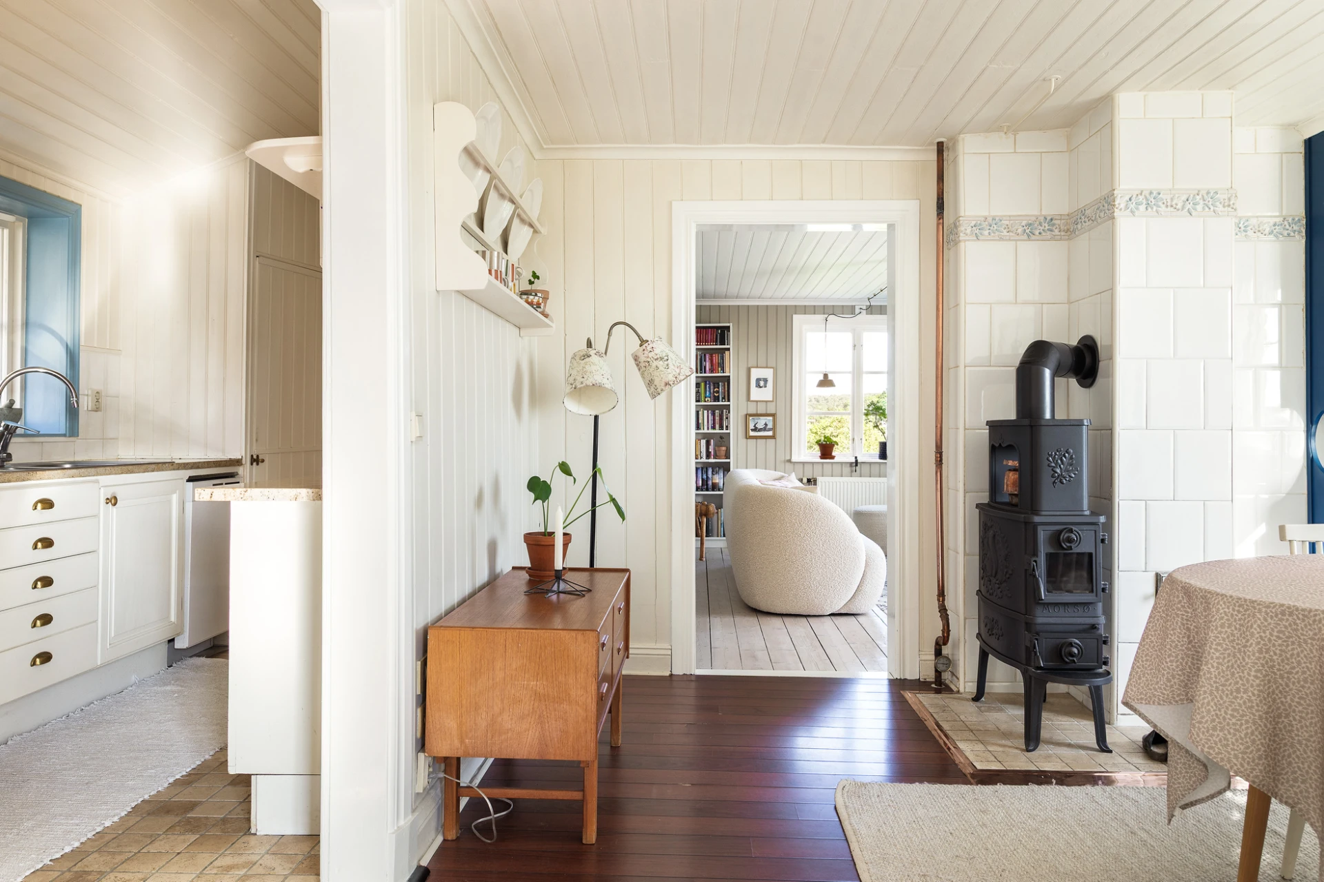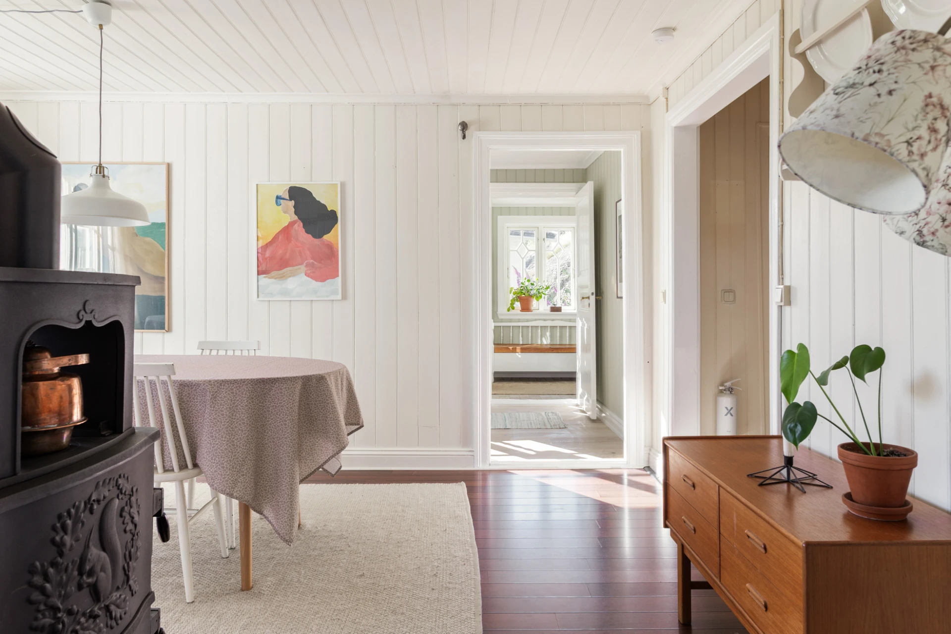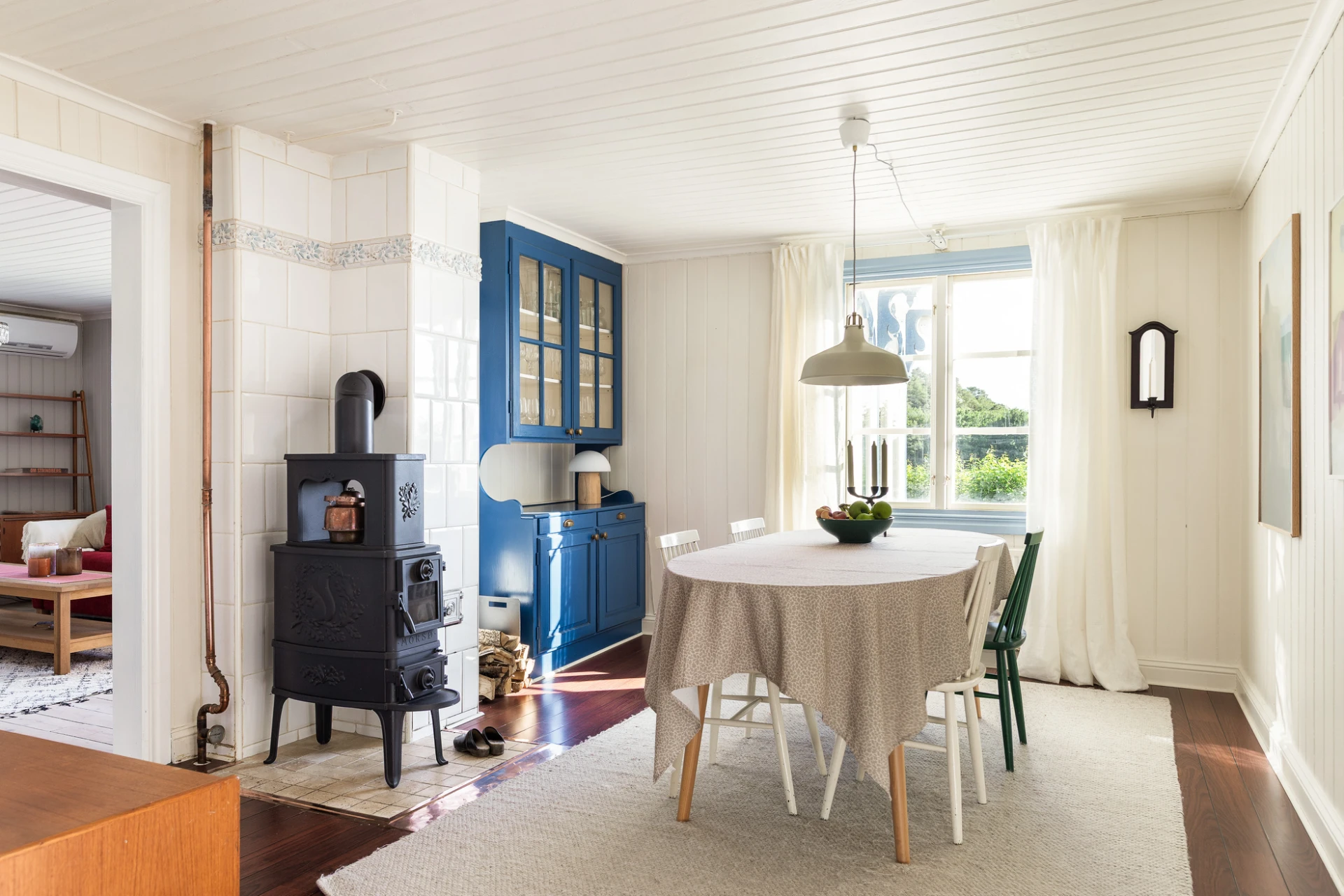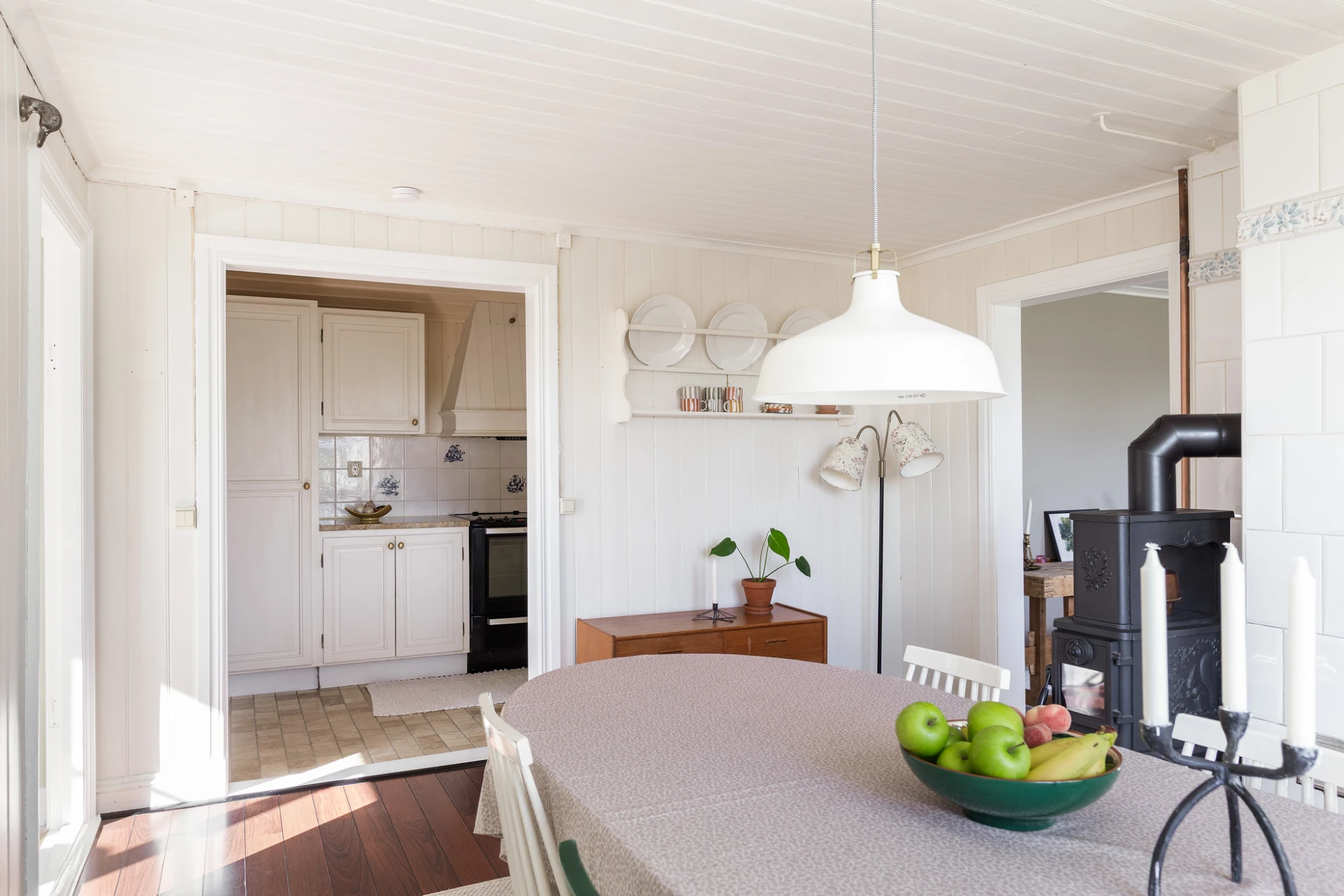 Golv i brunt material och väggar med vit pärlspont i original. Här finns plats för matbord för 6-8 personer. Förvaring finns i platsbyggt vitrinskåp.