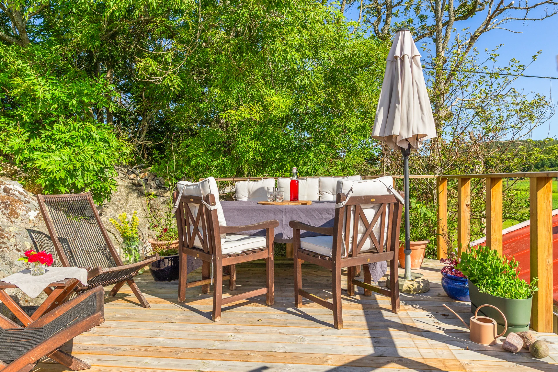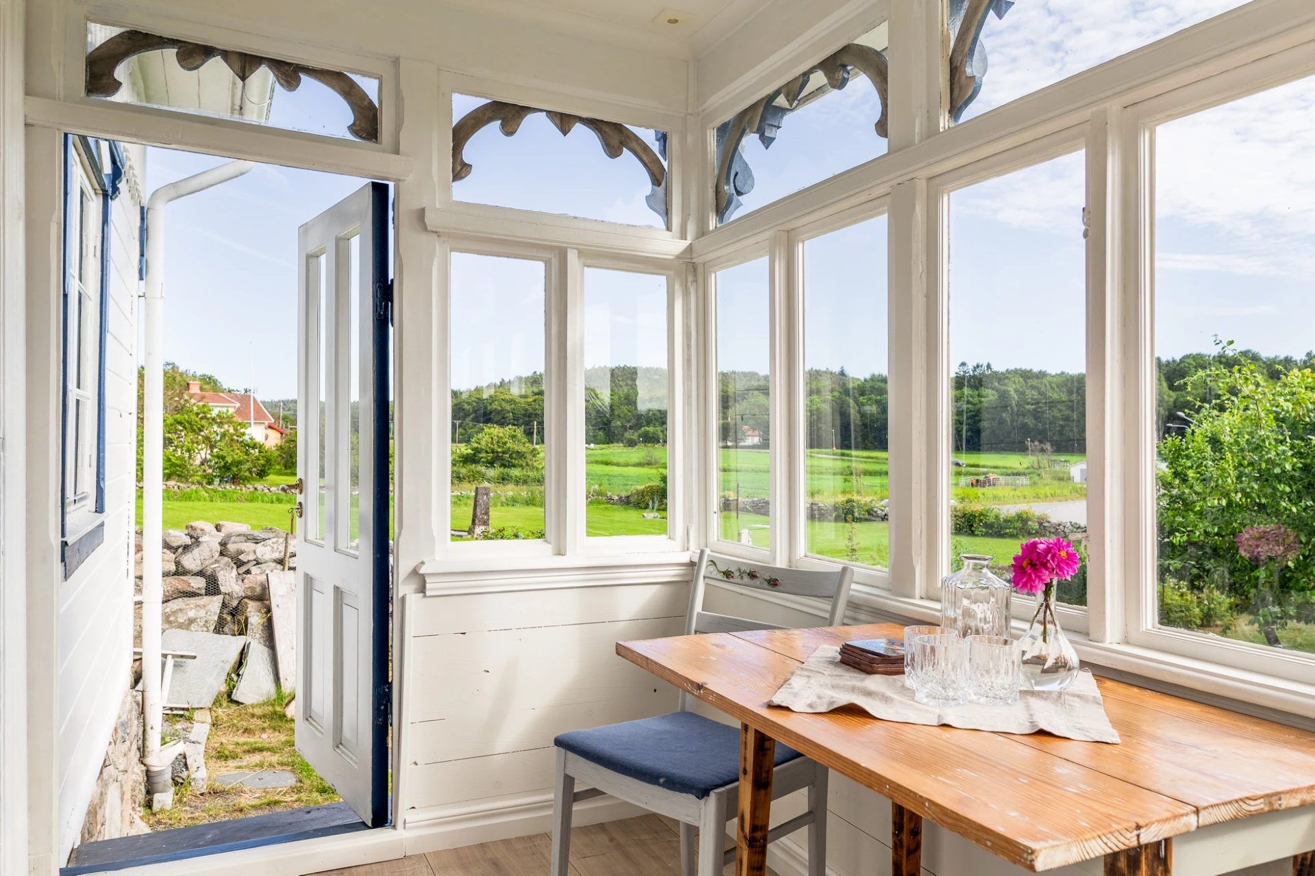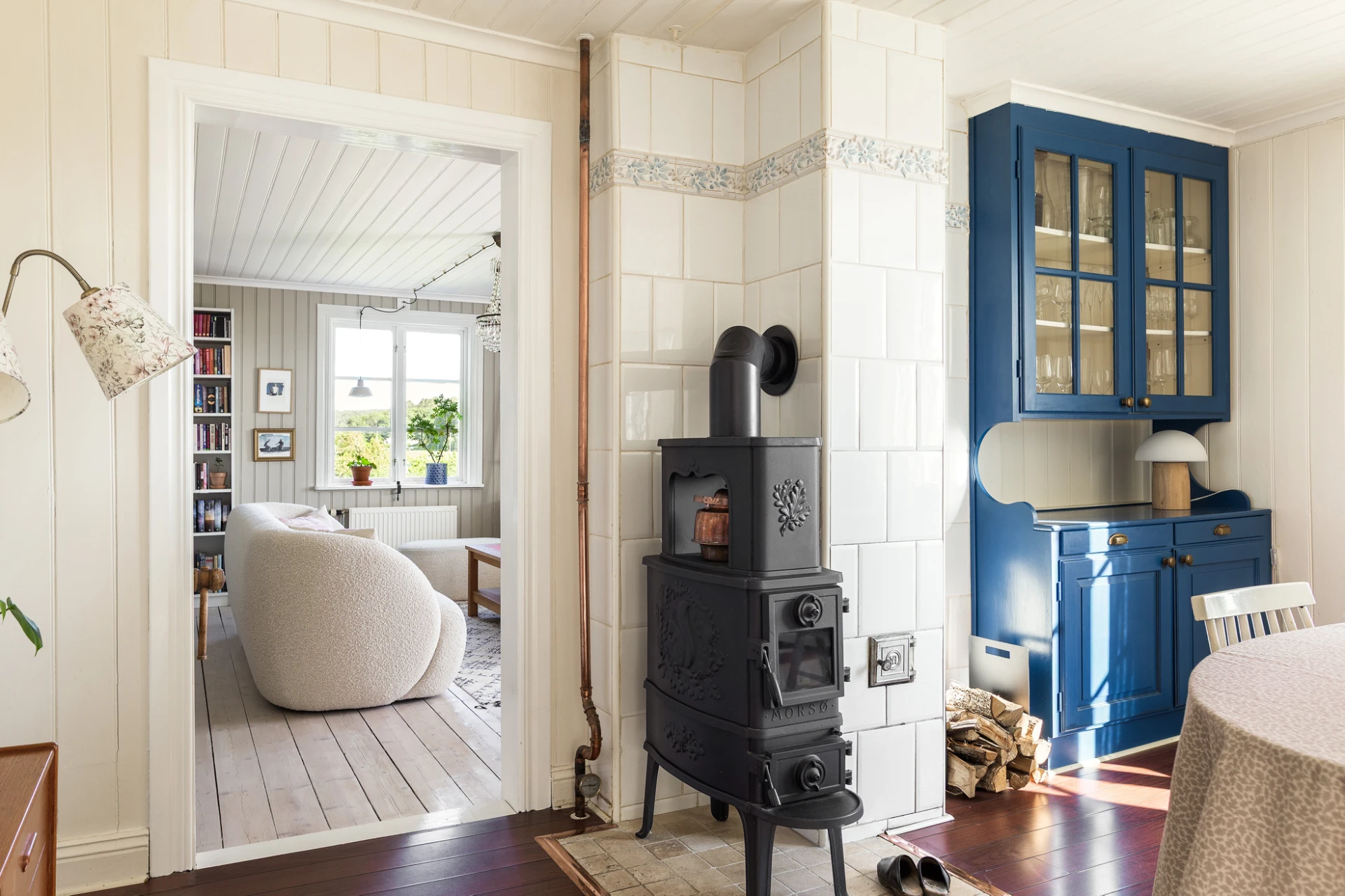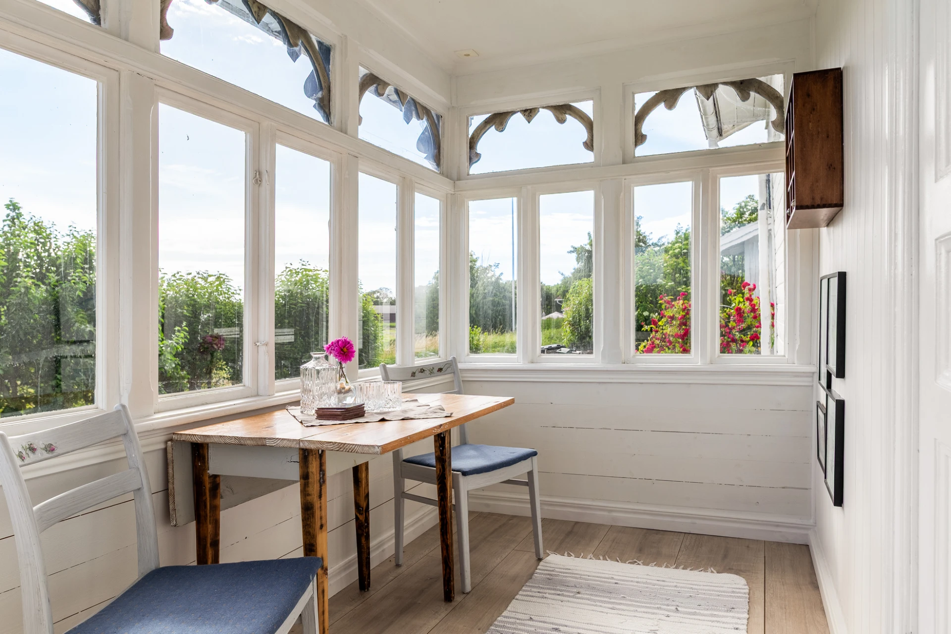 Golv i brunt material och väggar med vit pärlspont i original. Här finns plats för matbord för 6-8 personer. Förvaring finns i platsbyggt vitrinskåp.