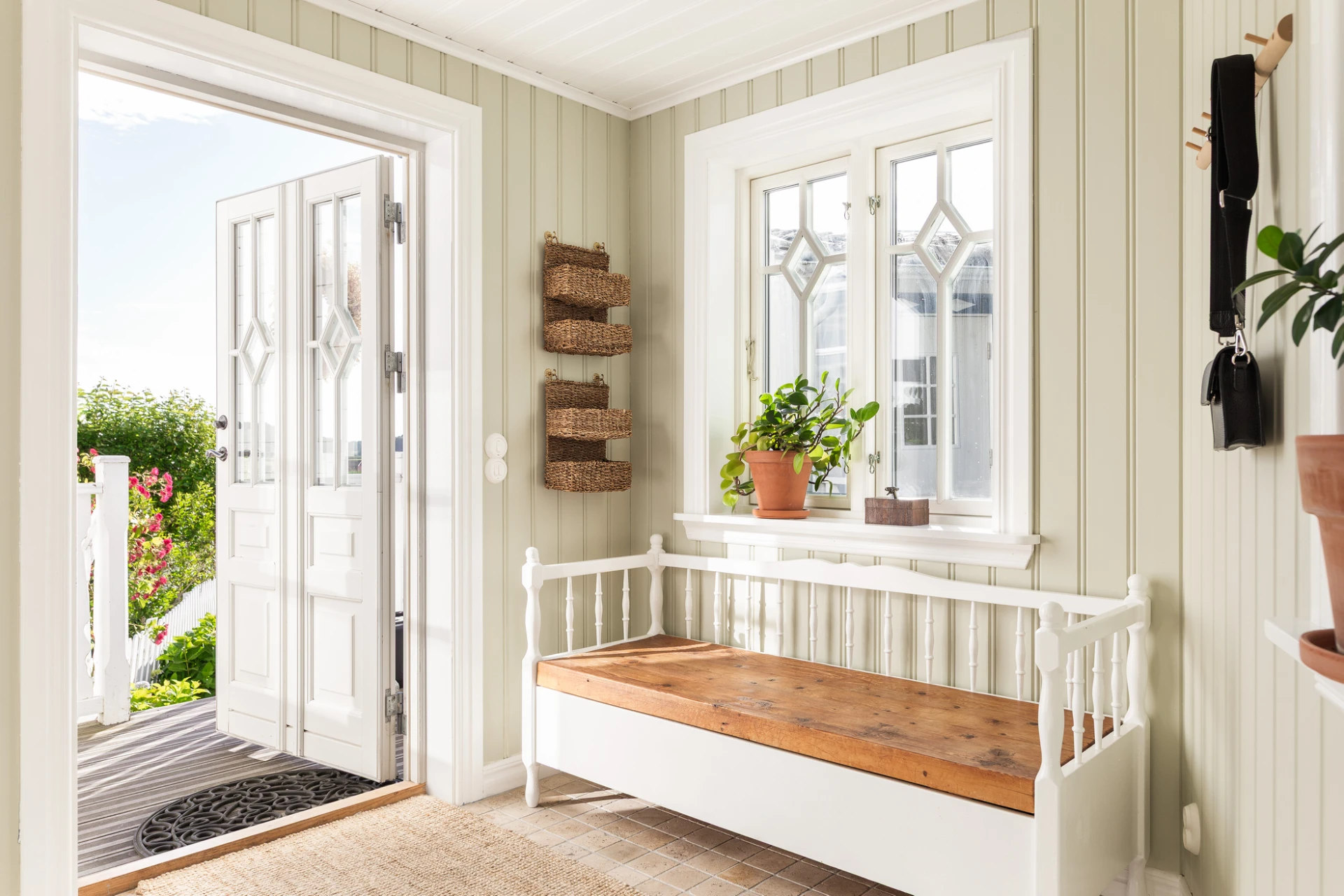 Klinkergolv i sandfärgad nyans och väggar i en ljusgrön nyans. Här finns plats för avhängning och förvaring i garderober.