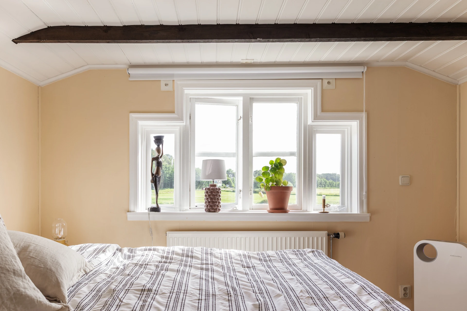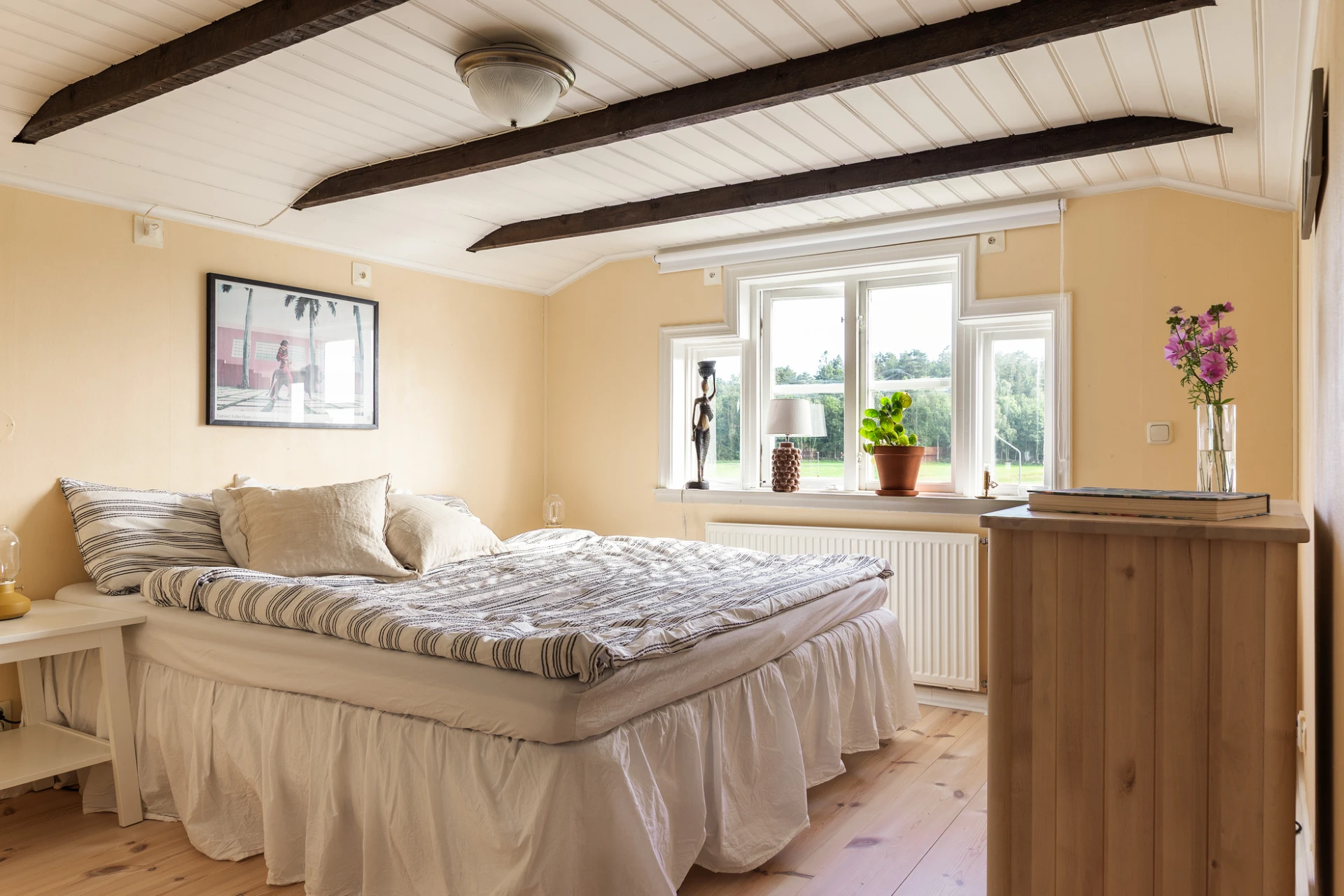 Vitoljat furugolv och väggar i en gul kulör. Här finns plats för dubbelsäng med tillhörande möblemang samt förvaringsmöbel.
