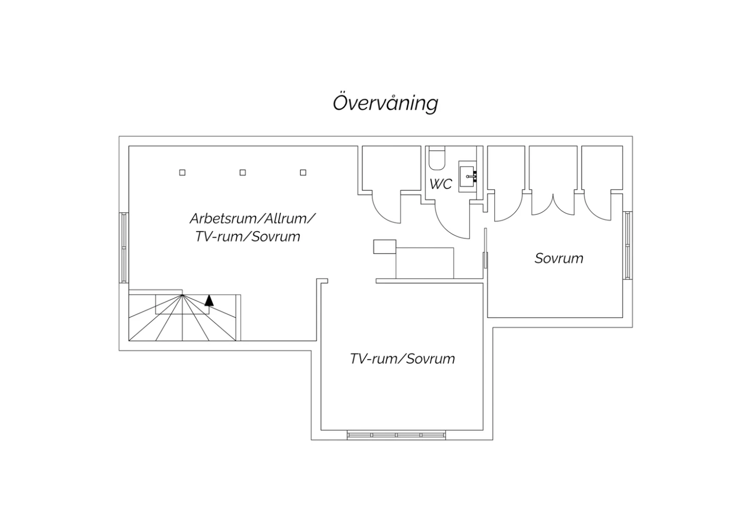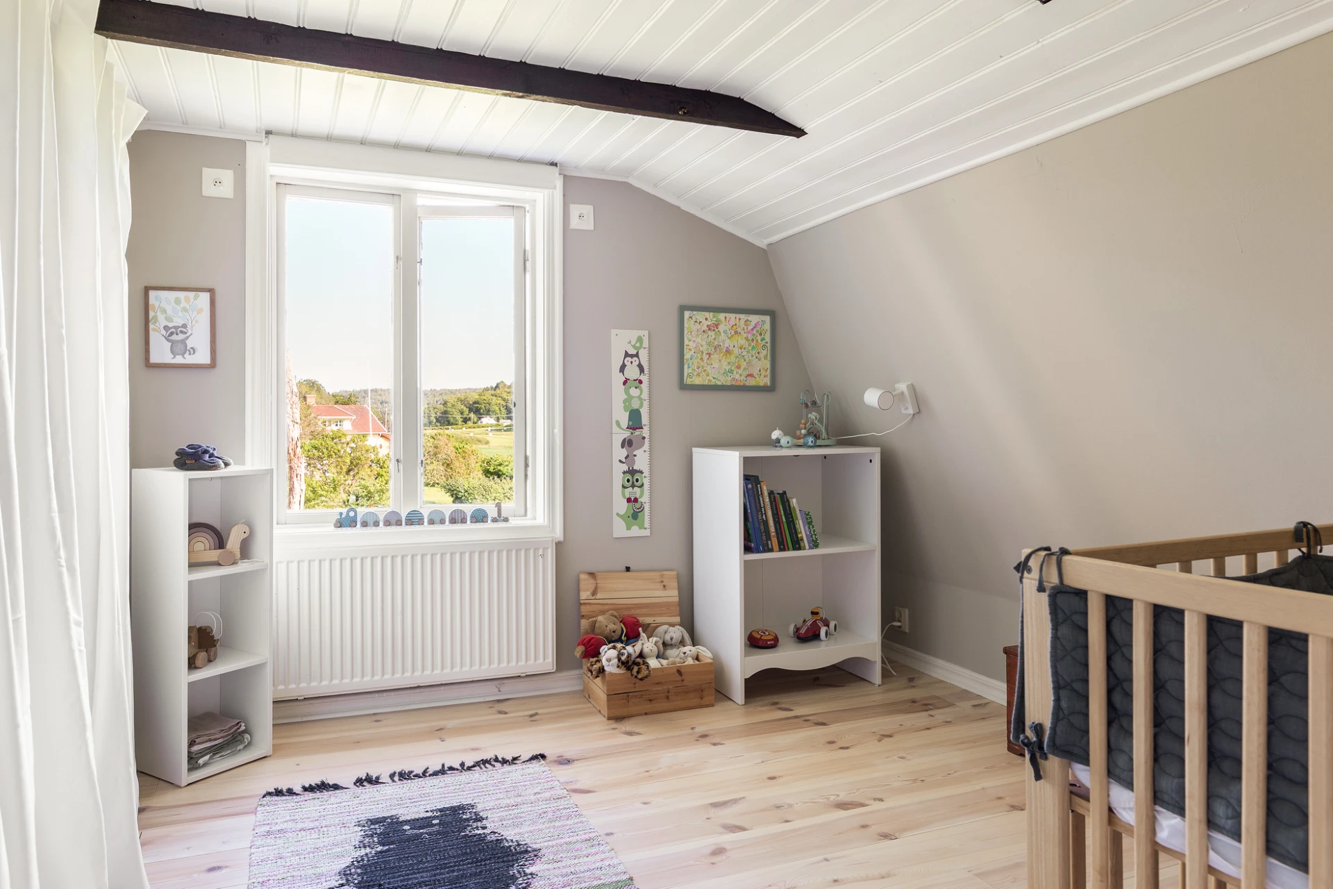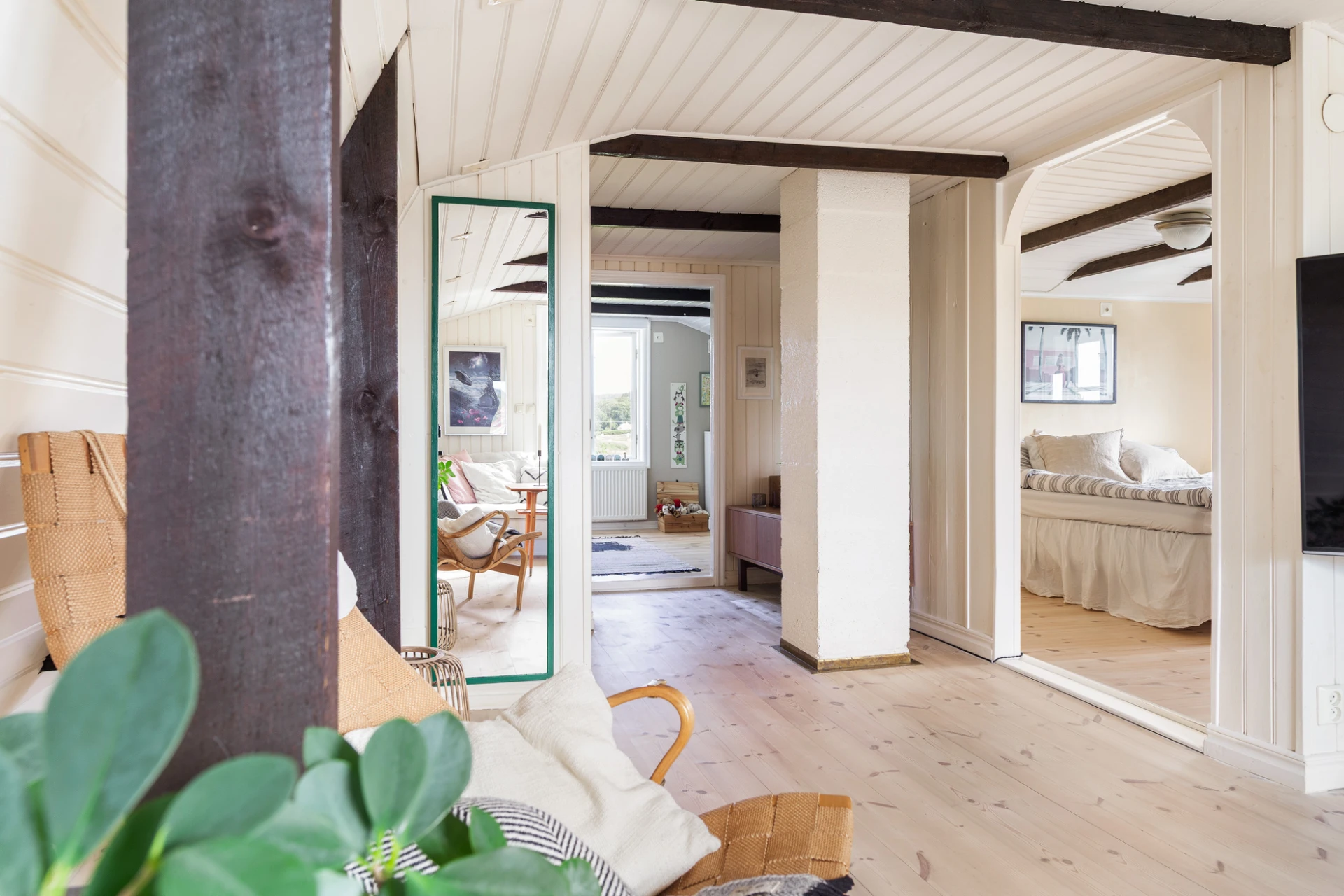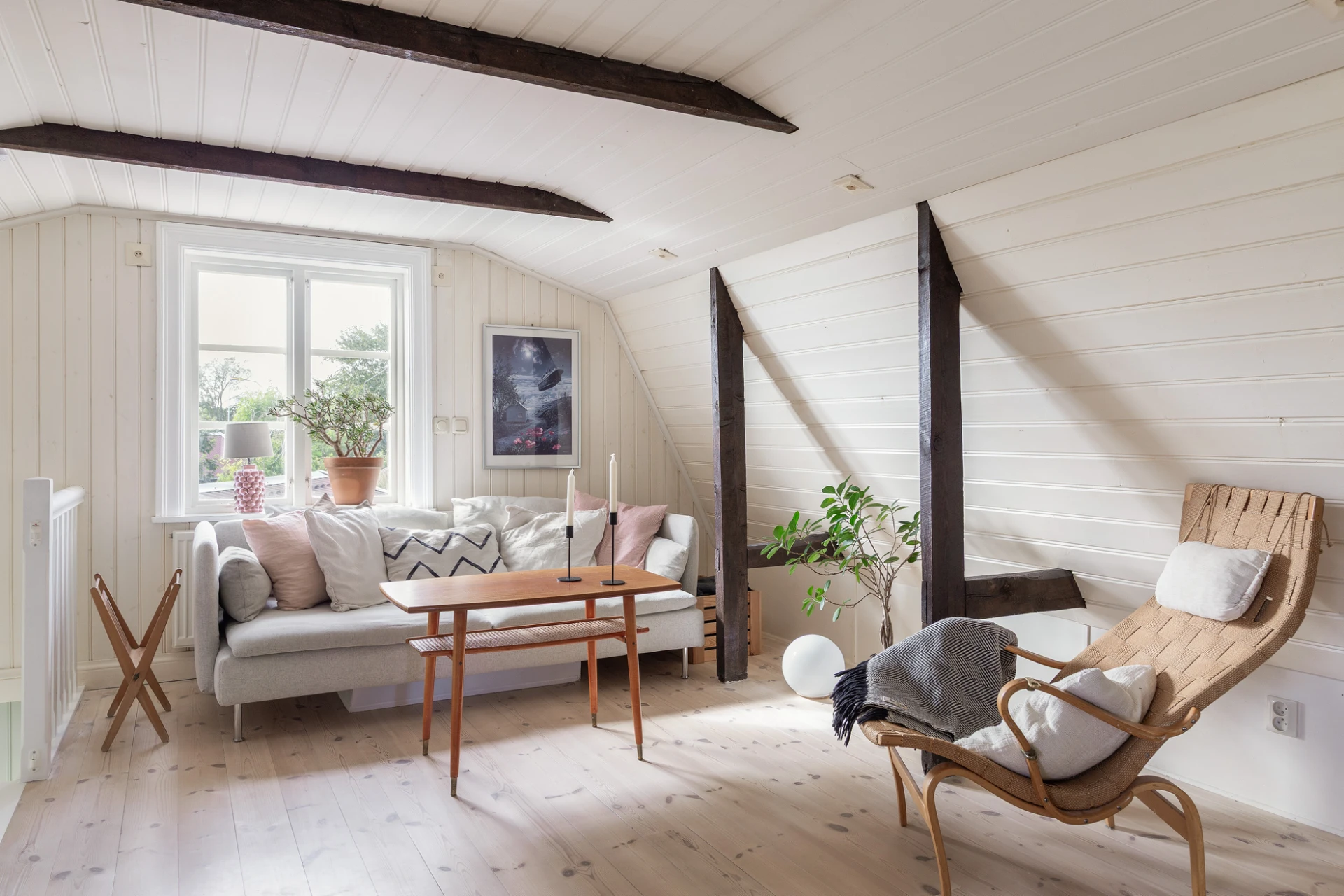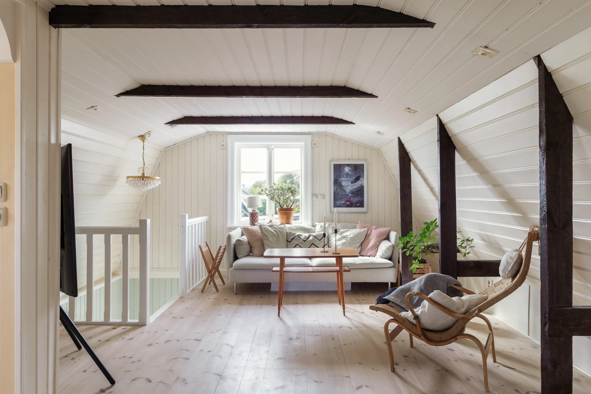 Vitoljat plankgolv och väggar med vit pärlspont. Här finns plats för soffgrupp med tillhörande möblemang samt läshörna för den som önskar. Används idag som tv-rum.