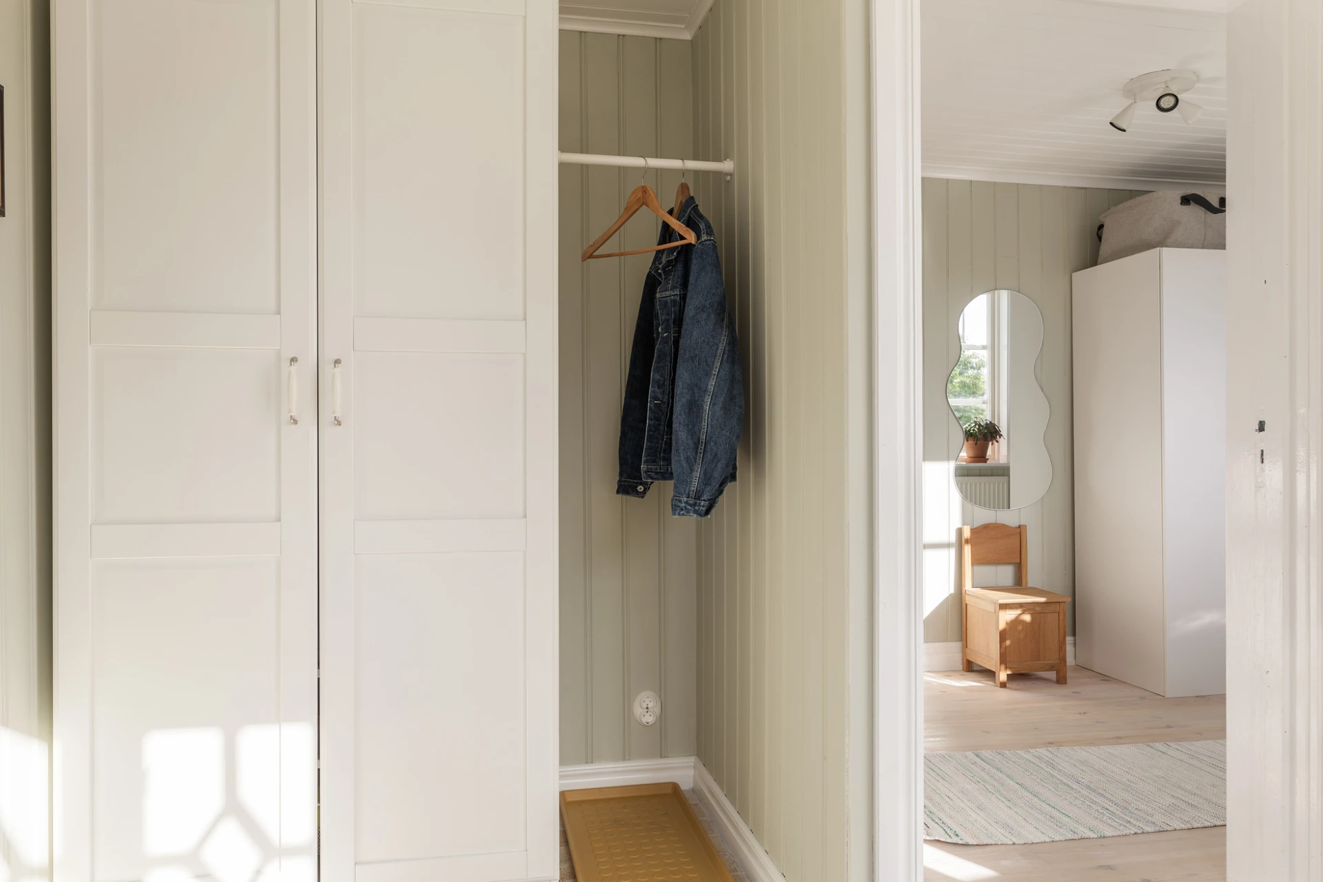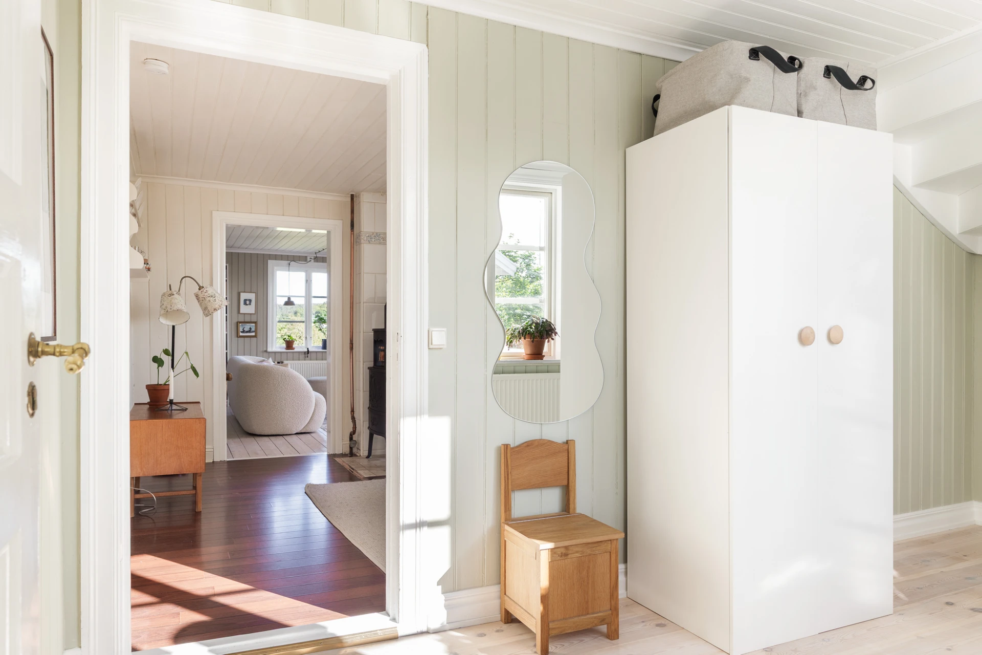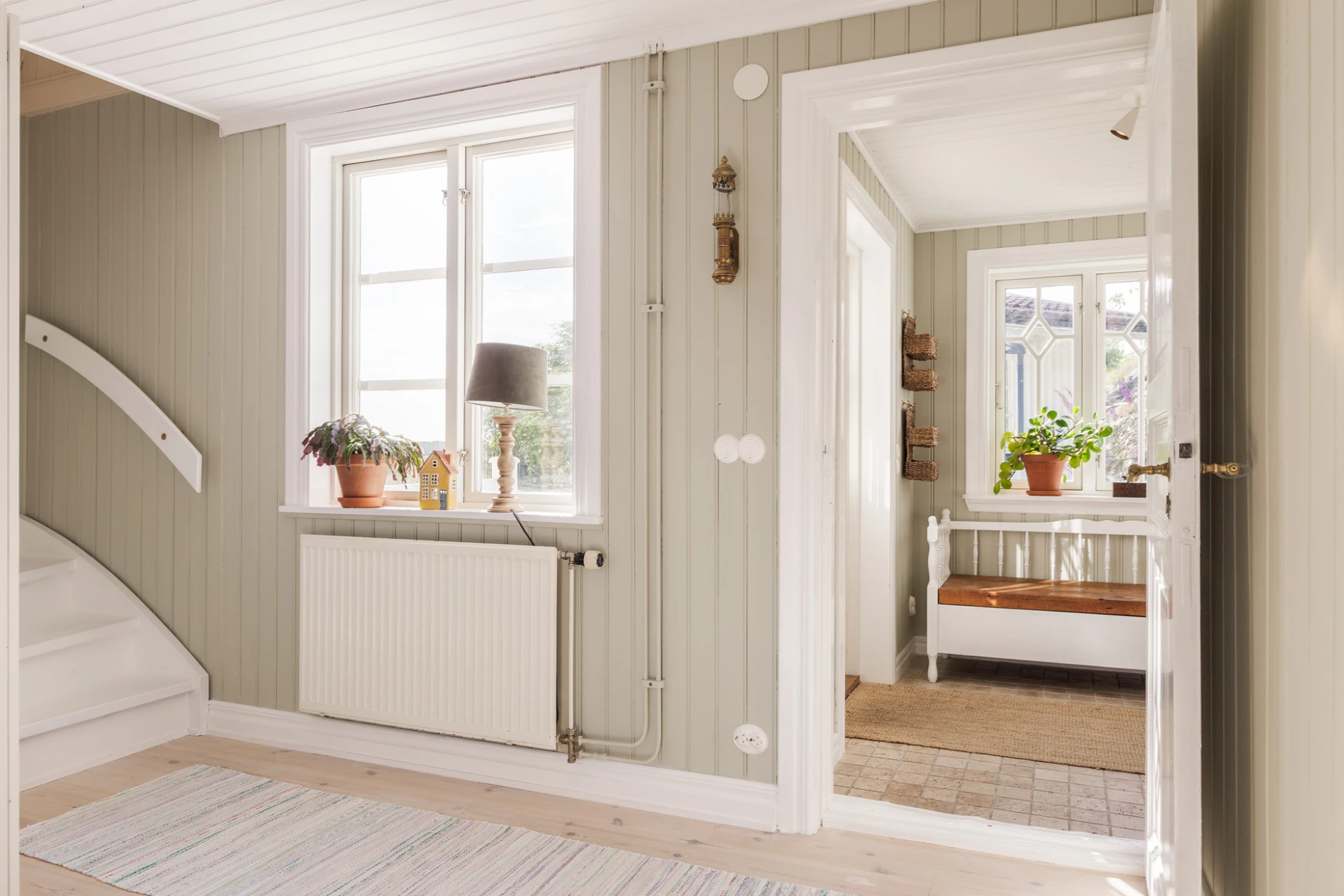 Vitpigmenterad furugolv och väggar i en ljusgrön nyans. Här finns förvaring i garderober. Trappa till övre plan och ingång till matsalsrum.