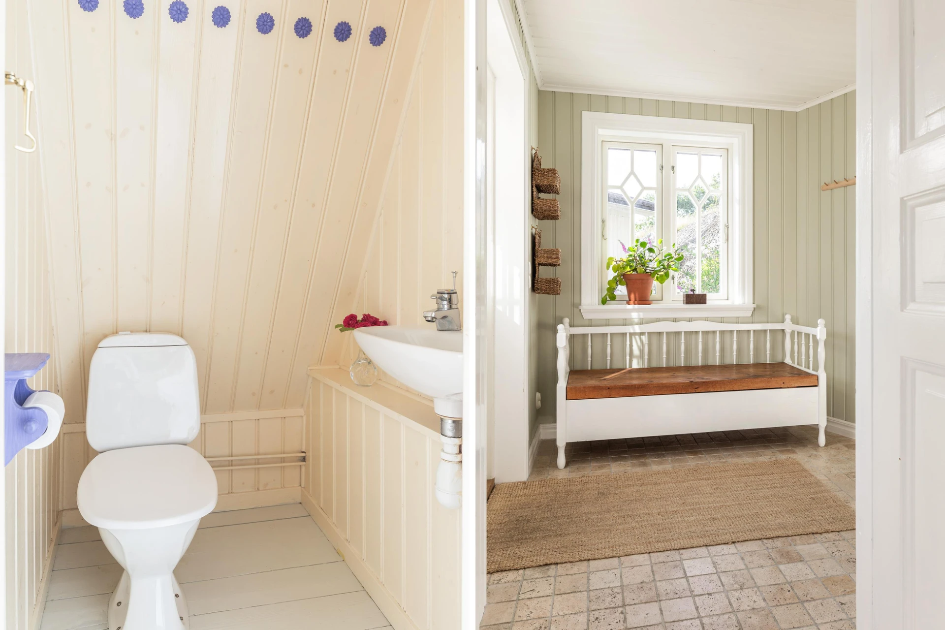 Plankgolv i gråvit nyans och väggar med ljus pärlspont. Utrustat med WC och handfat.