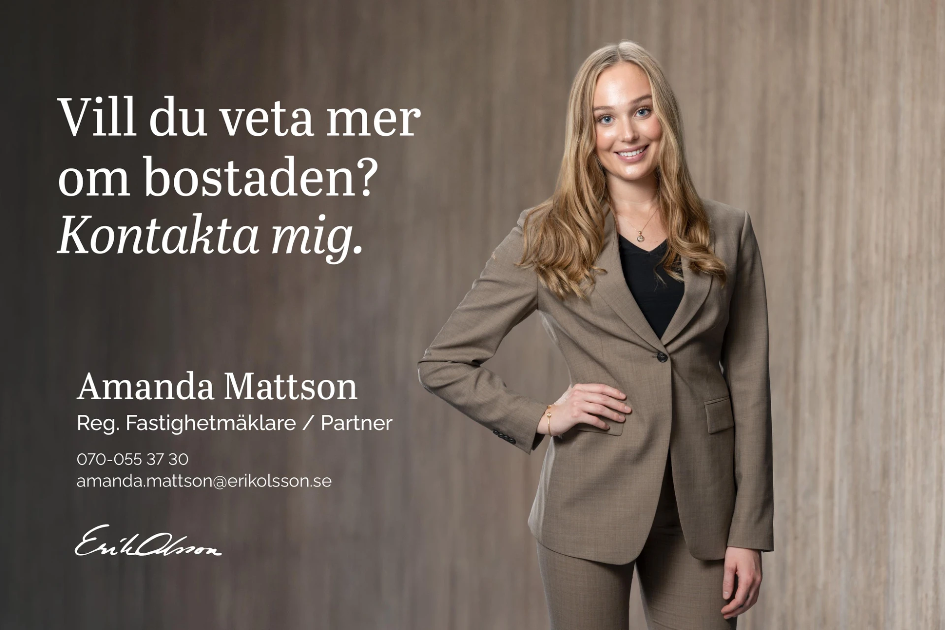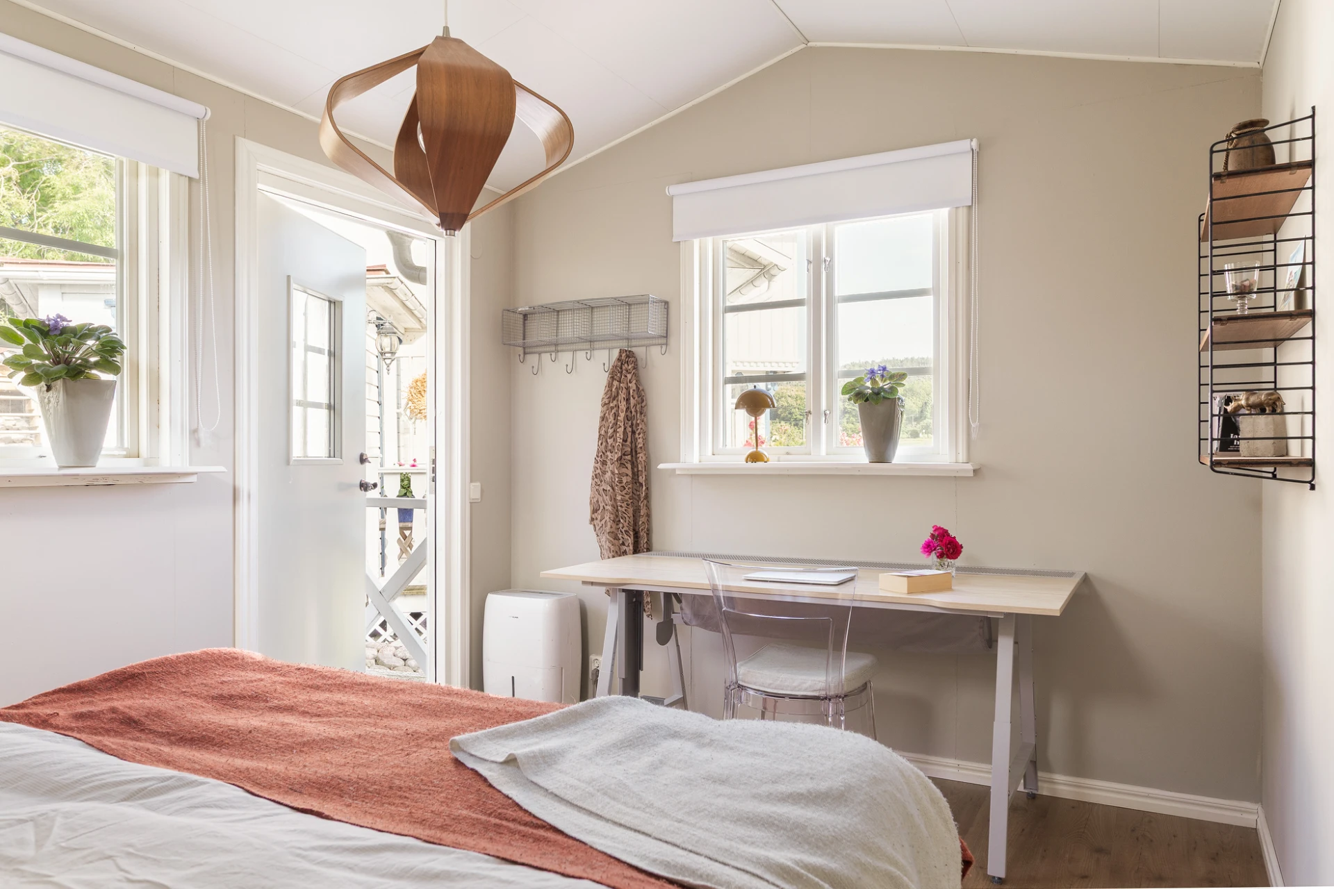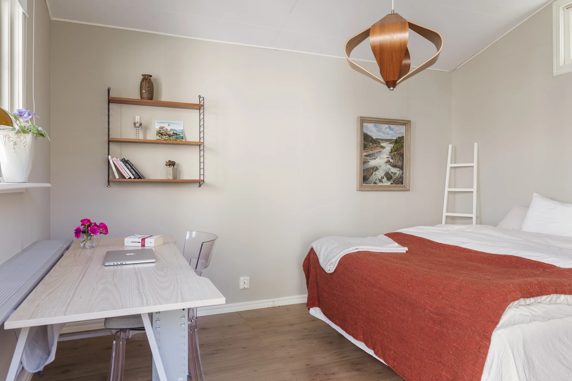 Golv i brunt material och väggar i grå/beige nyans. Här finns plats för dubbelsäng med tillhörande möblemang och arbetshörna.