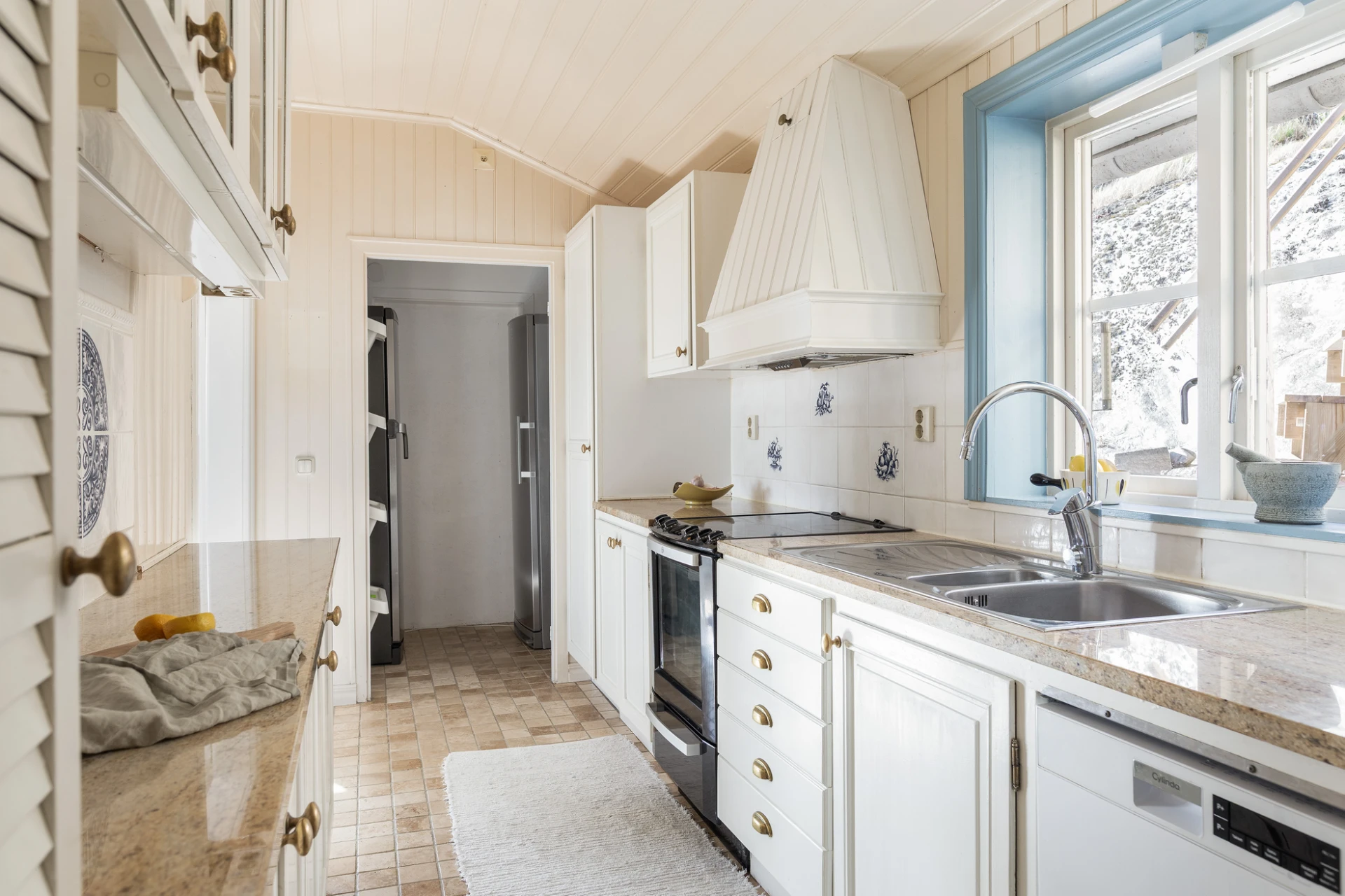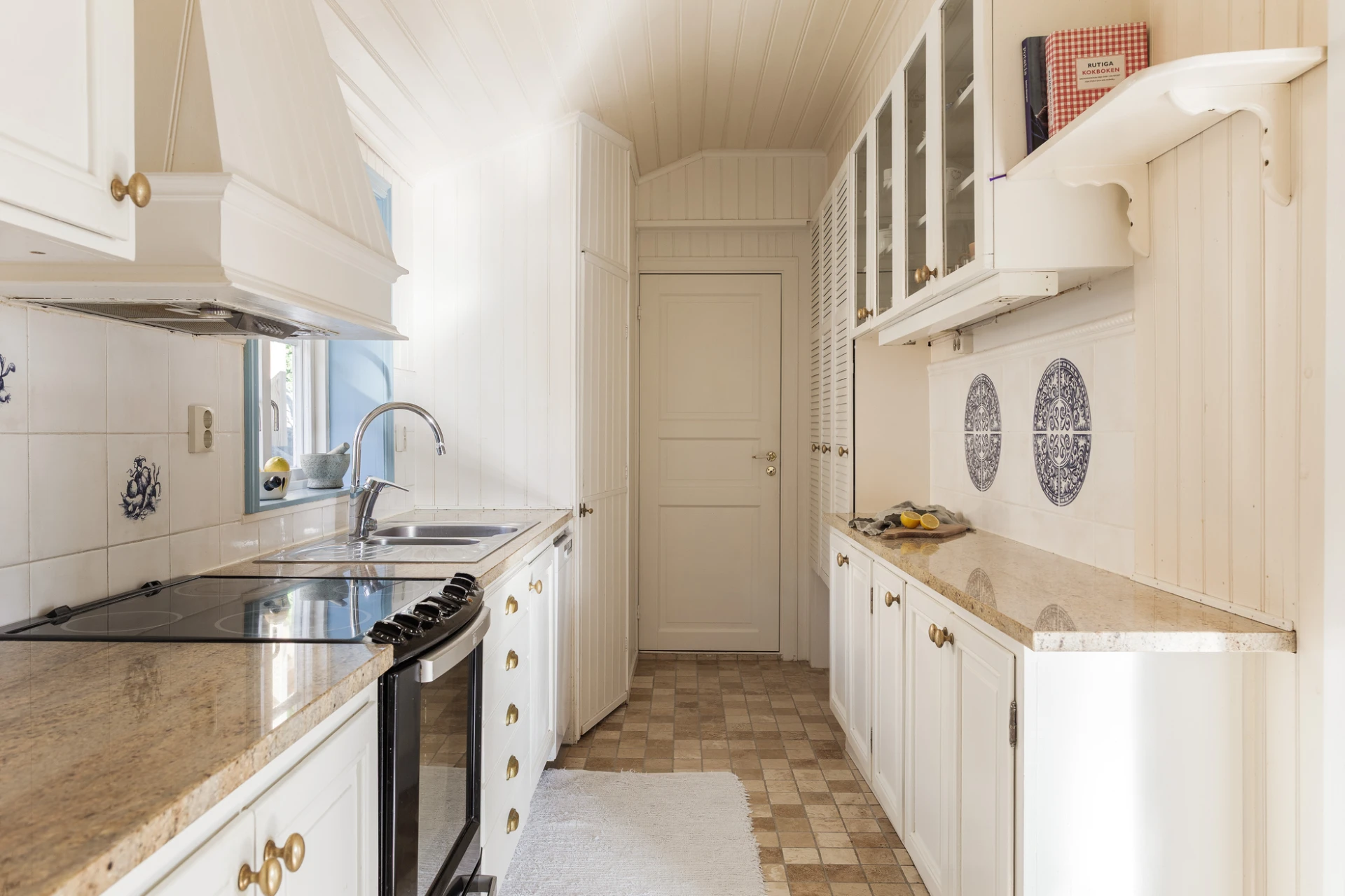 Klinkergolv i sandfärgad nyans väggar i vit pärlspont. Köksinredning i vitt och ovan arbetsbänken i granit sitter vitt kakel. Vitvarorna består av kyl och frys, diskmaskin, spis med ugn samt köksfläkt. Här finns förvaring i ett städskåp. Härifrån nås badrummet.