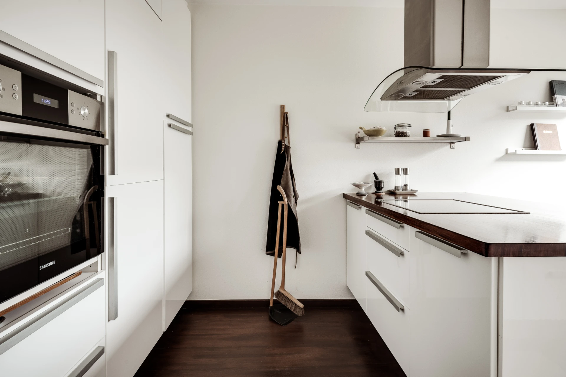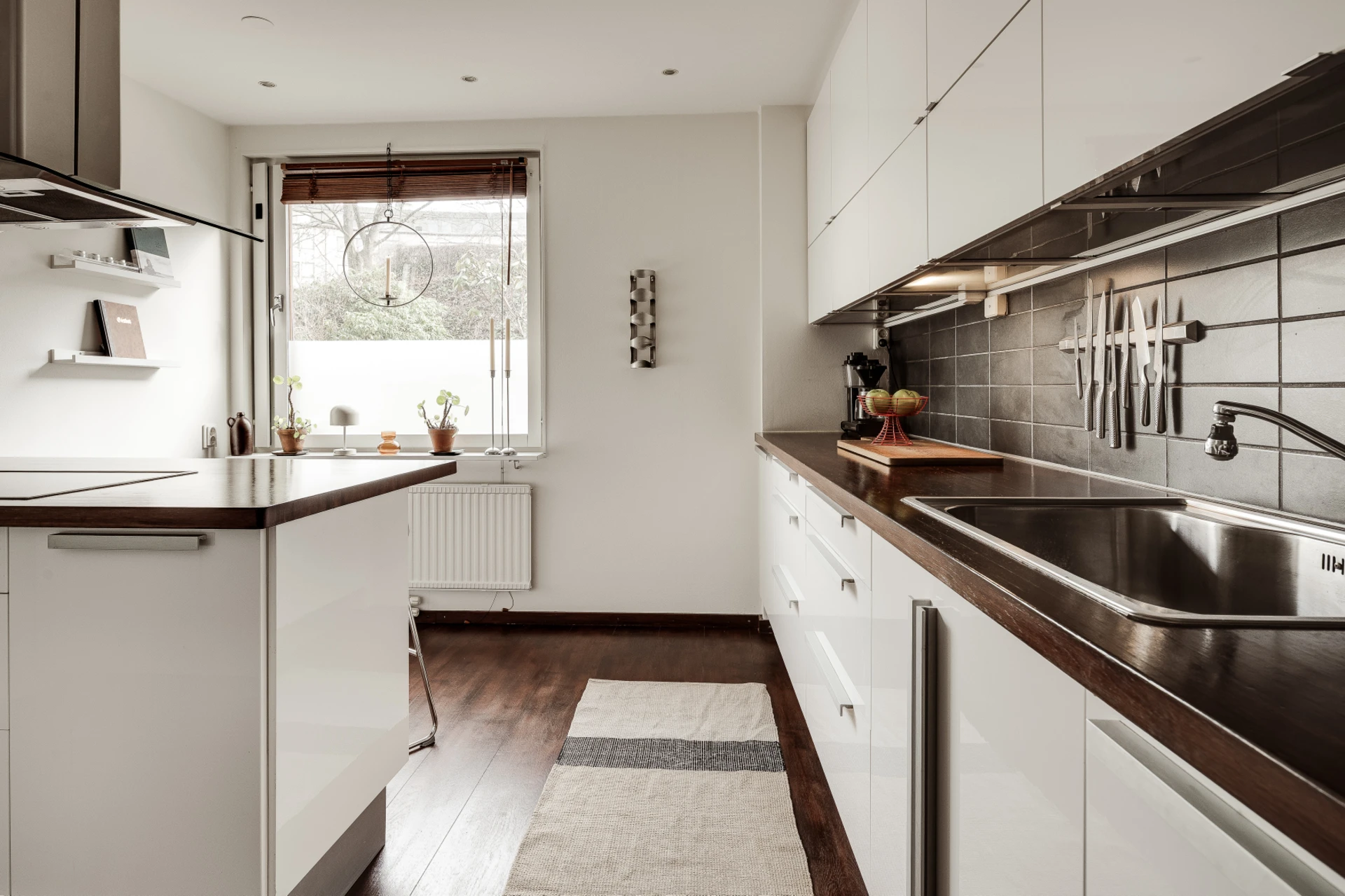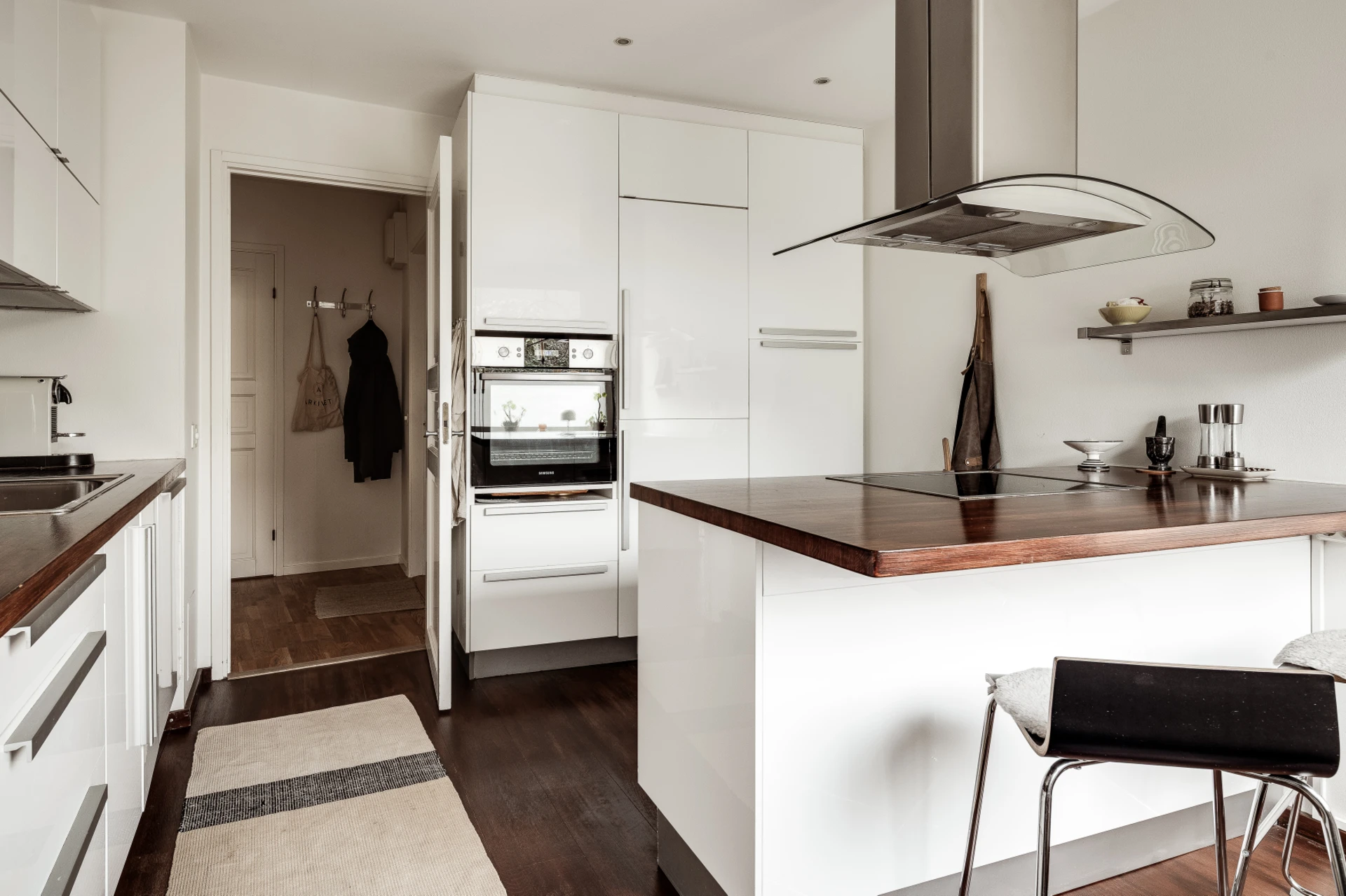 Parkettgolv och vita väggar. Köksinredning i vitt med en bänkskiva i laminat och ett grått kakel som stänkskydd. Köket är utrustat med spishäll, fläkt, inbyggd ugn, diskmaskin, kombinerad kyl och frys samt en köksö med plats för fyra personer.