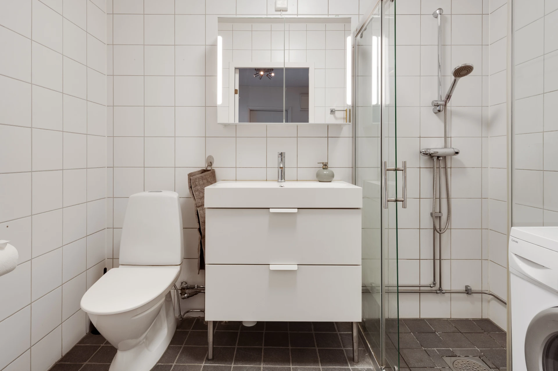 Klinkergolv och kaklade väggar. Badrummet är utrustat med WC, handfat med kommod, spegelskåp, dusch samt tvättmaskin.
