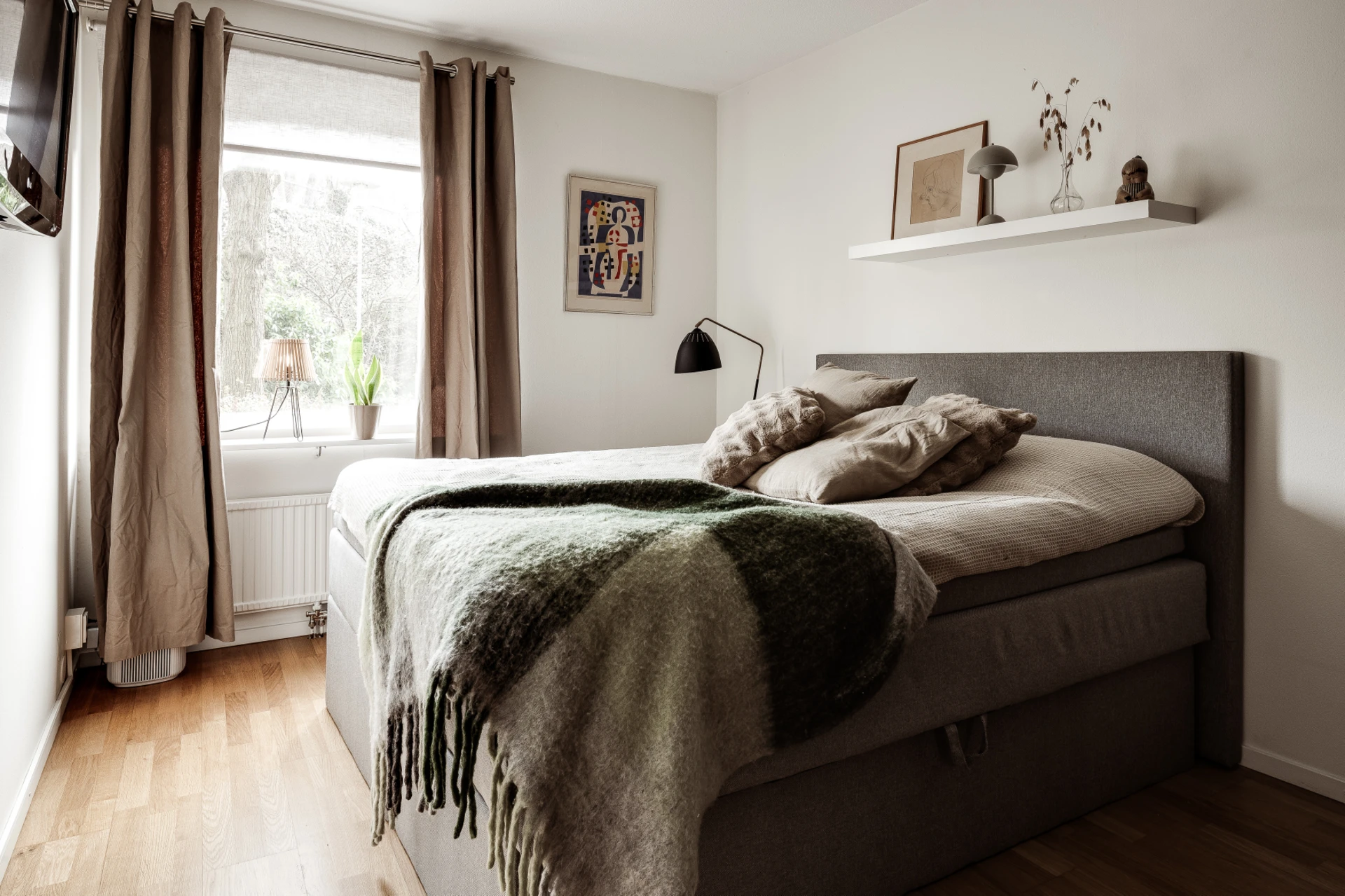 Parkettgolv och vita väggar. Här finns plats för en dubbelsäng med tillhörande möblemang samt förvaring i en skjutdörrsgarderob.