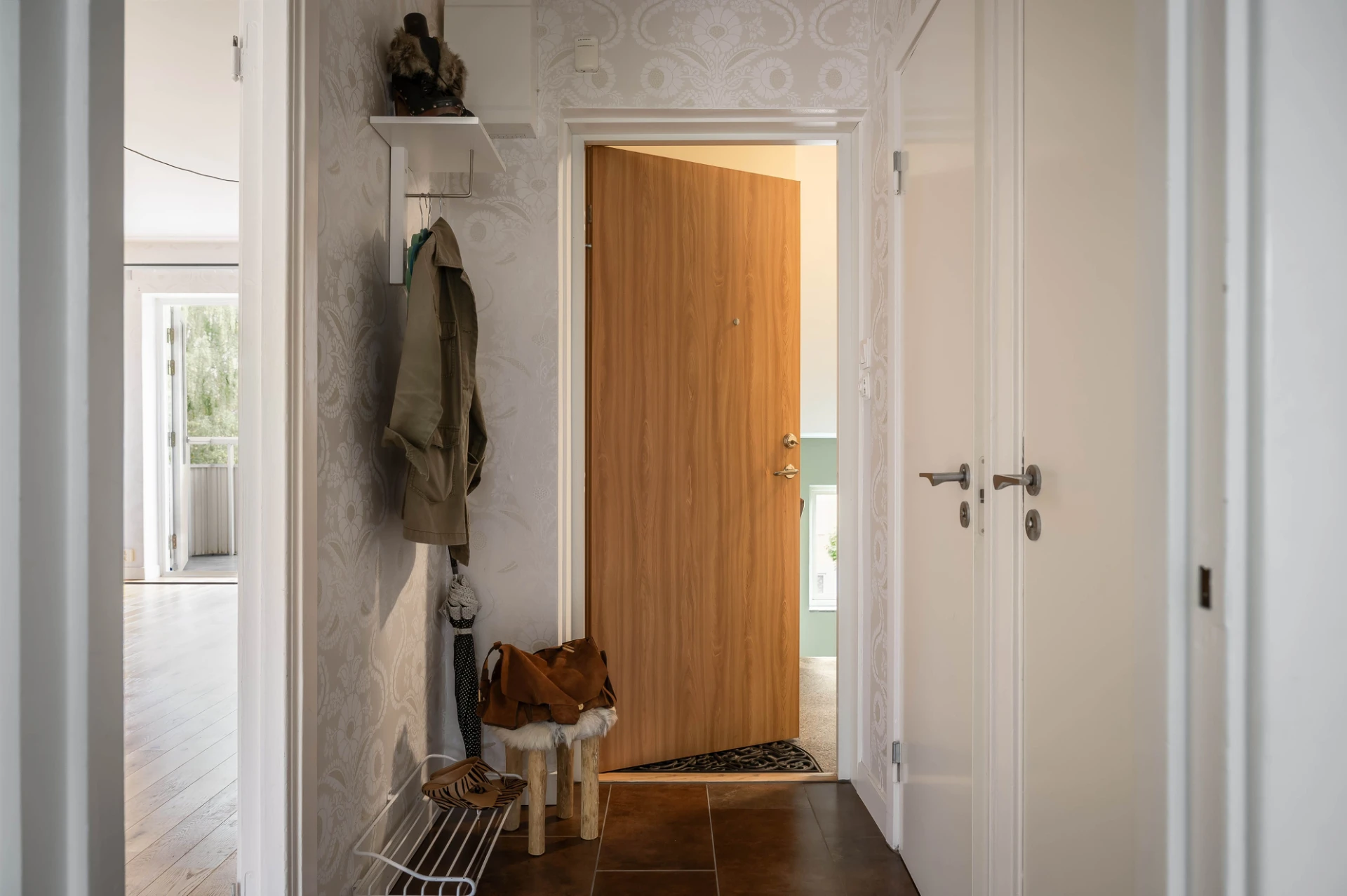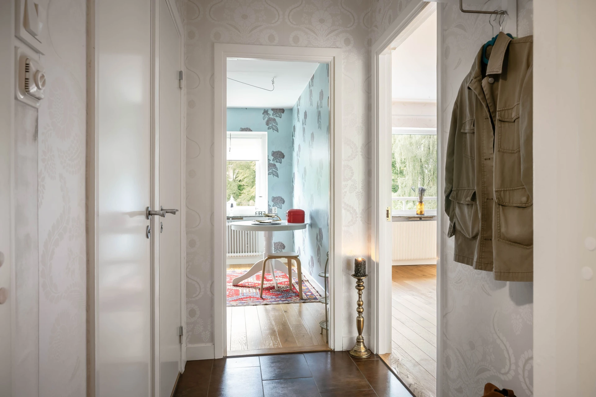 Hall i rostfärgat klinker med golvvärme och väggar tapetserade i samma mönster som vardagsrummet vilket skapar en enhetlig och harmonisk känsla. Här finns plats för avhängning av ytterkläder.