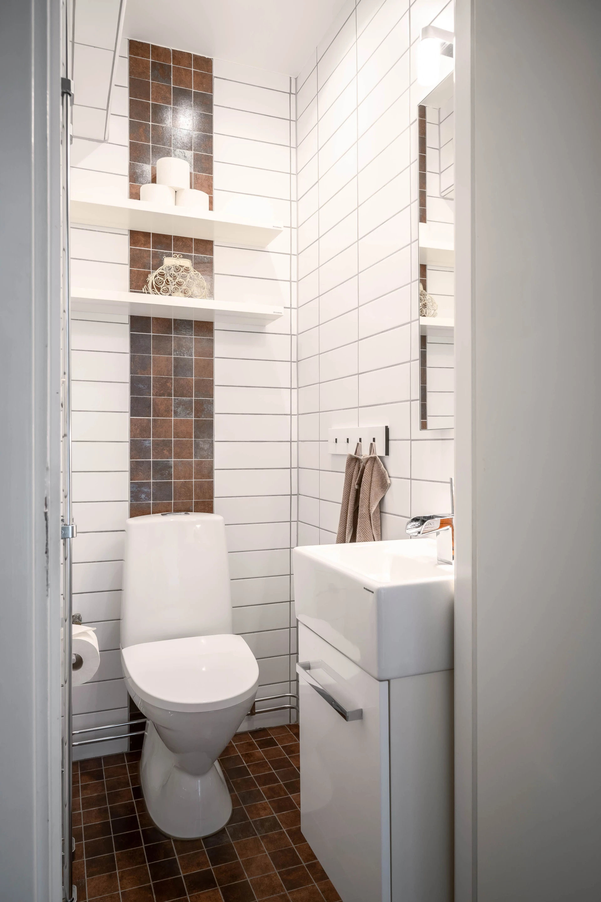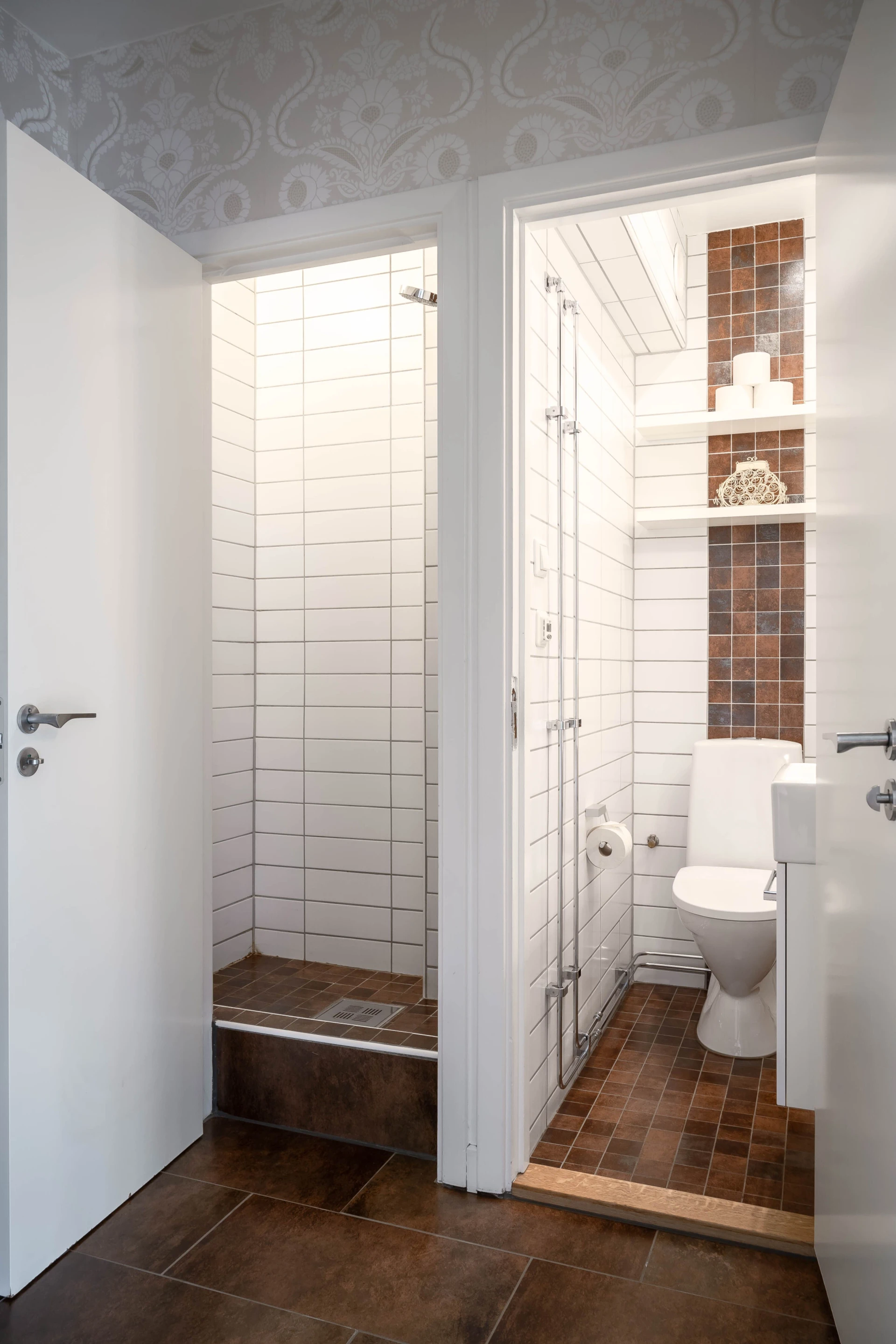 Totalrenoverat badrum (2017) med rostfärgat klinkergolv och behaglig golvvärme. Väggarna är klädda med vitt kakel och vid toaletten finns en stapel i samma ton som golvet för en stilren helhet. Utrustningen består av dusch, handfat med vit kommod, wc, spegel med hyllor samt en exklusiv blandare. Spotlights i taket ger ett modernt och elegant ljus.