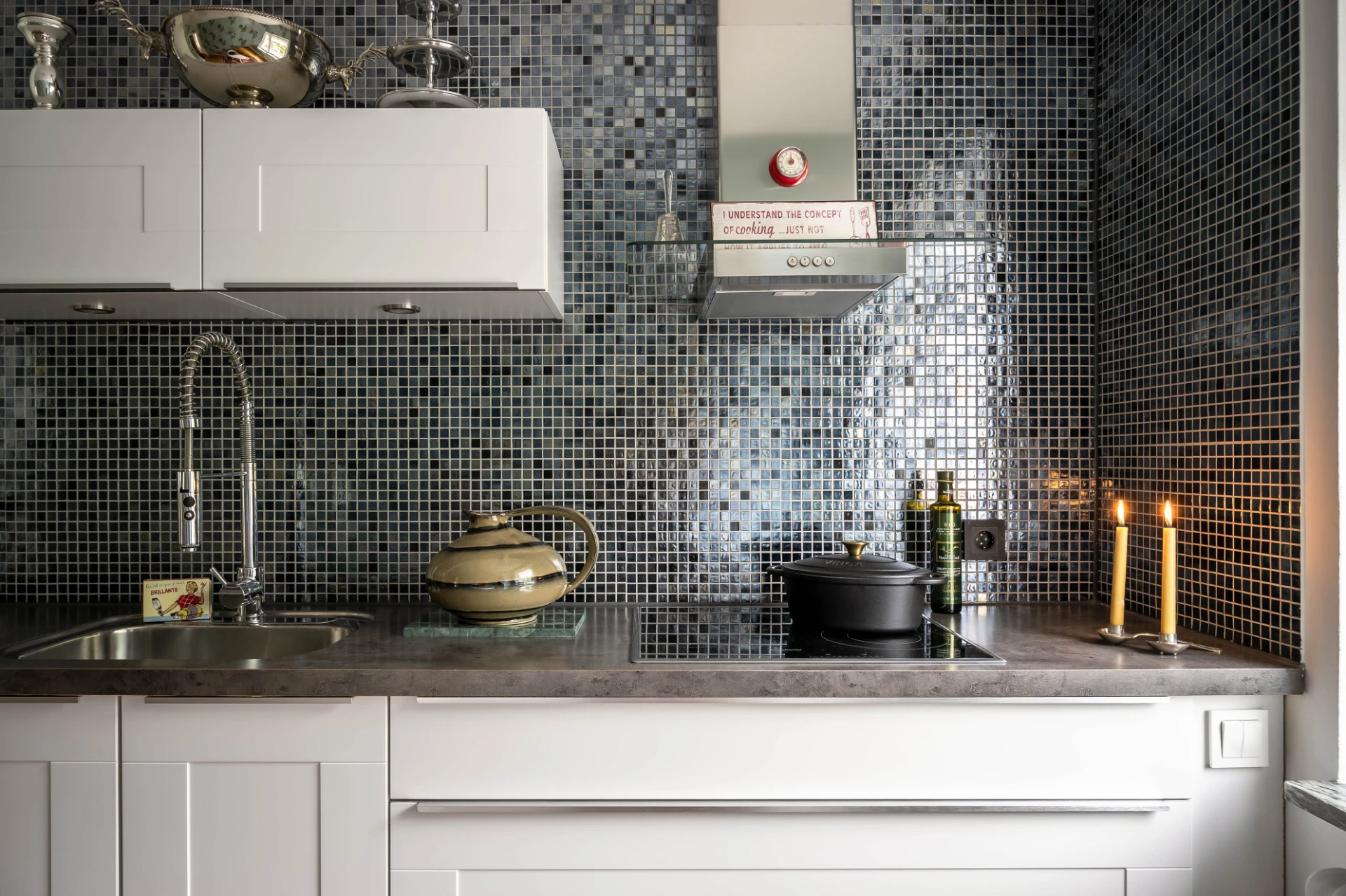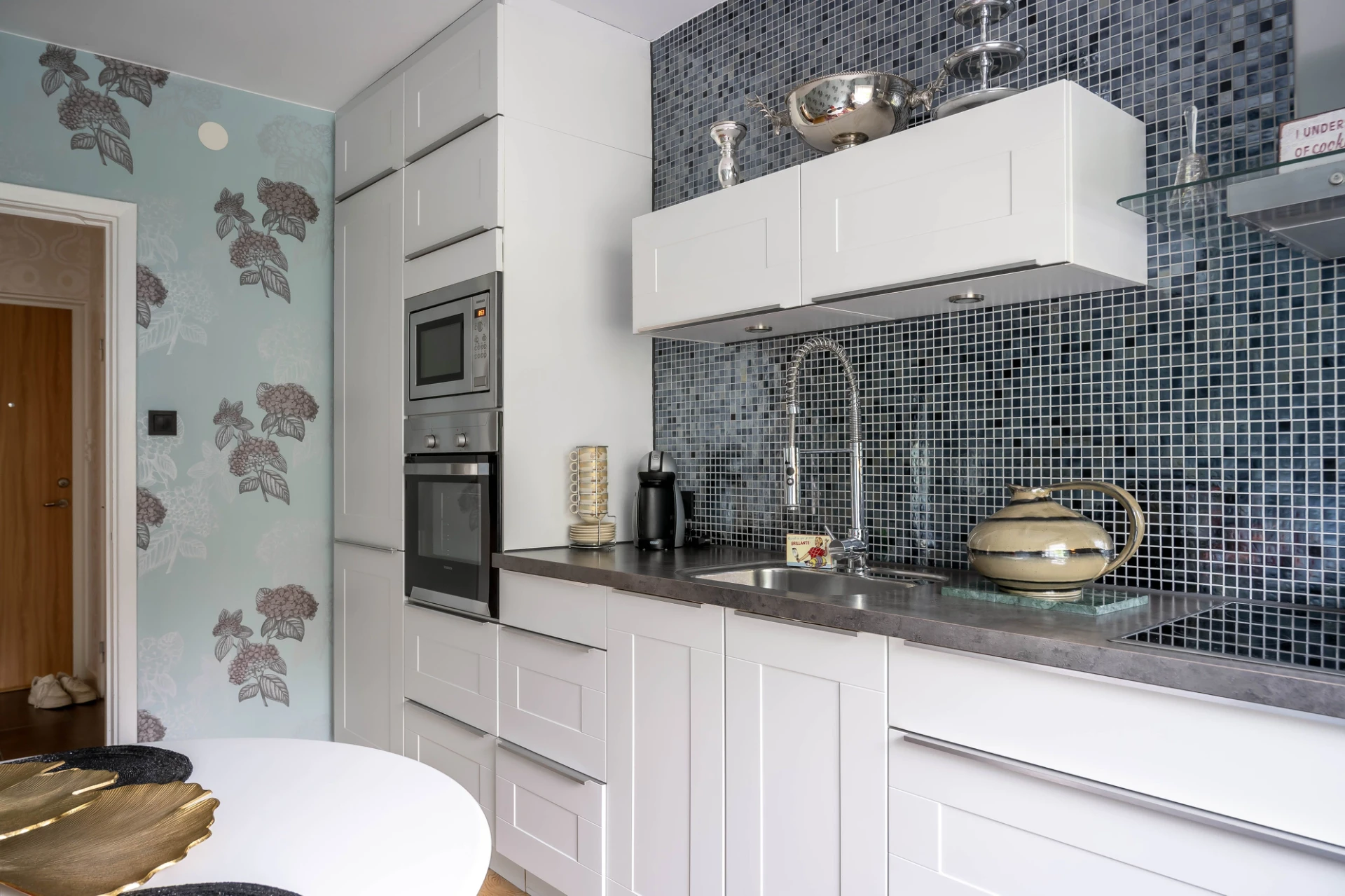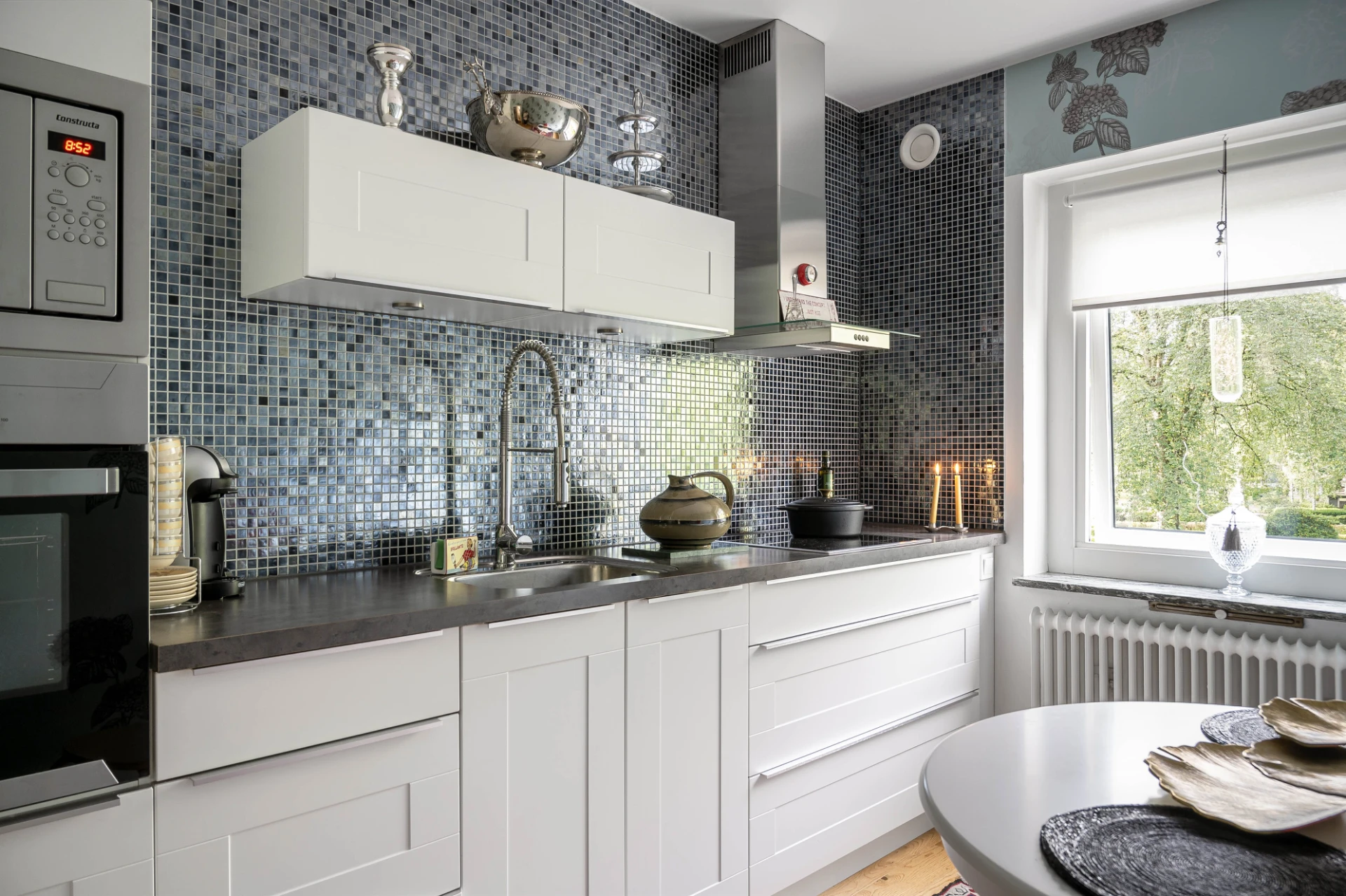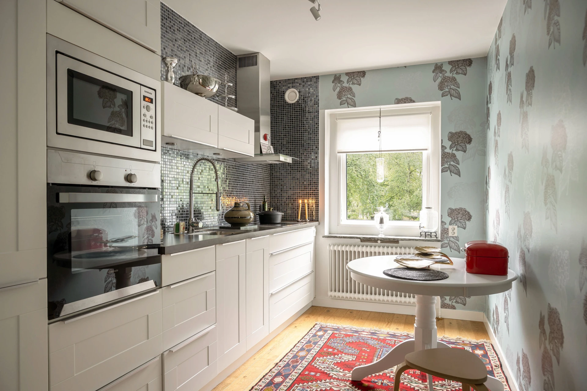 Snyggt och modernt kök med exklusiva materialval. Här finns plats för ett matbord för 2–4 personer. Köksinredningen från Kvik har vita luckor och är utrustad med inbyggnadsugn (varmluft) och mikro i rostfritt stål, placerade i bekväm arbetshöjd. Här finns även integrerad kyl/frys, spishäll samt fläkt i rostfritt. Ovanför bänkskivan sitter ett elegant kristallmosaikkakel, kompletterat med en designblandare. Väggarna är klädda i en turkos tapet från Cole & Son och på golvet ligger vackra ekplank.