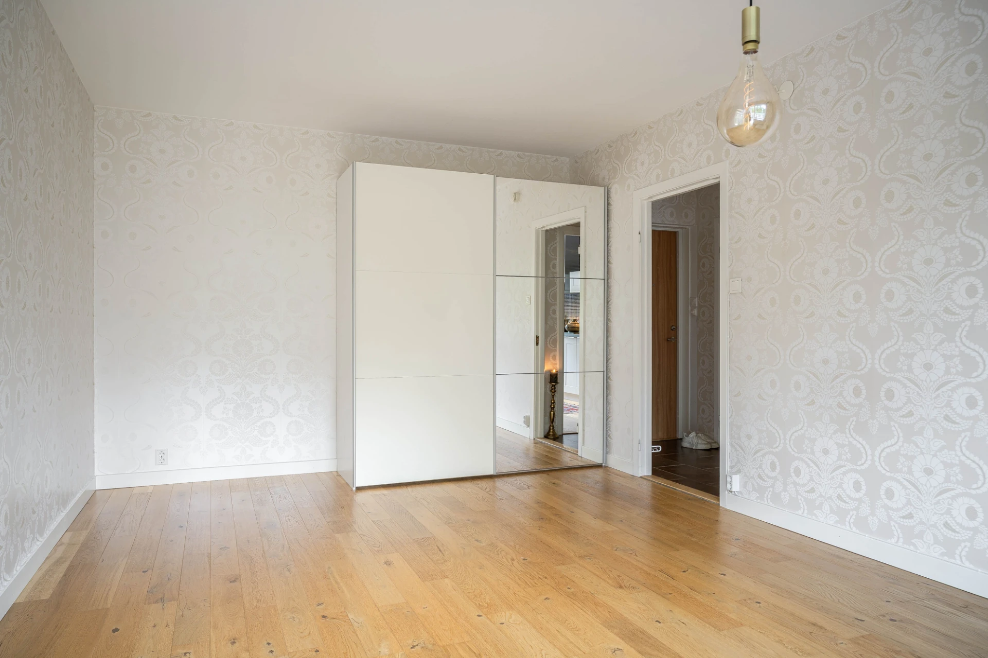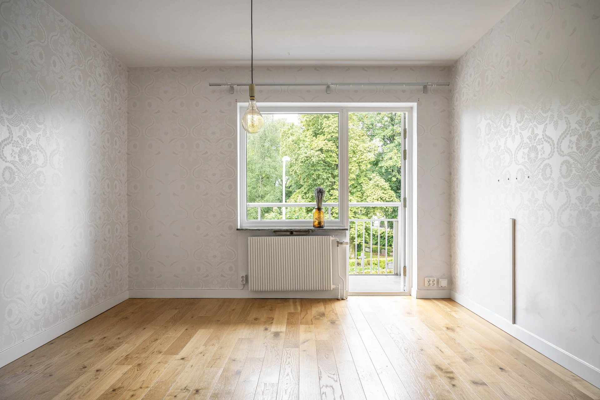 Ljust och rymligt vardagsrum med stora fönsterpartier, smakfulla materialval och plats för både soffgrupp och matsalsmöbel – en elegant samlingspunkt för både vardag och fest. Finns en garderob.