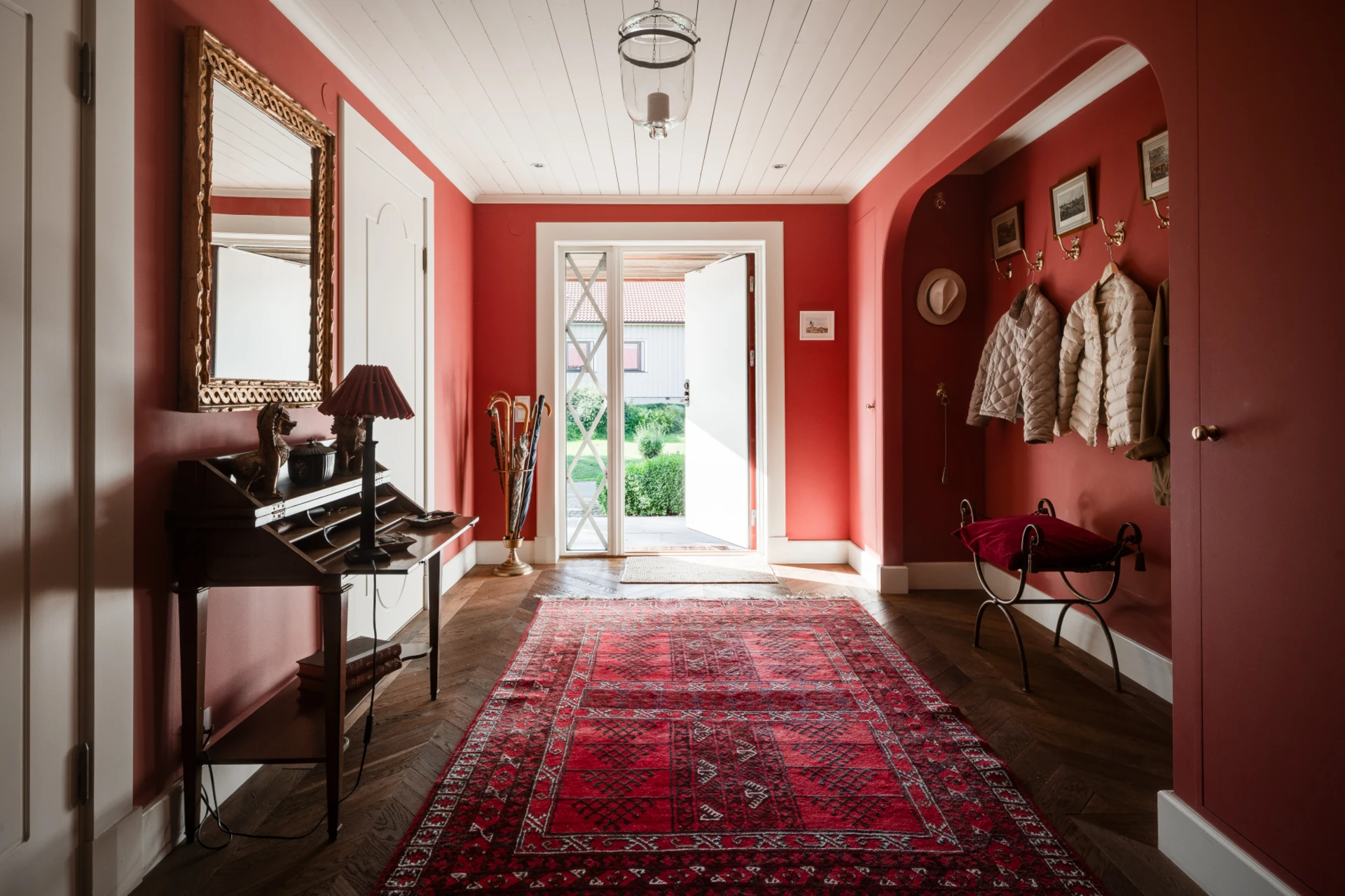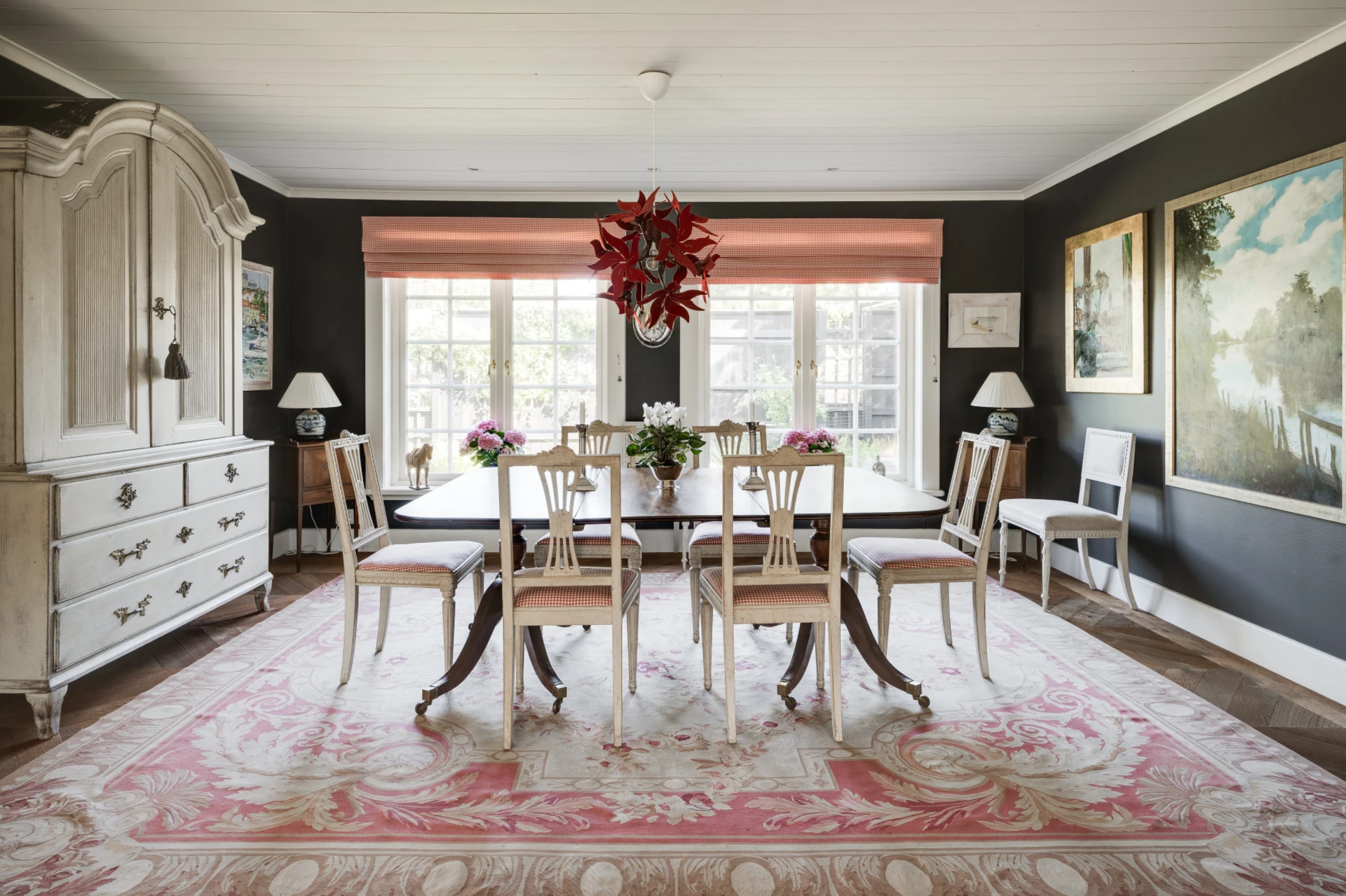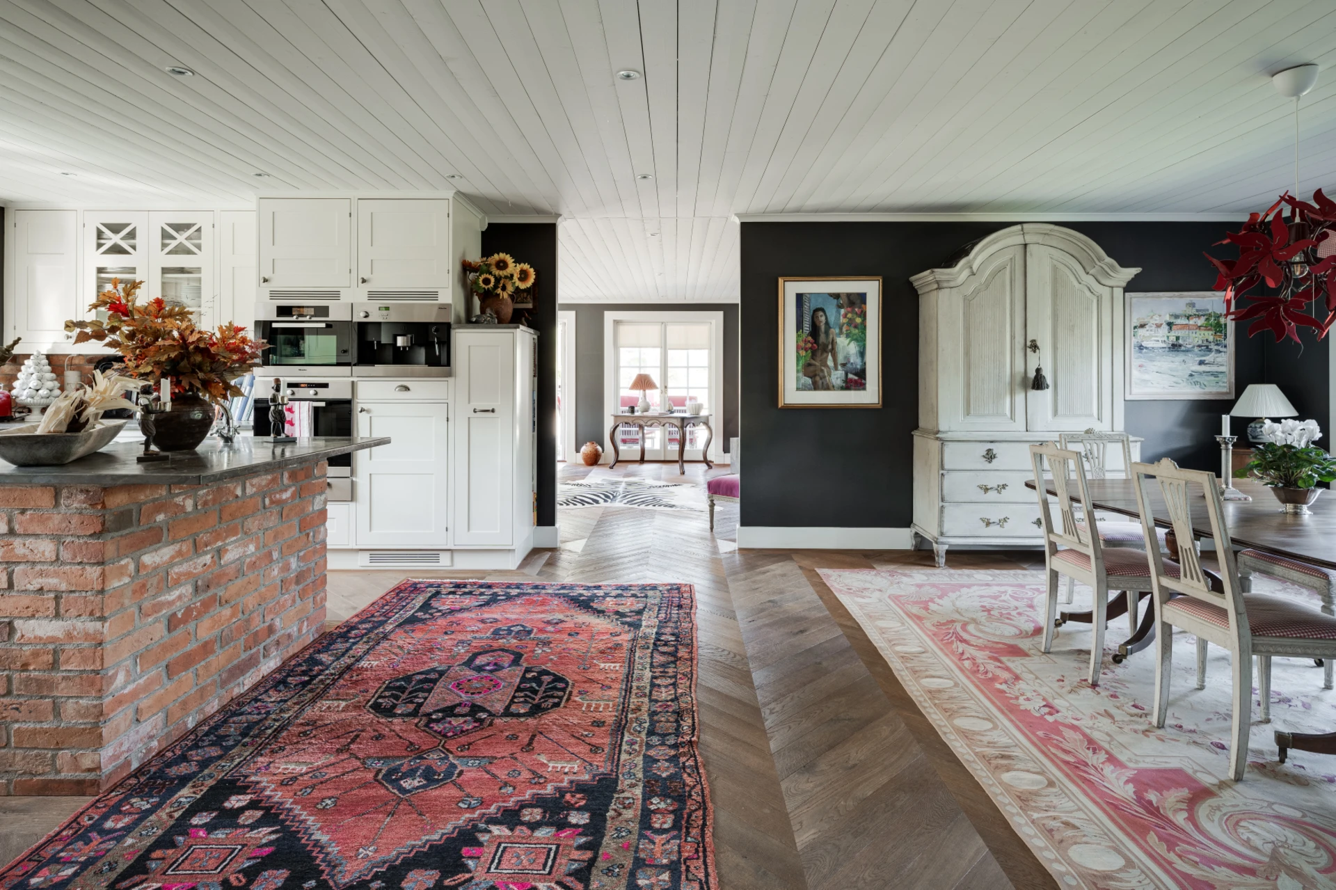 Massivt ekgolv med golvvärme möter målade väggar. Stor matsal med generösa fönsterpartier. Här finns plats för minst 12–14 sittande gäster.