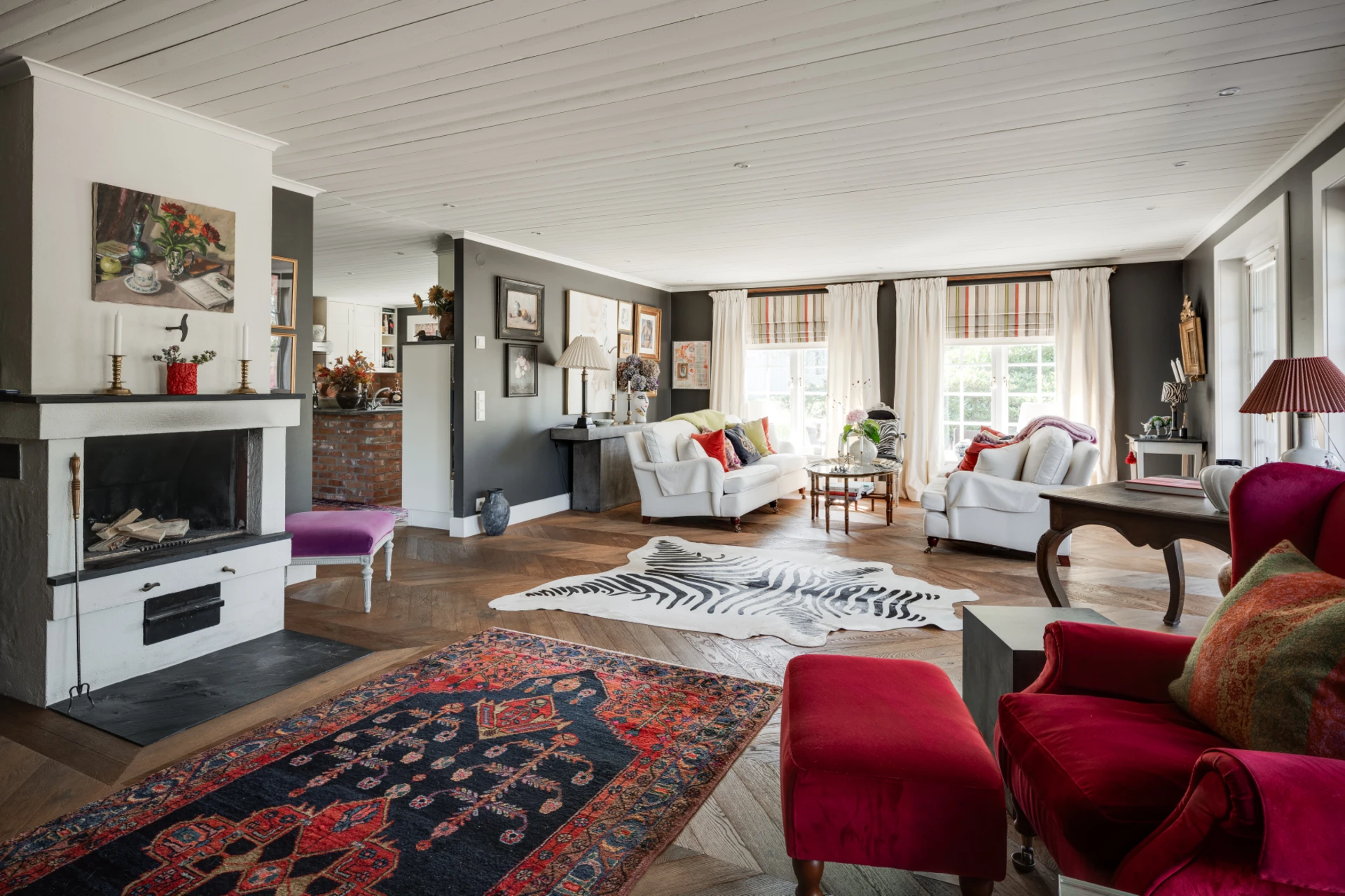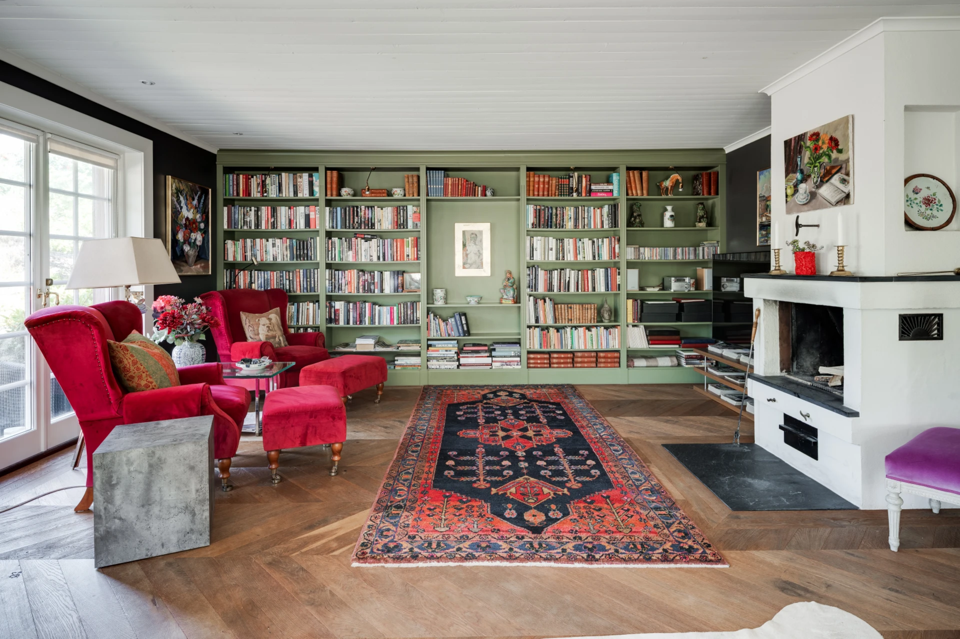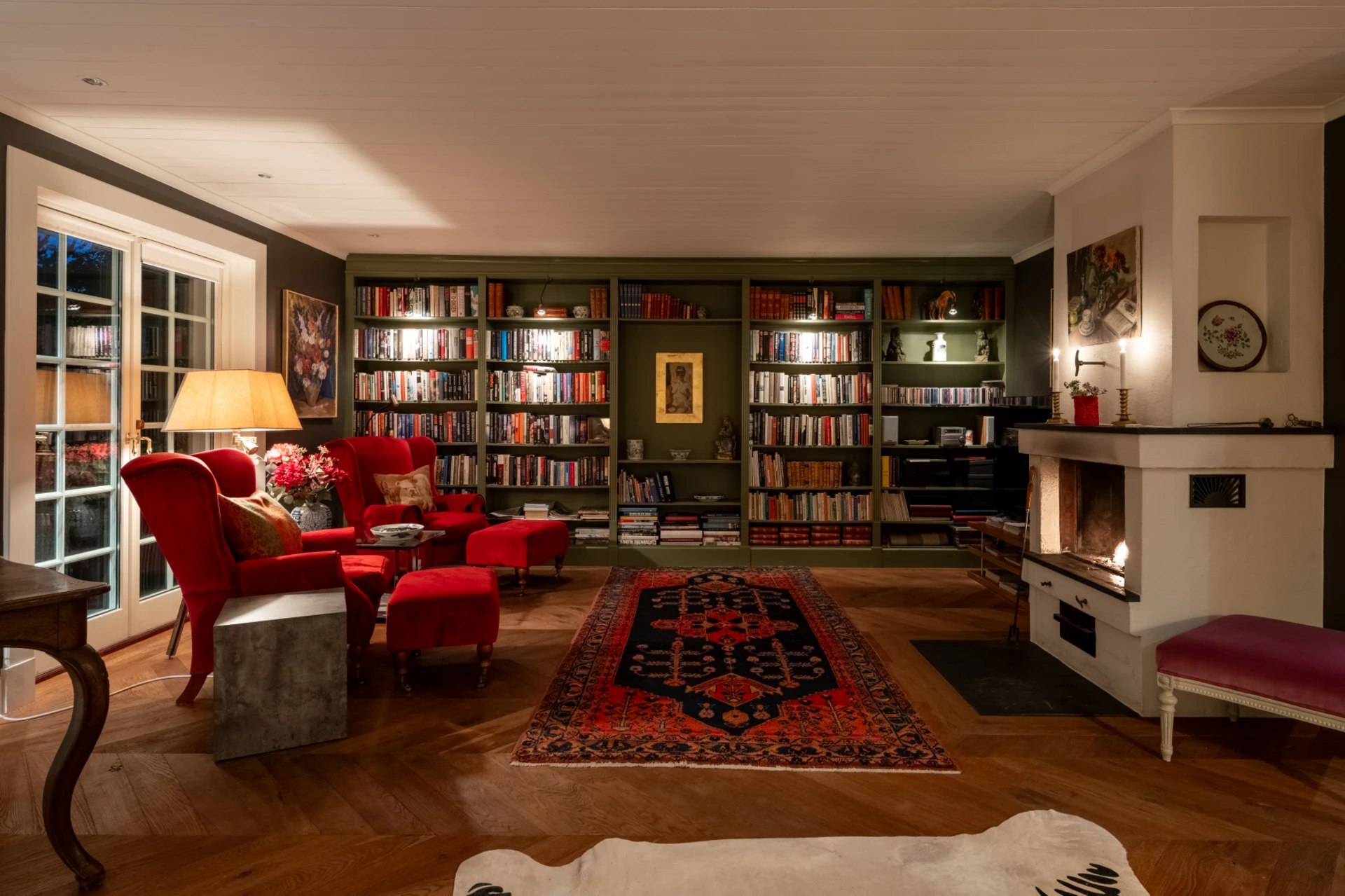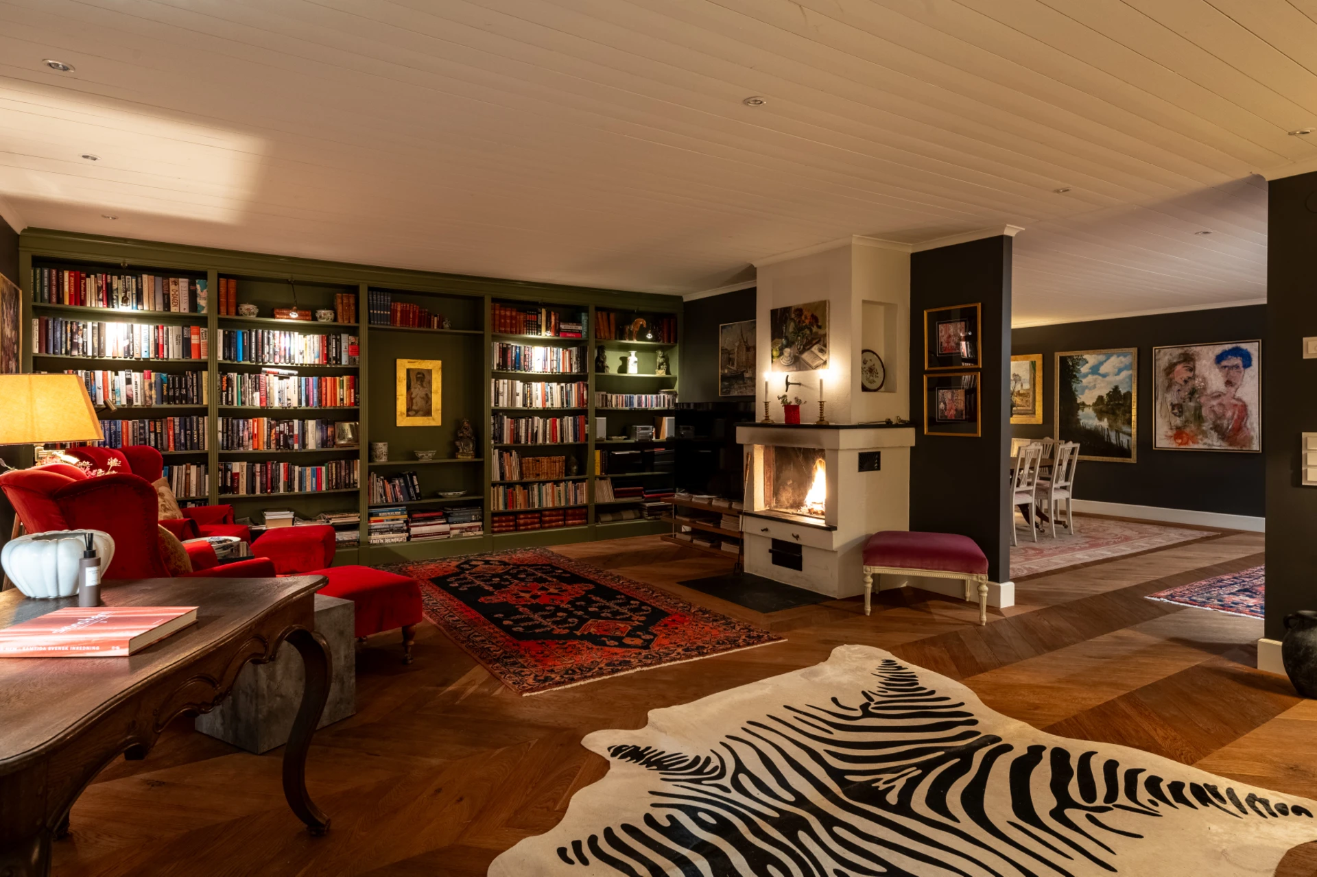 Massivt ekgolv möter målade väggar. Tre rejäla pardörrar leder vidare ut på terrassen. Rummets karaktär präglas av ljusinsläppet och den stora platsbyggda bokhyllan som sträcker sig hela fem meter. På den lite kulna tiden på året är det mysigt att krypa upp vid öppna spisen, känna värmen i lågornas sken.