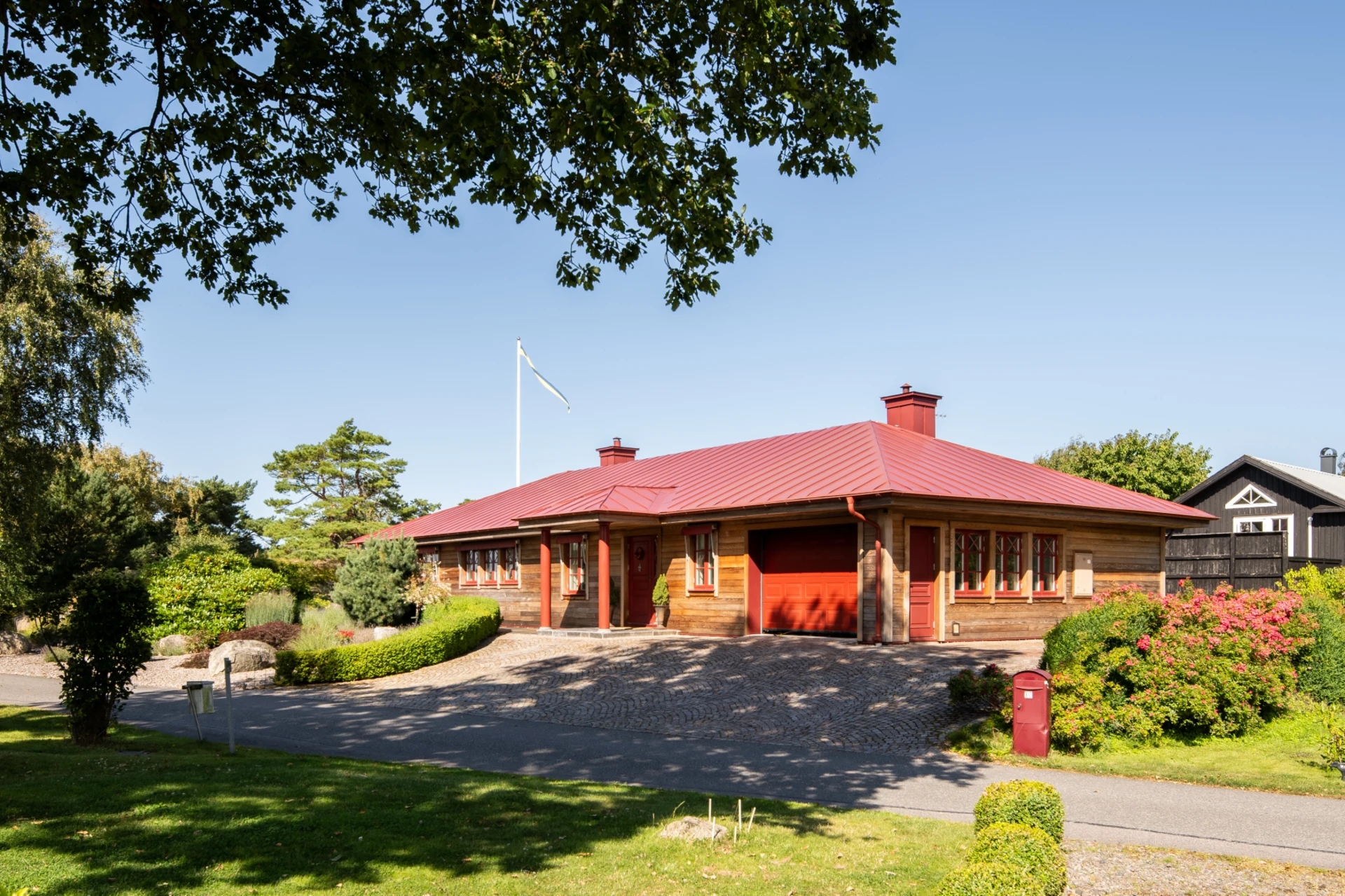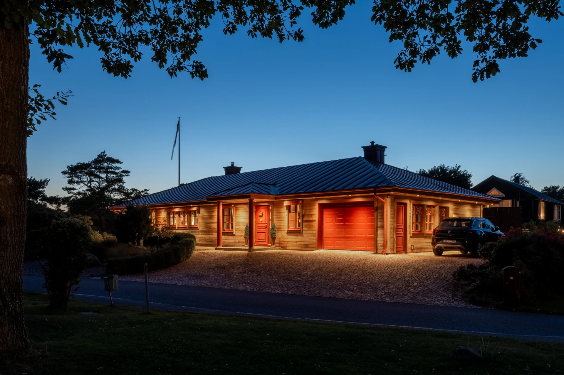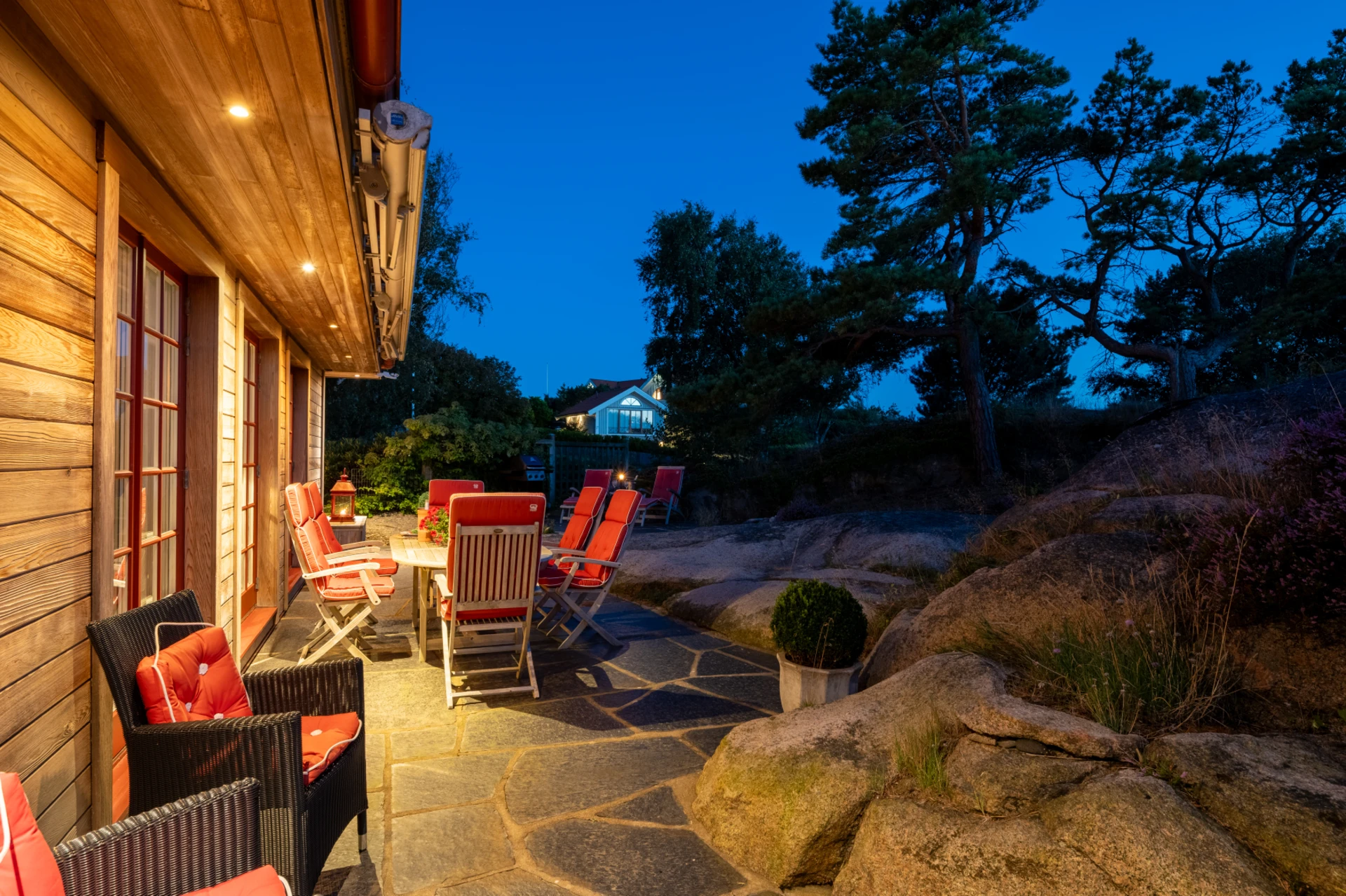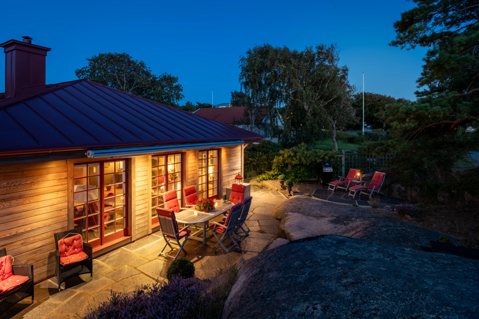Massivt ekgolv möter målade väggar. Tre rejäla pardörrar leder vidare ut på terrassen. Rummets karaktär präglas av ljusinsläppet och den stora platsbyggda bokhyllan som sträcker sig hela fem meter. På den lite kulna tiden på året är det mysigt att krypa upp vid öppna spisen, känna värmen i lågornas sken.