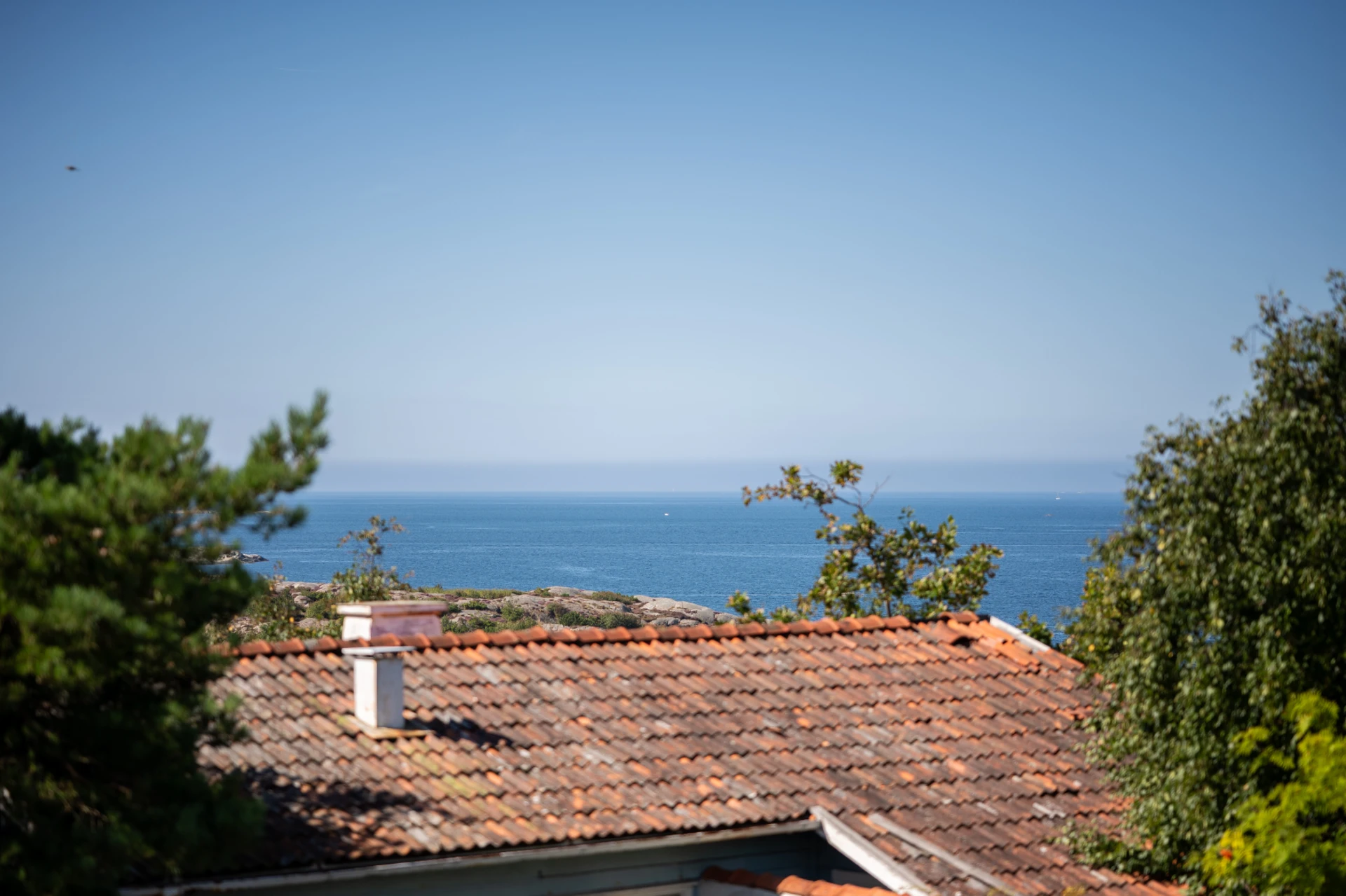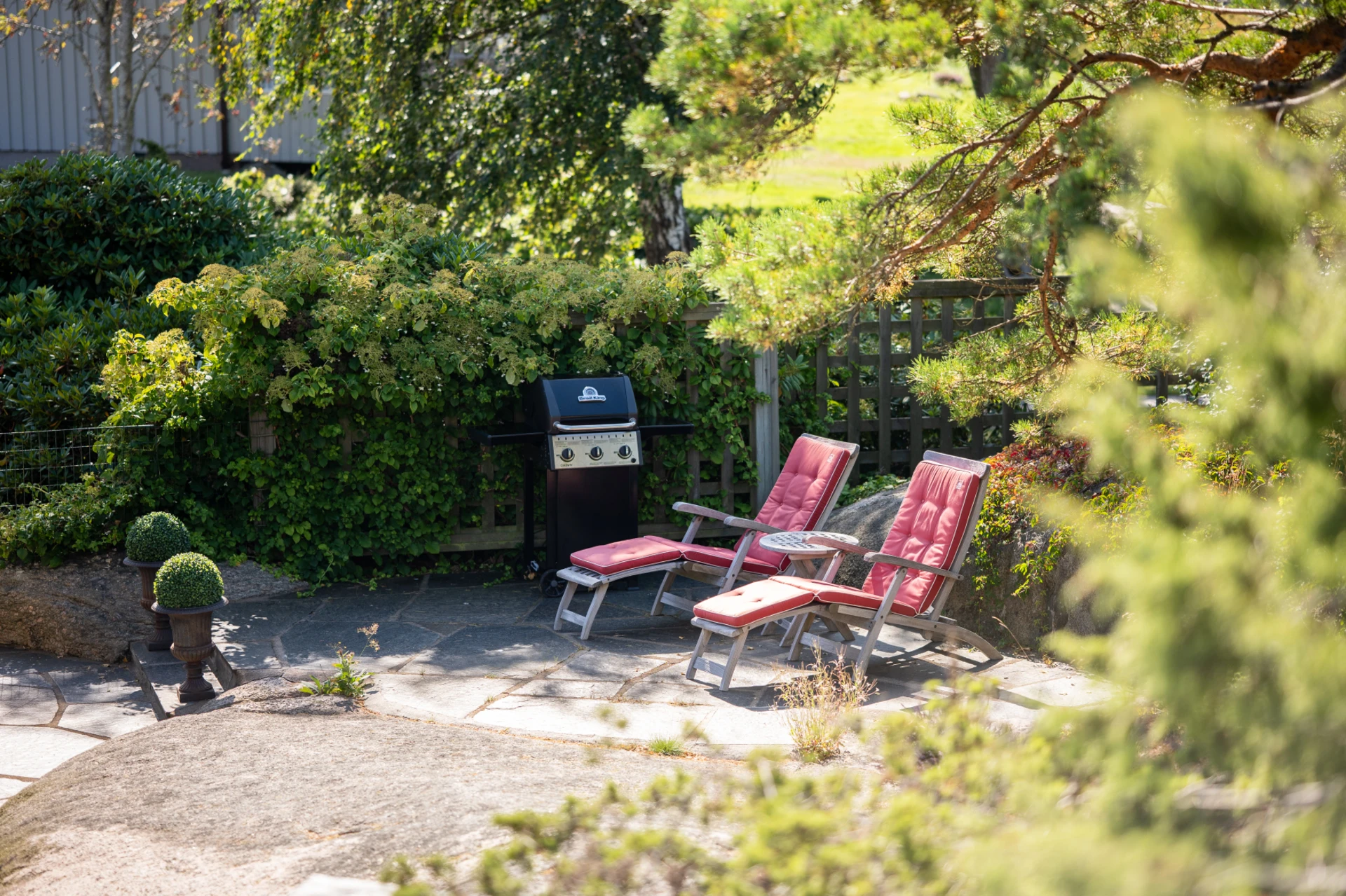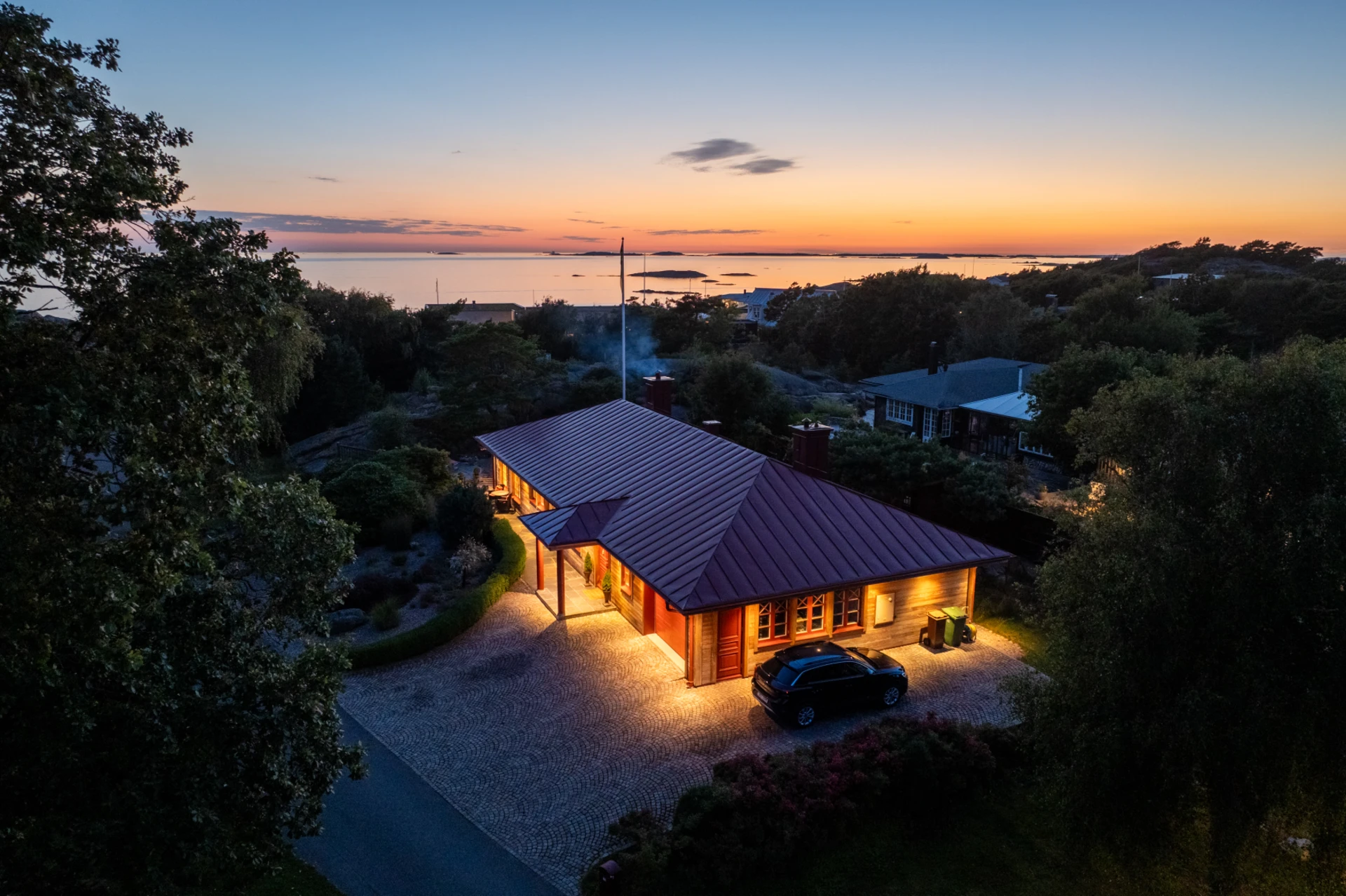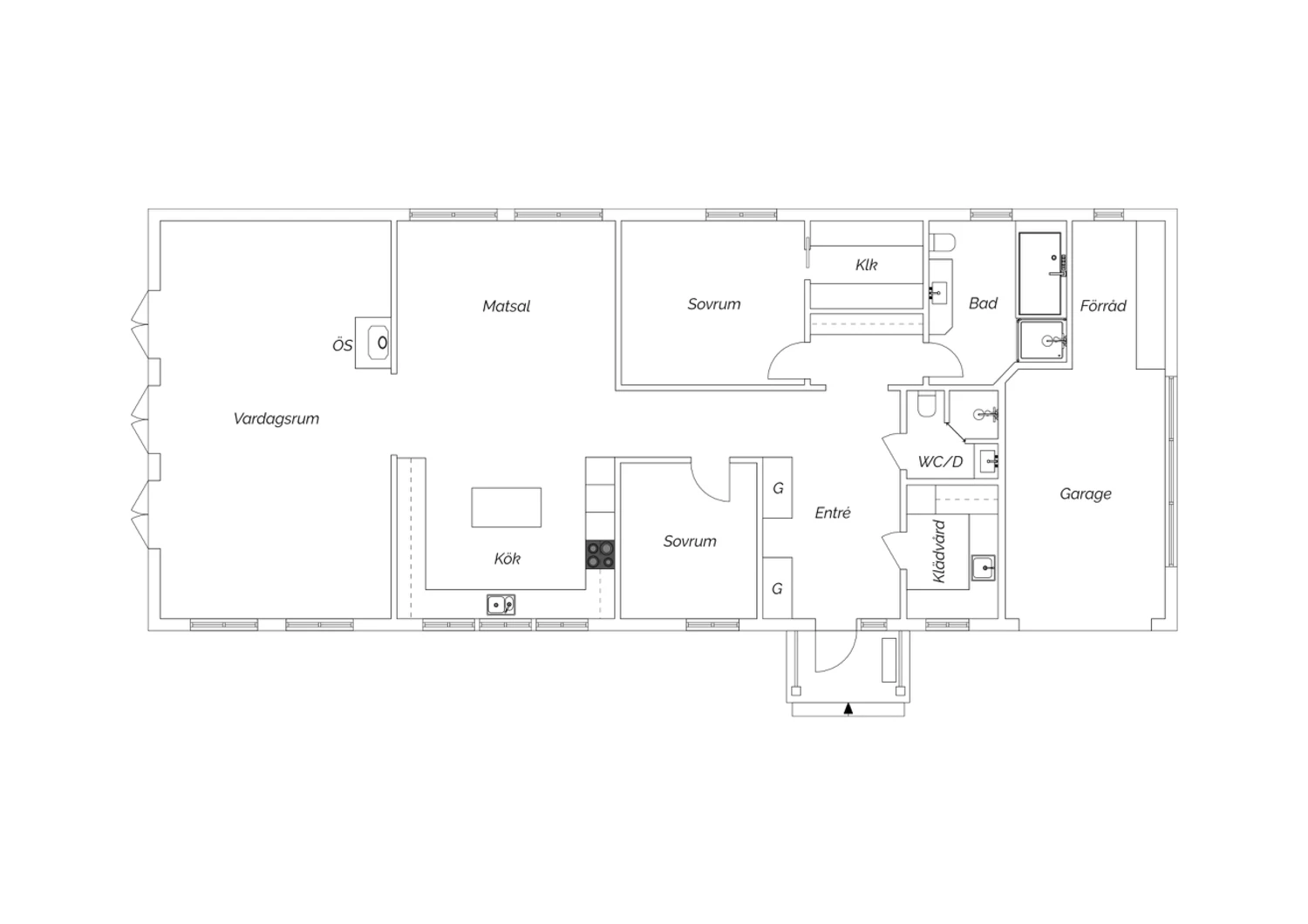 Massivt ekgolv möter målade väggar. Tre rejäla pardörrar leder vidare ut på terrassen. Rummets karaktär präglas av ljusinsläppet och den stora platsbyggda bokhyllan som sträcker sig hela fem meter. På den lite kulna tiden på året är det mysigt att krypa upp vid öppna spisen, känna värmen i lågornas sken.